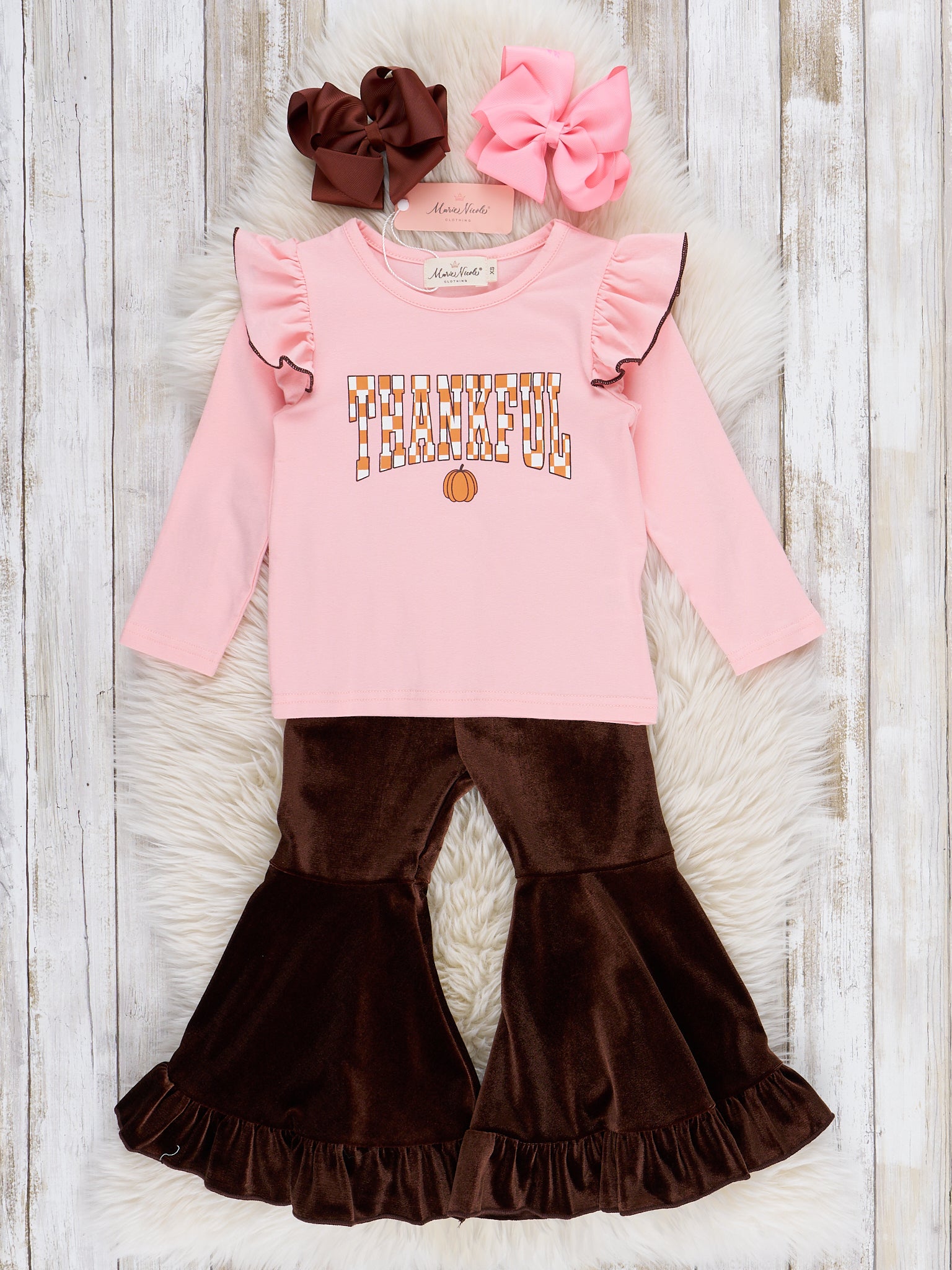 The Thankful Moments Ruffle Bell Bottom Outfit by Marie Nicole Clothing features a pink ruffle top with a decorative "thankful" motif and playful pumpkin accent, paired with rich brown flared pants for a cozy autumn look. This outfit is perfect for Thanksgiving gatherings, family photos, and celebrating fall in style and comfort.