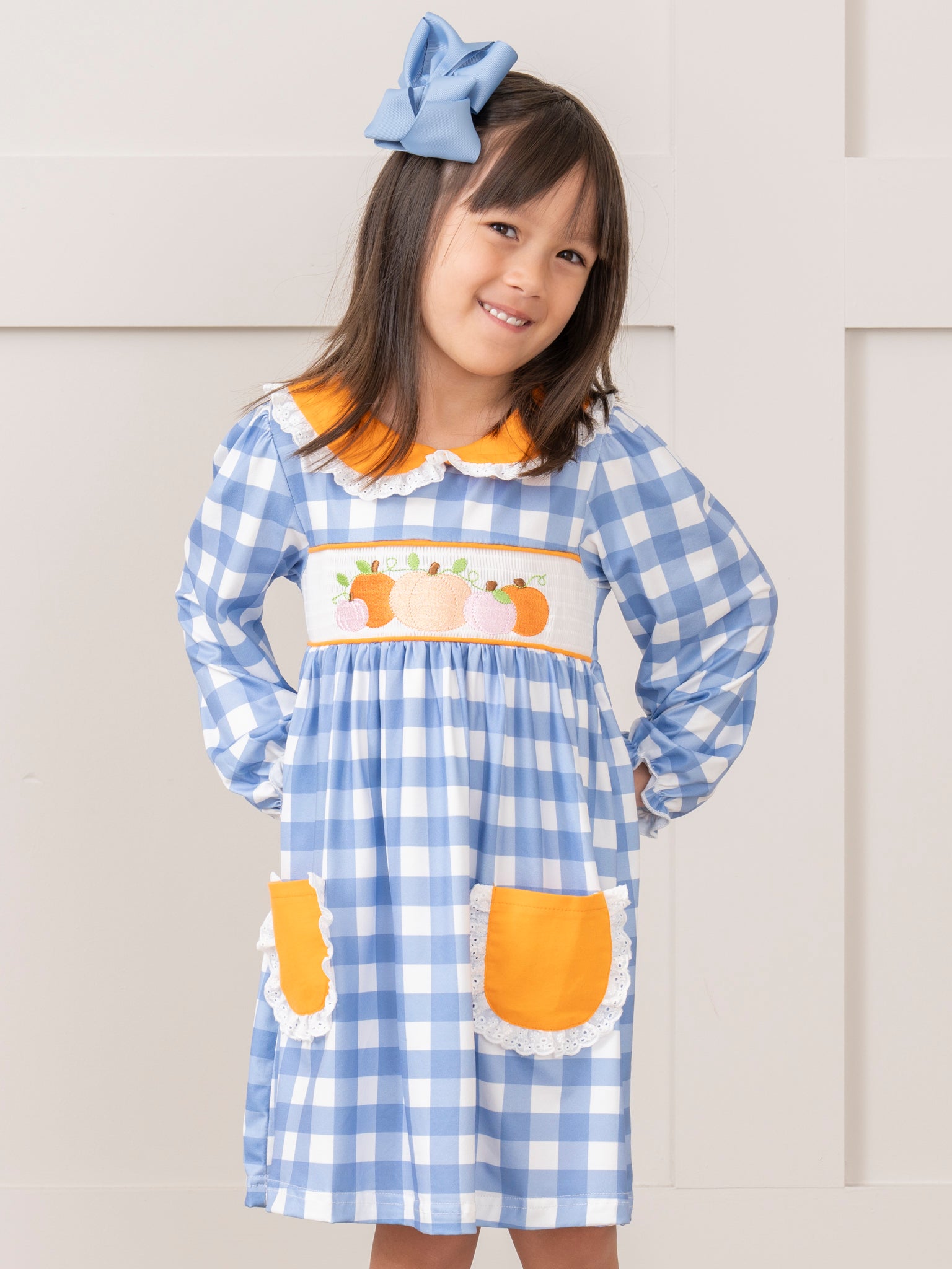 Blue Plaid & Pumpkin Smocked Dress