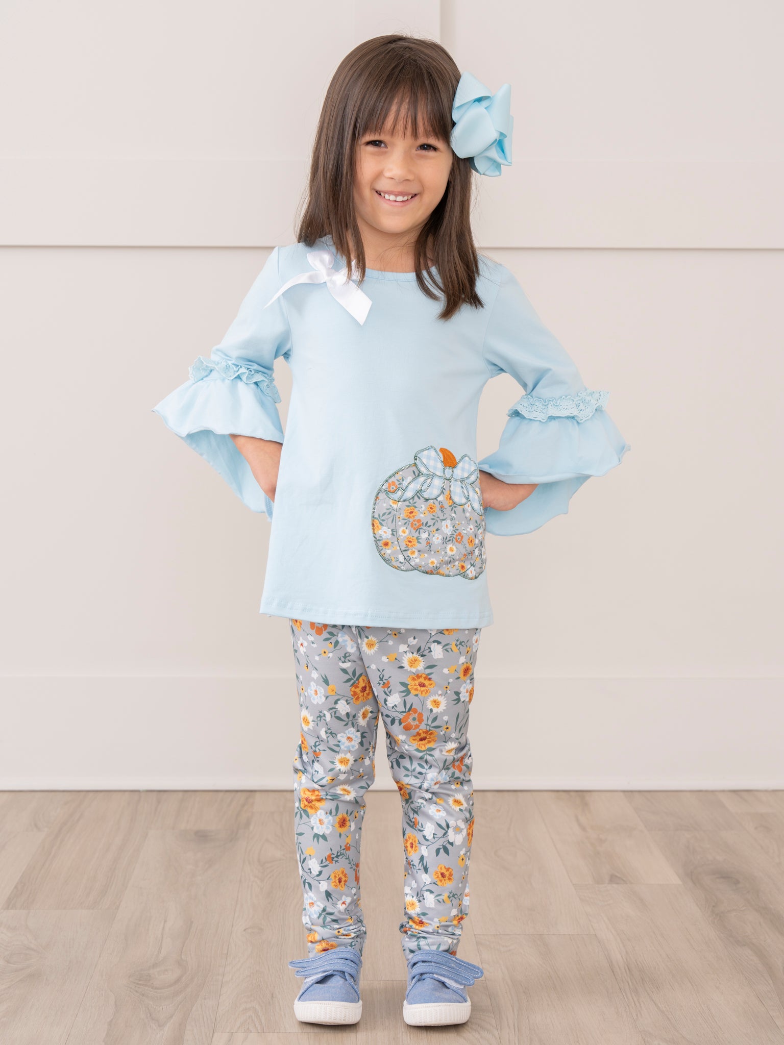 Light Blue Floral Embroidered Pumpkin Ruffle Outfit