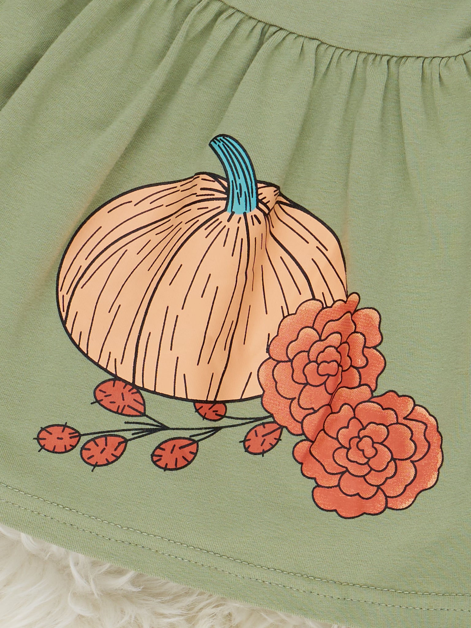 This cozy autumn outfit features a gorgeous green ruffle swing top with pumpkin applique and matching pumpkin ruffle leggings.
