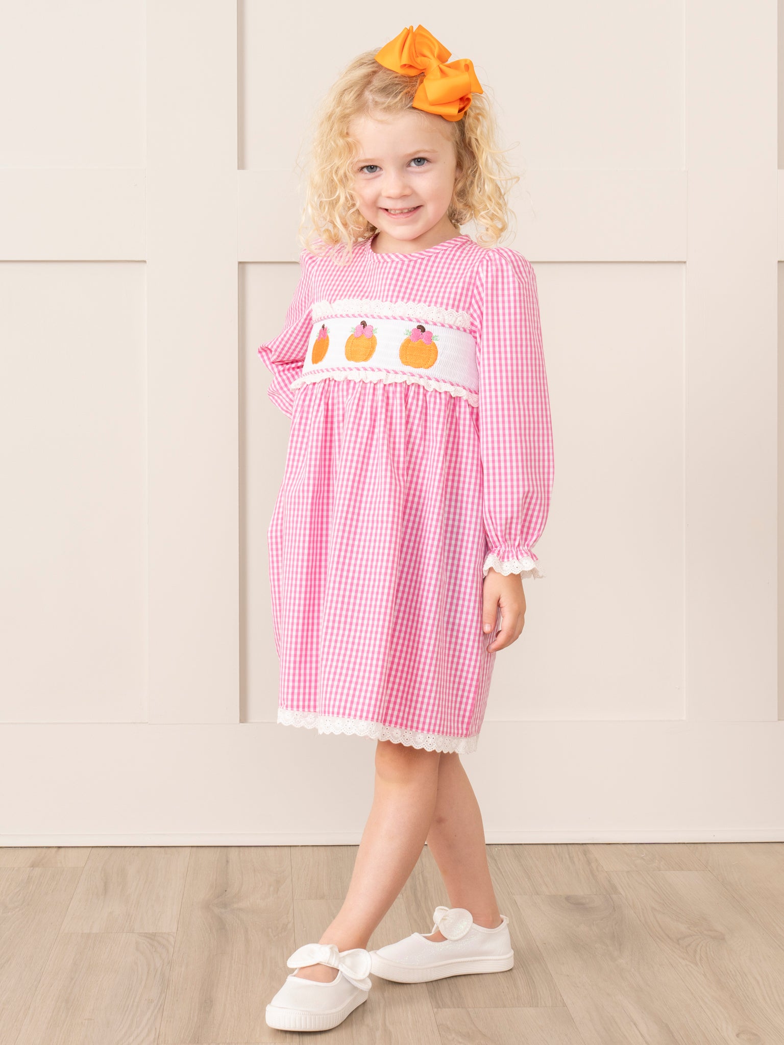 Get ready for fall fun with our Pink Gingham Smocked Pumpkin Ruffle Dress. This playful dress features embroidered pumpkins over smocking and a white ruffle trim for a touch of whimsy. Plus, it comes in a sister set for even more cuteness! Perfect for your little fashionista. šš