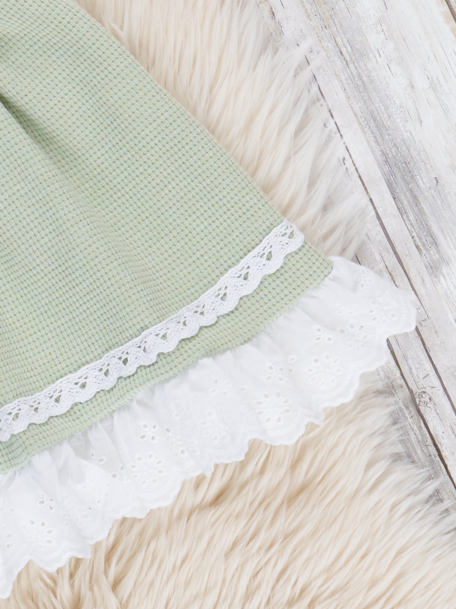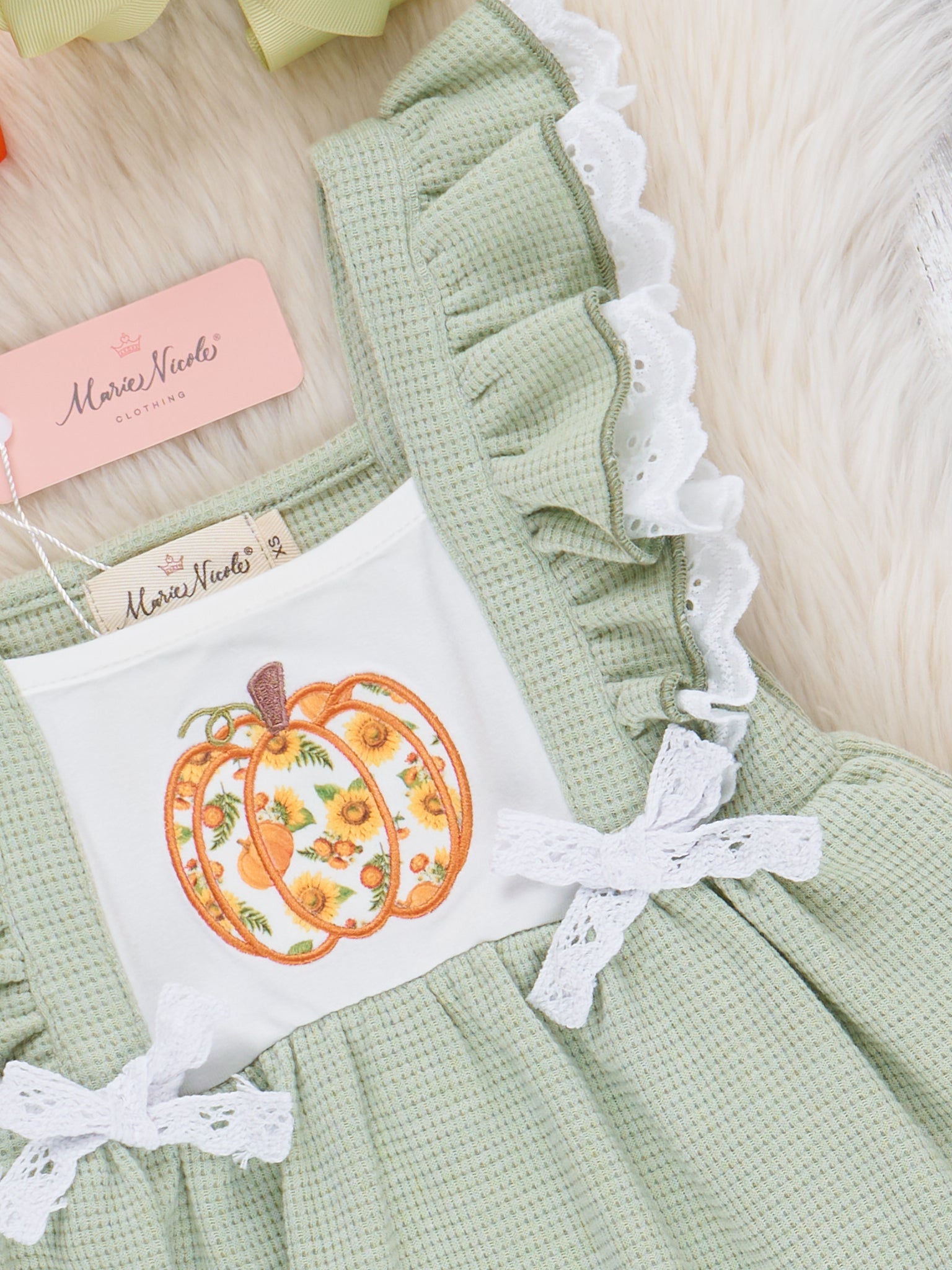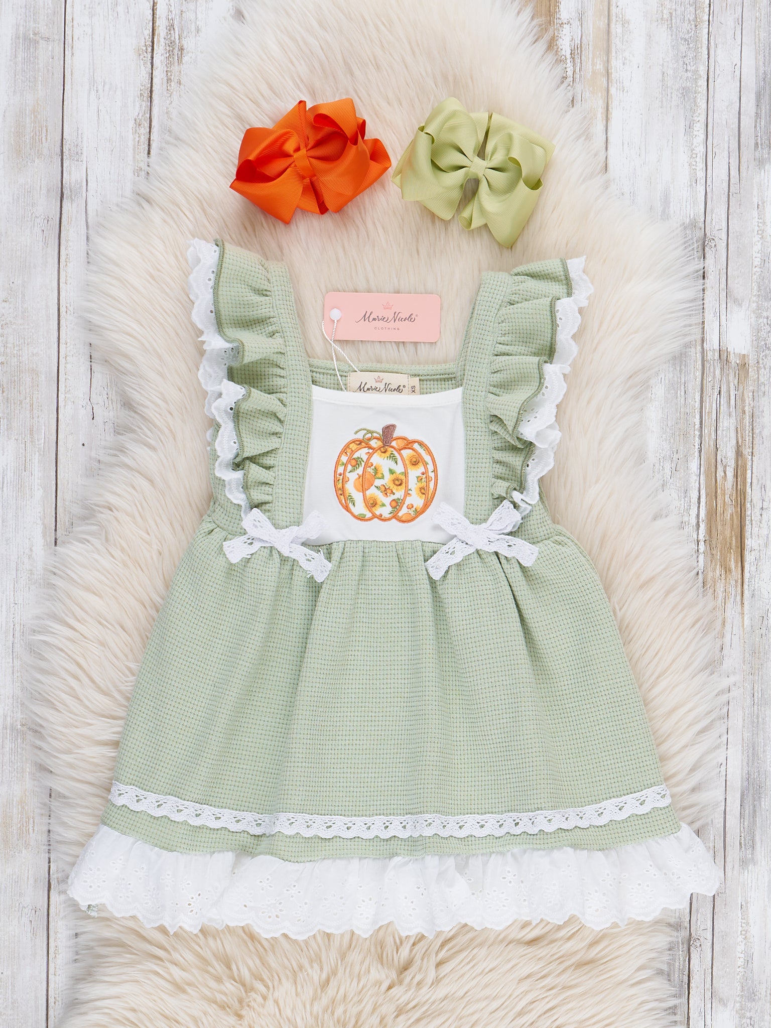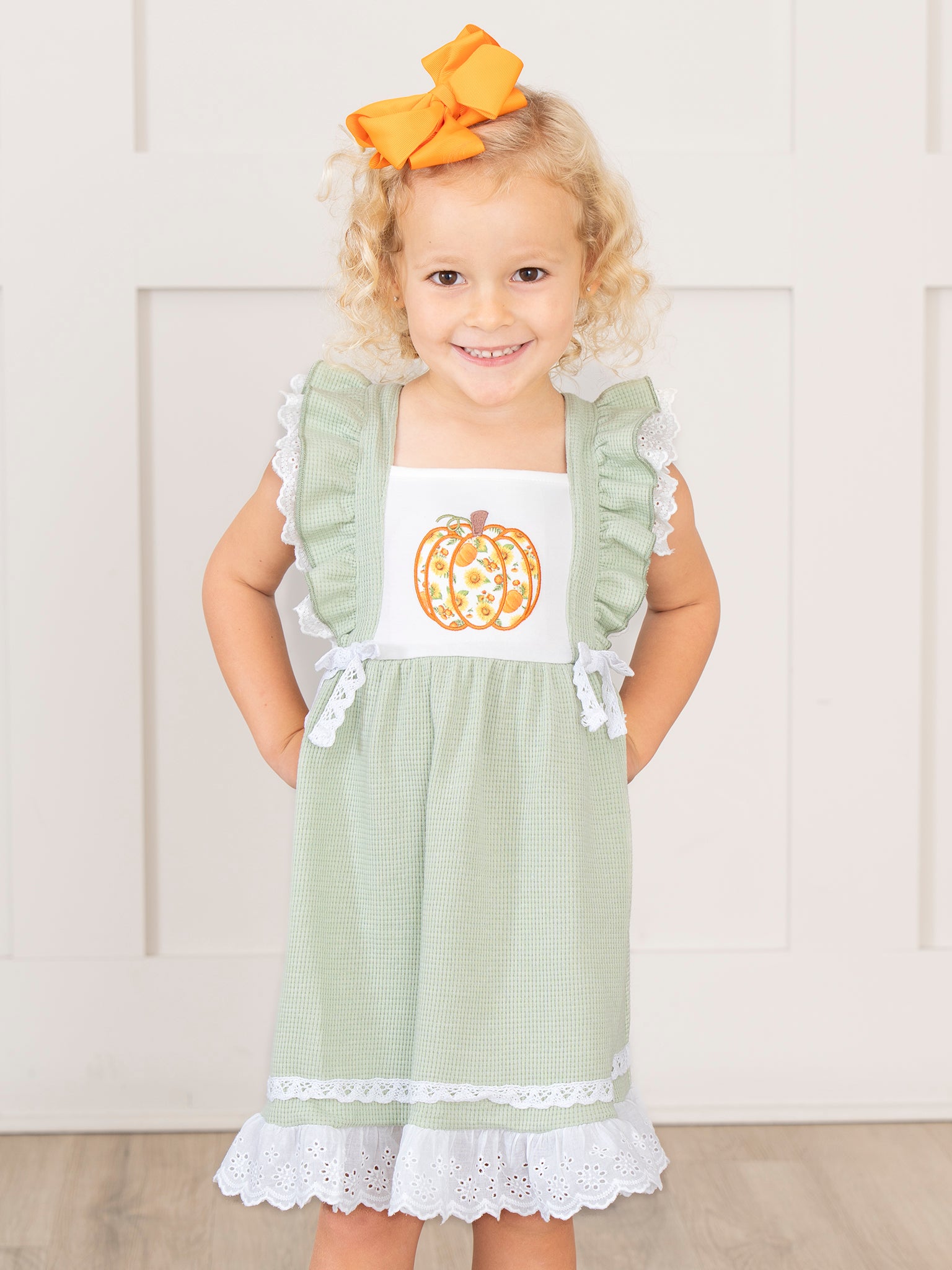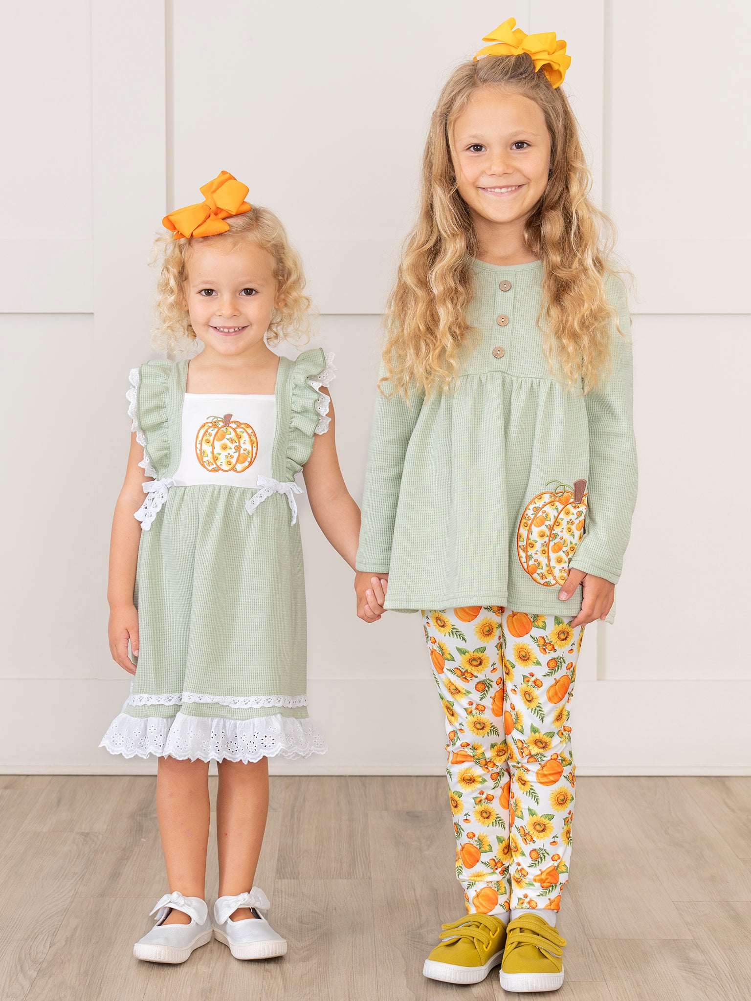Your minis will bloom in this sister set. Perfect for a trip to the pumpkin patch, this girls dress features waffle knit fabric in a serene shade of sage, with charming pumpkin accents and delicate lace detailing. Perfect for any autumn occasion!