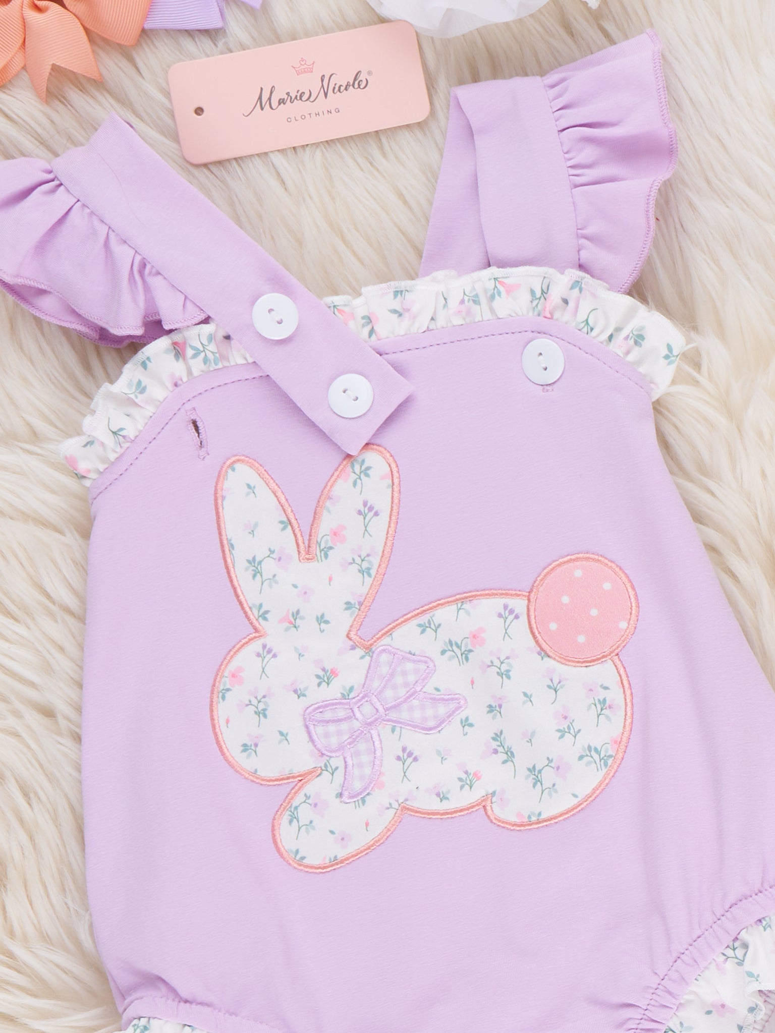 Blossoms Bunny Embroidered Cotton Ruffle Bubble by Marie Nicole Clothing features a large floral bunny applique on the front, framed by flutter straps and ruffle trim at the neckline and legs. Soft knit fabric and bottom snaps keep little ones comfy and make this sweet bubble perfect for Easter photos, brunch, and spring playdates.