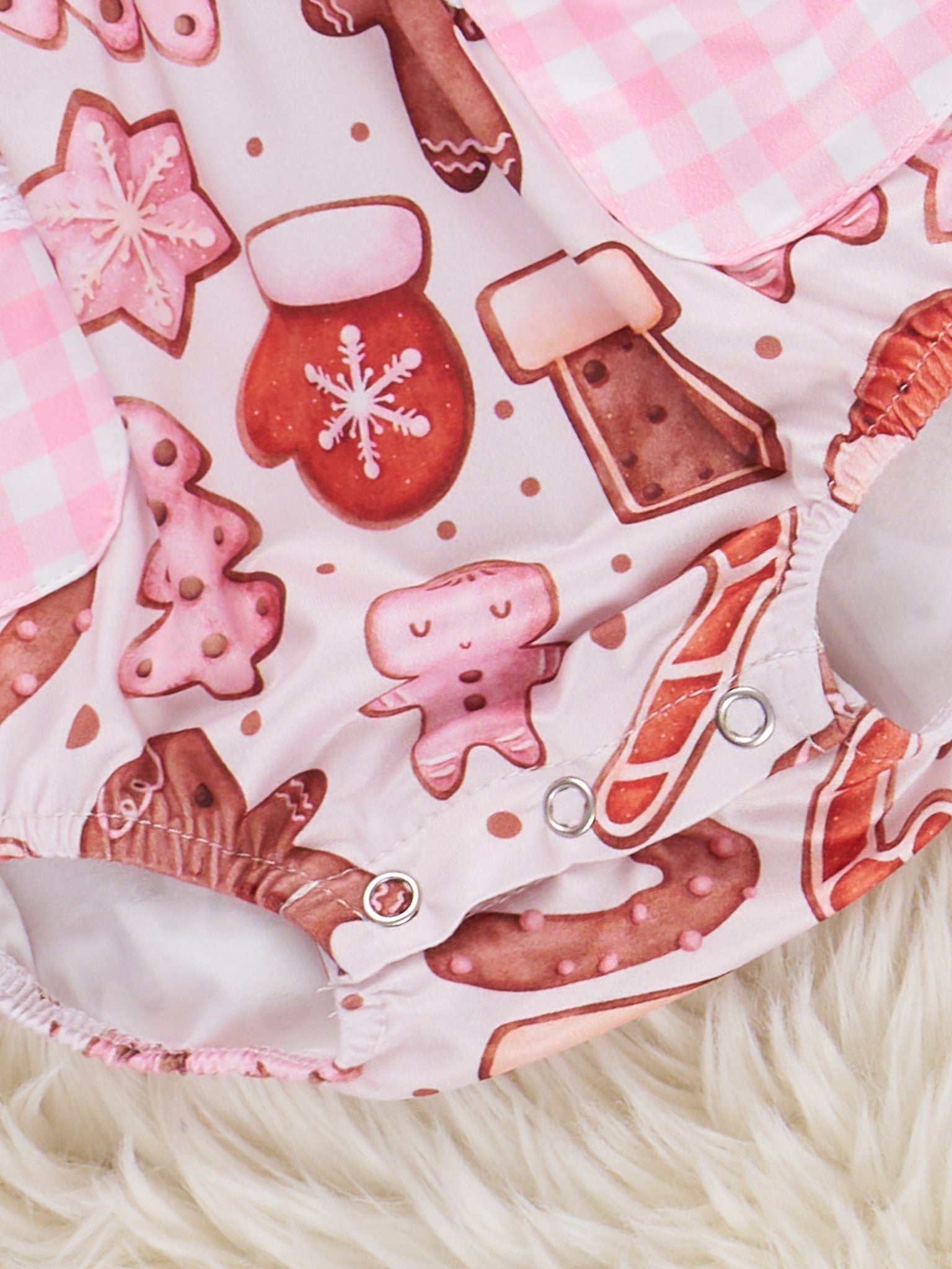 The Christmas Bakery Bubble Romper by Marie Nicole Clothing is for the sweethearts that love sweets! This quaint, cottagecore-style one-piece evokes the joy of making, enjoying, and sharing desserts during this holiday season, all while being dressed for comfort. Whether she is helping bake or munching along, your little girl will be cute and fashionable while doing it!