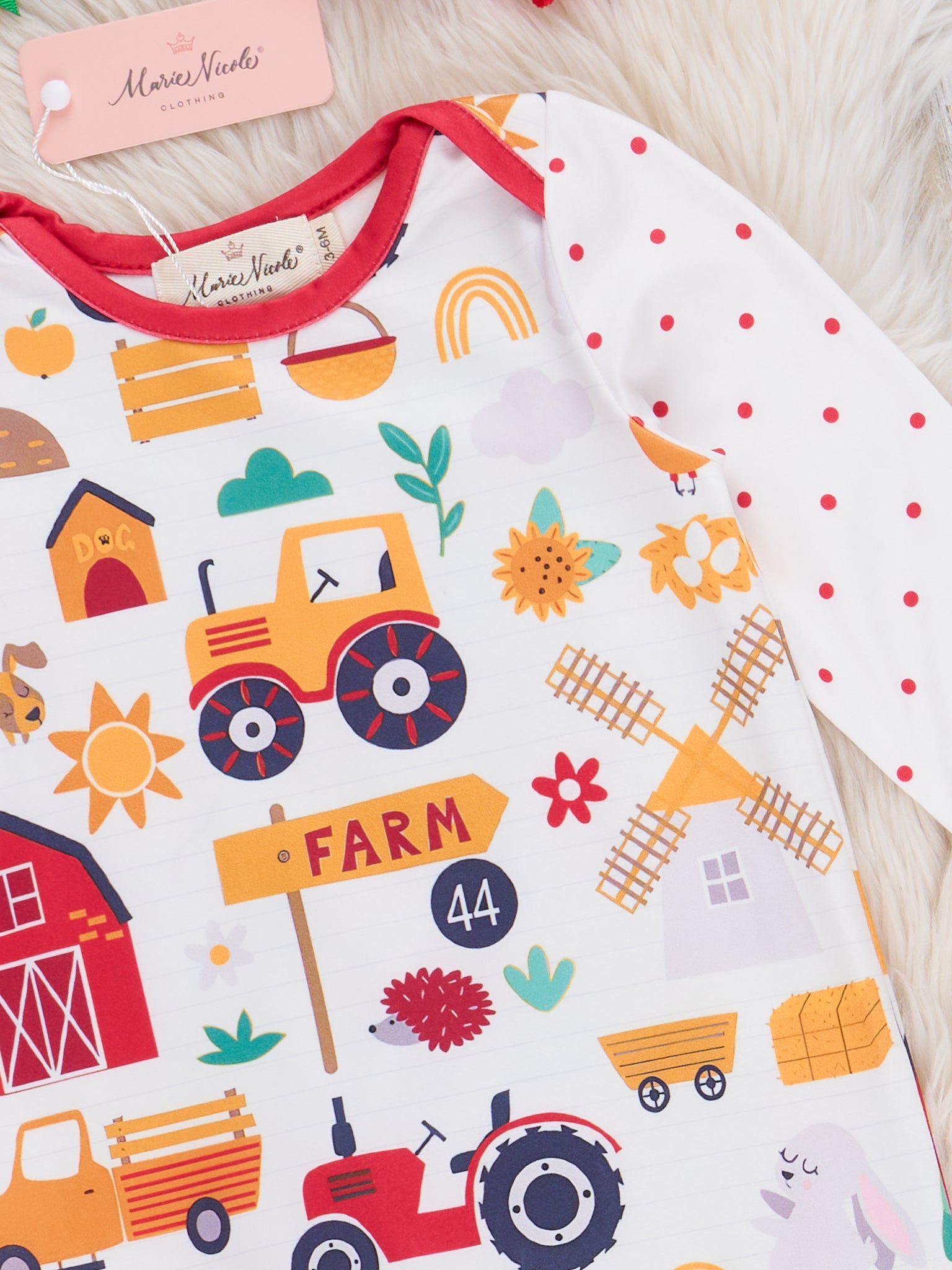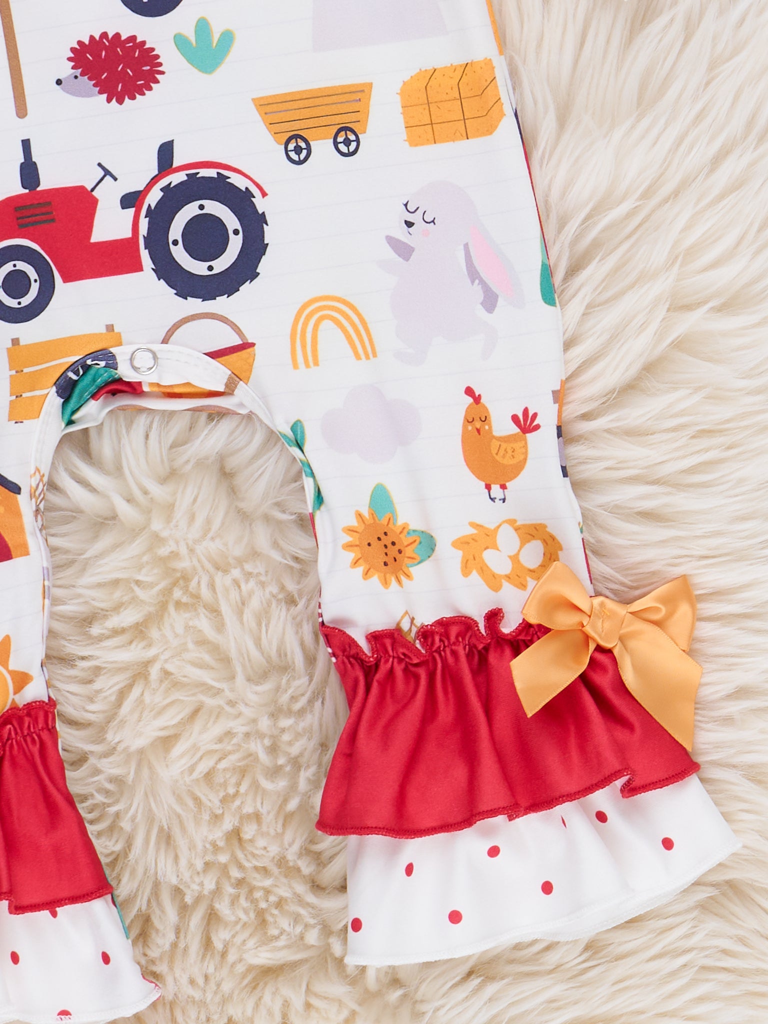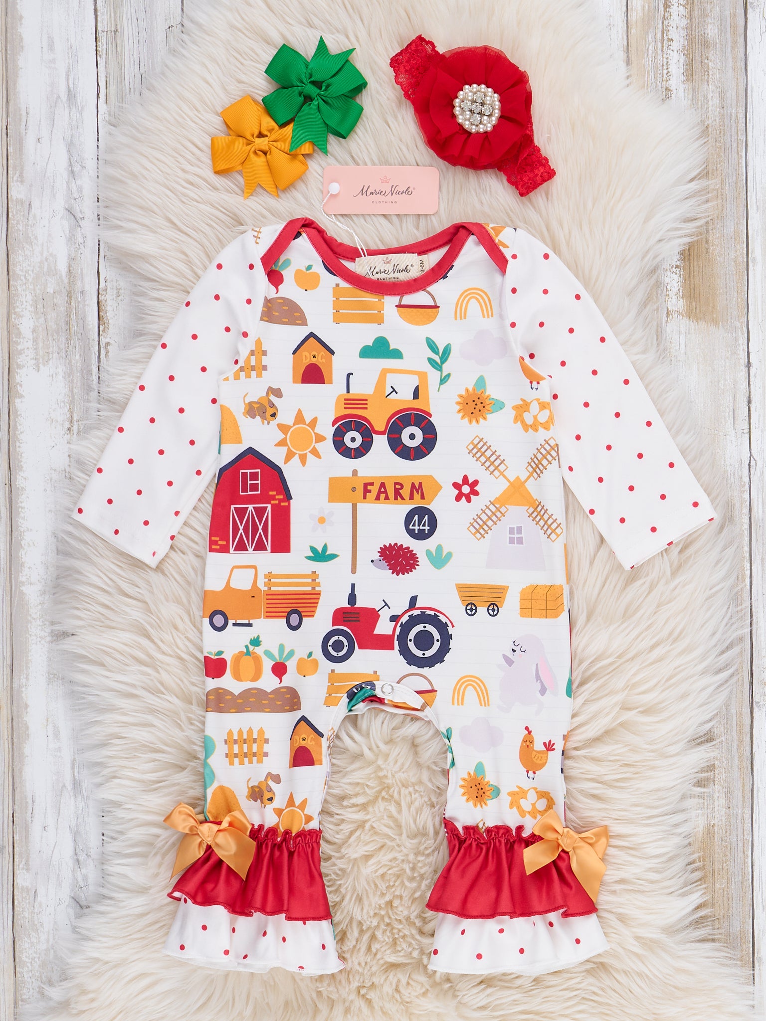 The Country Days Romper by Marie Nicole Clothing features a cheery farm print with barns, tractors, and harvest scenes, finished with playful bell-bottom ruffle legs and bow accents. Designed for easy movement and adorable style, this romper pairs soft, stretchy fabric with practical snap closures for quick changes—making it perfect for lively days on the go or special photoshoots.