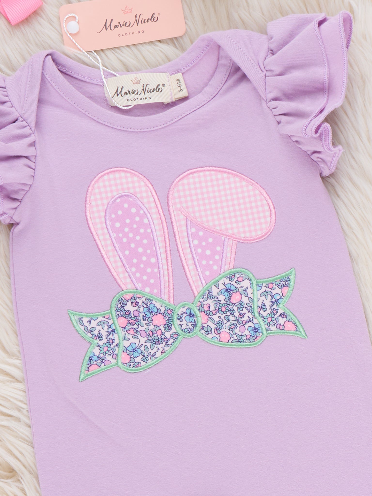 The Floral Bunny Ears Embroidered Ruffle Romper by Marie Nicole Clothing hops into Easter fun with sweet bunny-ear appliqué, flutter sleeves, and layered floral ruffles at the ankles for extra bounce. From Marie Nicole, the soft knit fabric and snap closure make changes easy, keeping little ones comfy for egg hunts, parties, and picture-ready spring adventures.