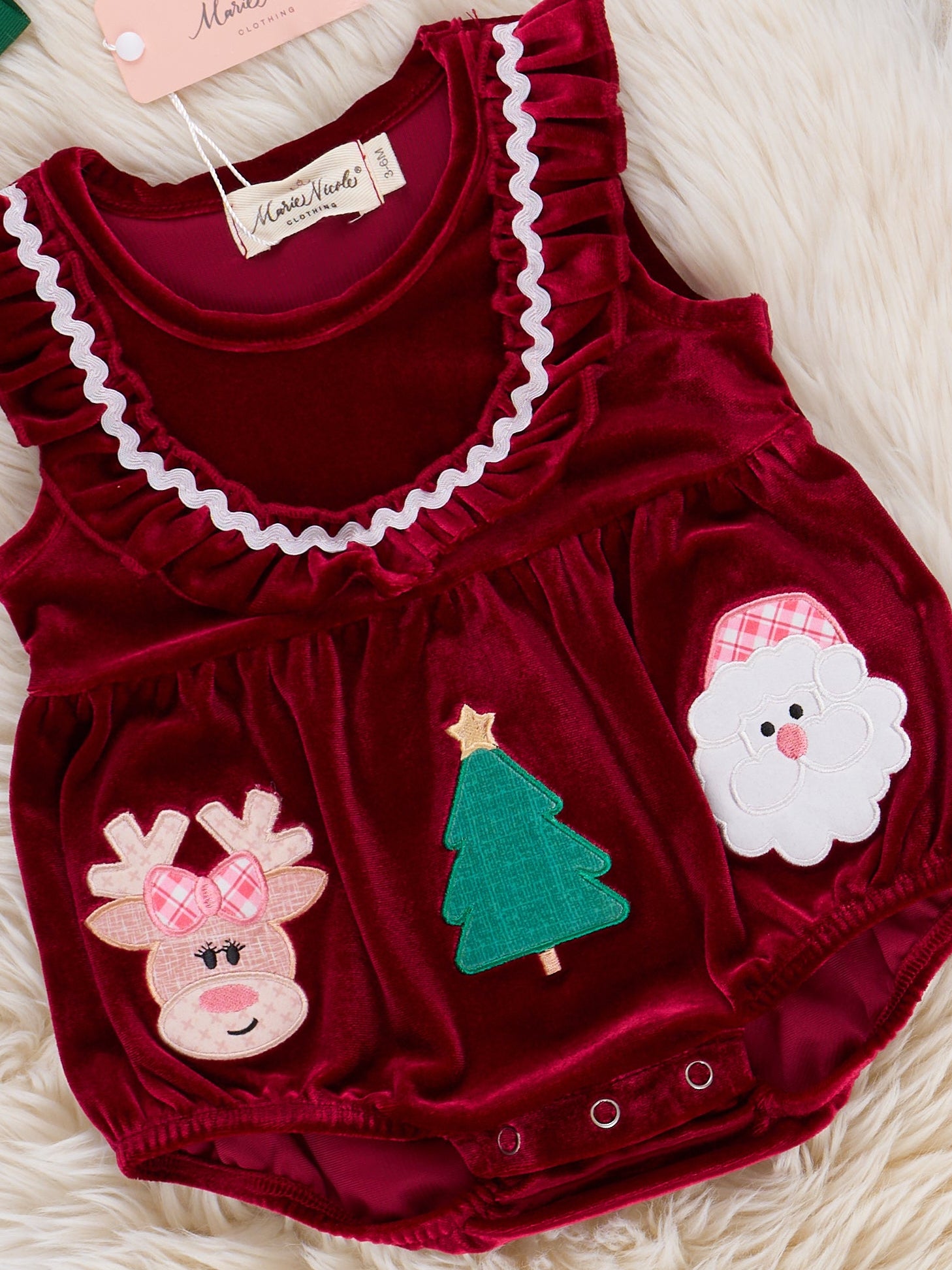 The Santa's Little Helper Embroidered Velvet Bubble Romper by Marie Nicole features festive character appliques, including a cheerful reindeer, a decorated tree, and a jolly Santa, accented by delicate trim and gentle ruffles at the shoulders. Designed with soft velvet fabric and convenient snap closures, this bubble adds holiday magic and comfort to any seasonal celebration.