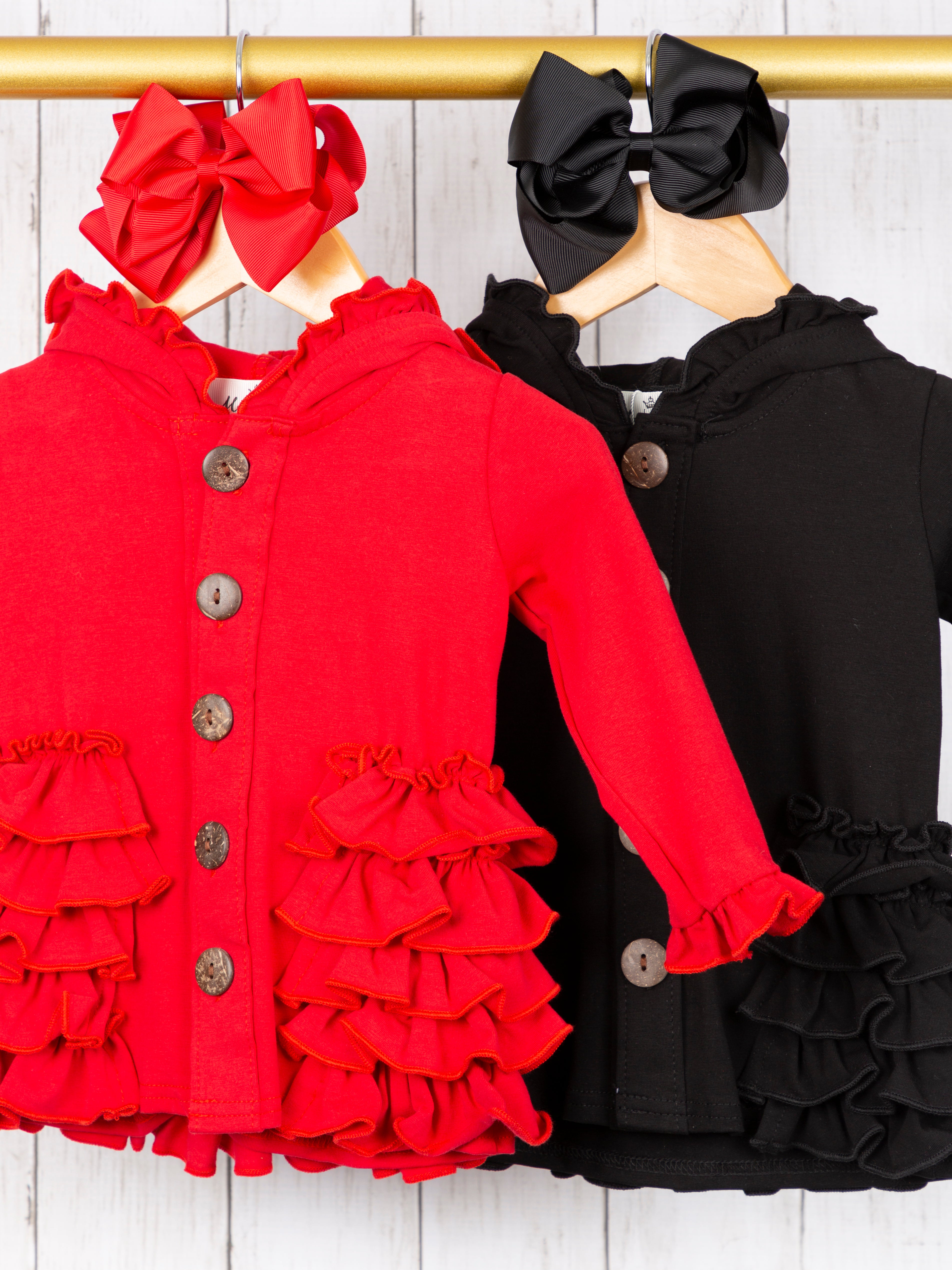 Cotton Ruffle Hooded Cardigan- Black & Red
