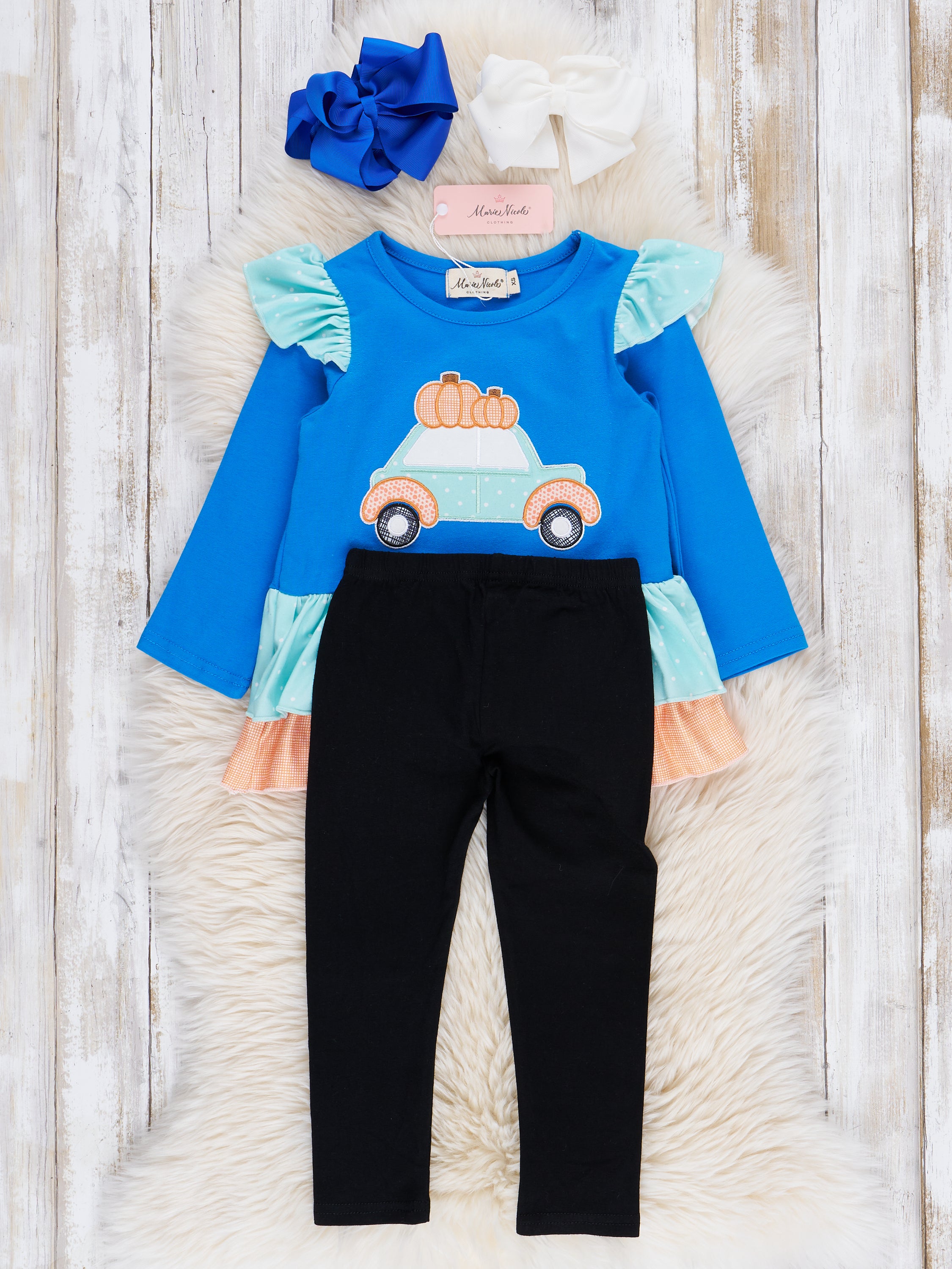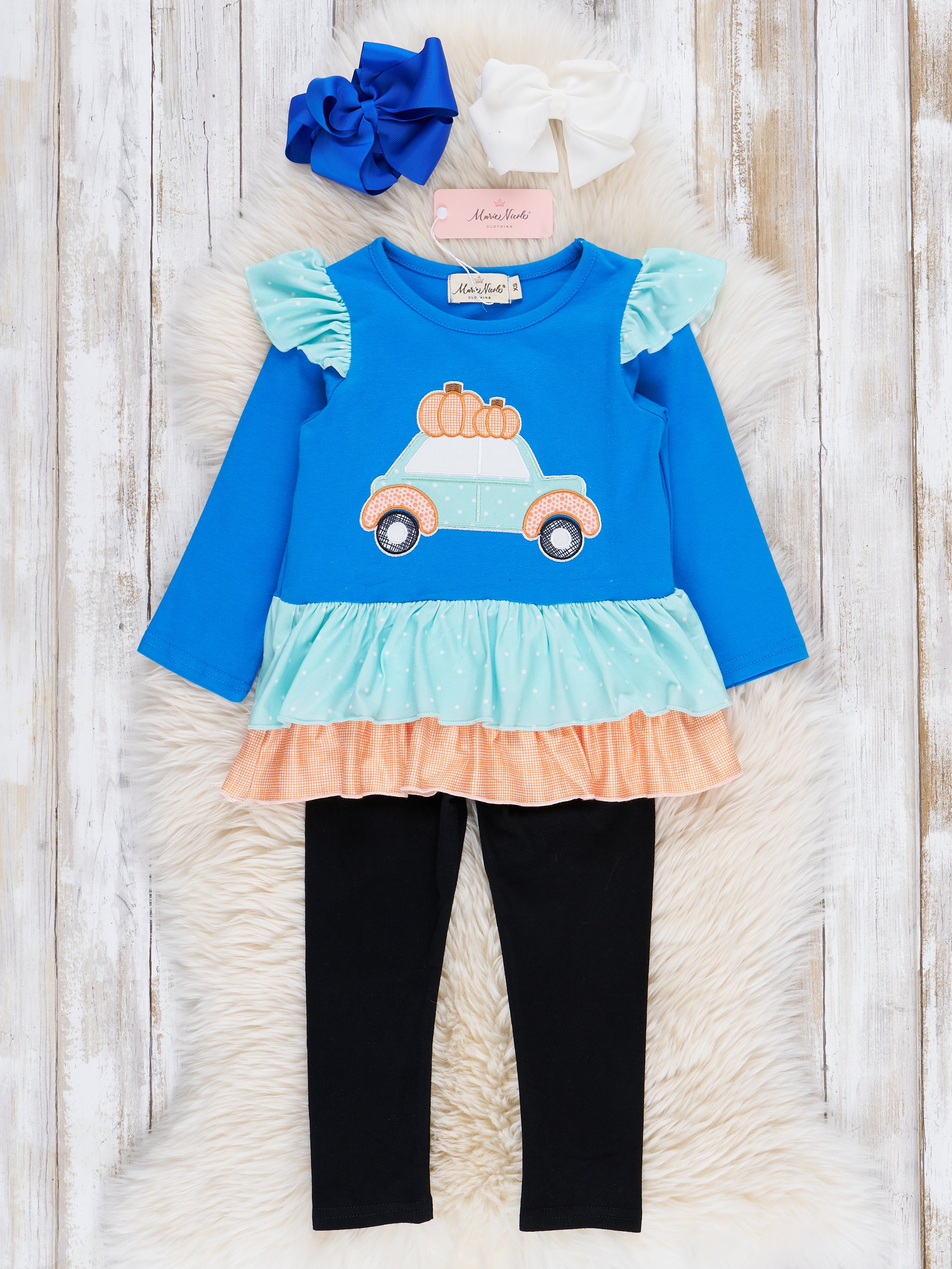 Rev up your little one's style with our Blue Pumpkin Car Ruffle Outfit. This girls outfit features vibrant color block ruffles and an embroidered pumpkin car for a playful autumn touch. The coordinating sibling set is simply adorable and perfect for your little pumpkins!