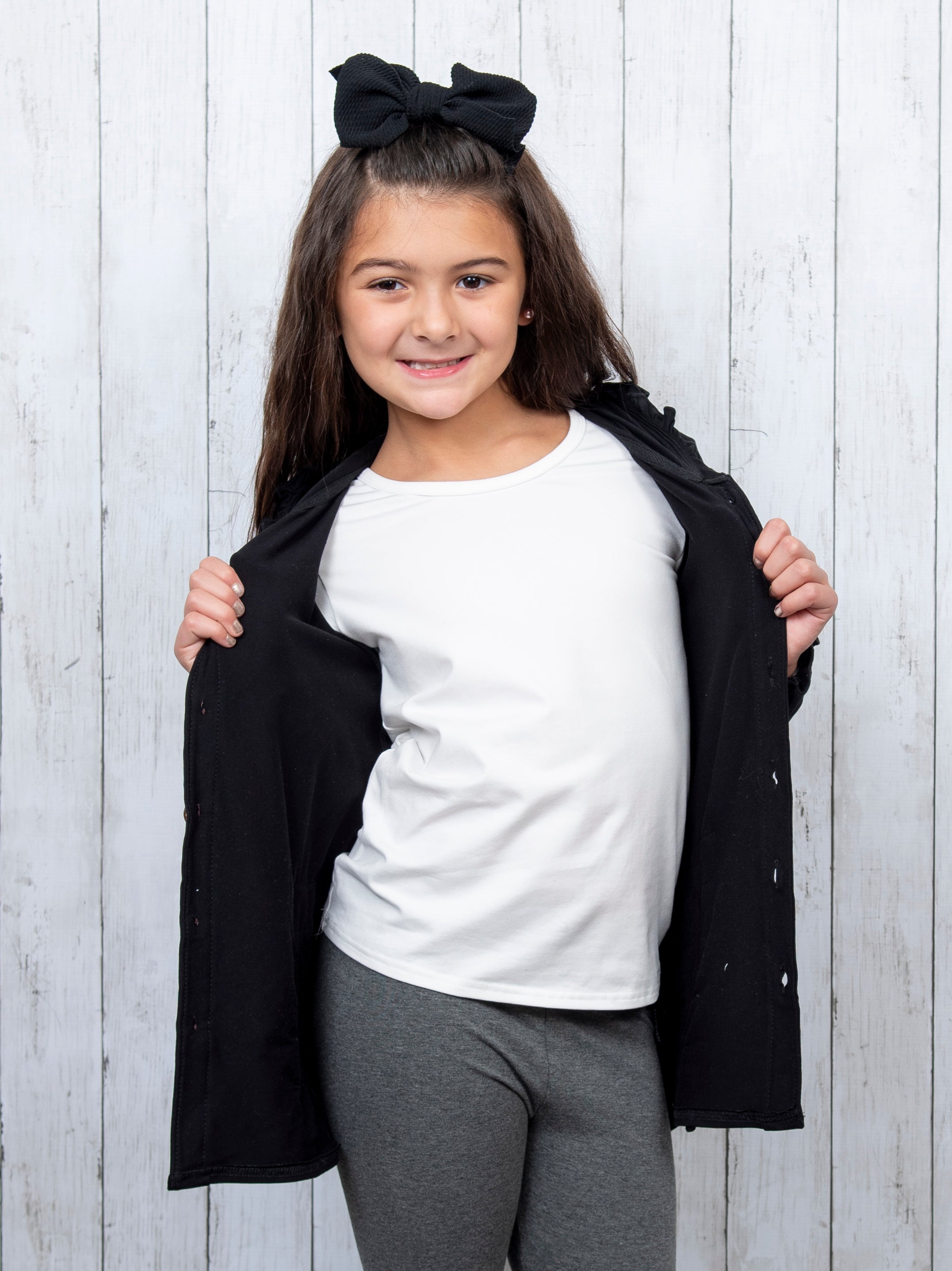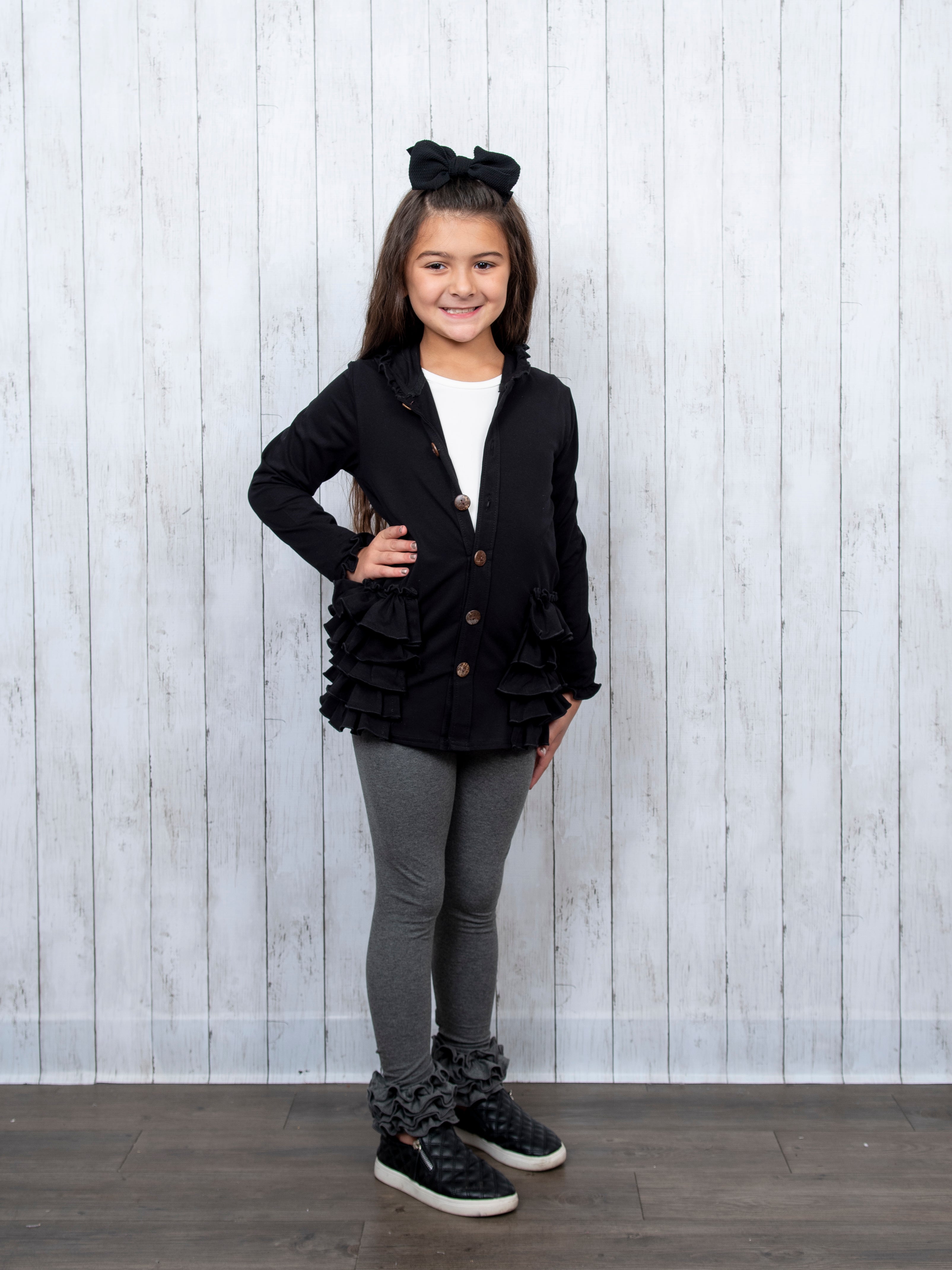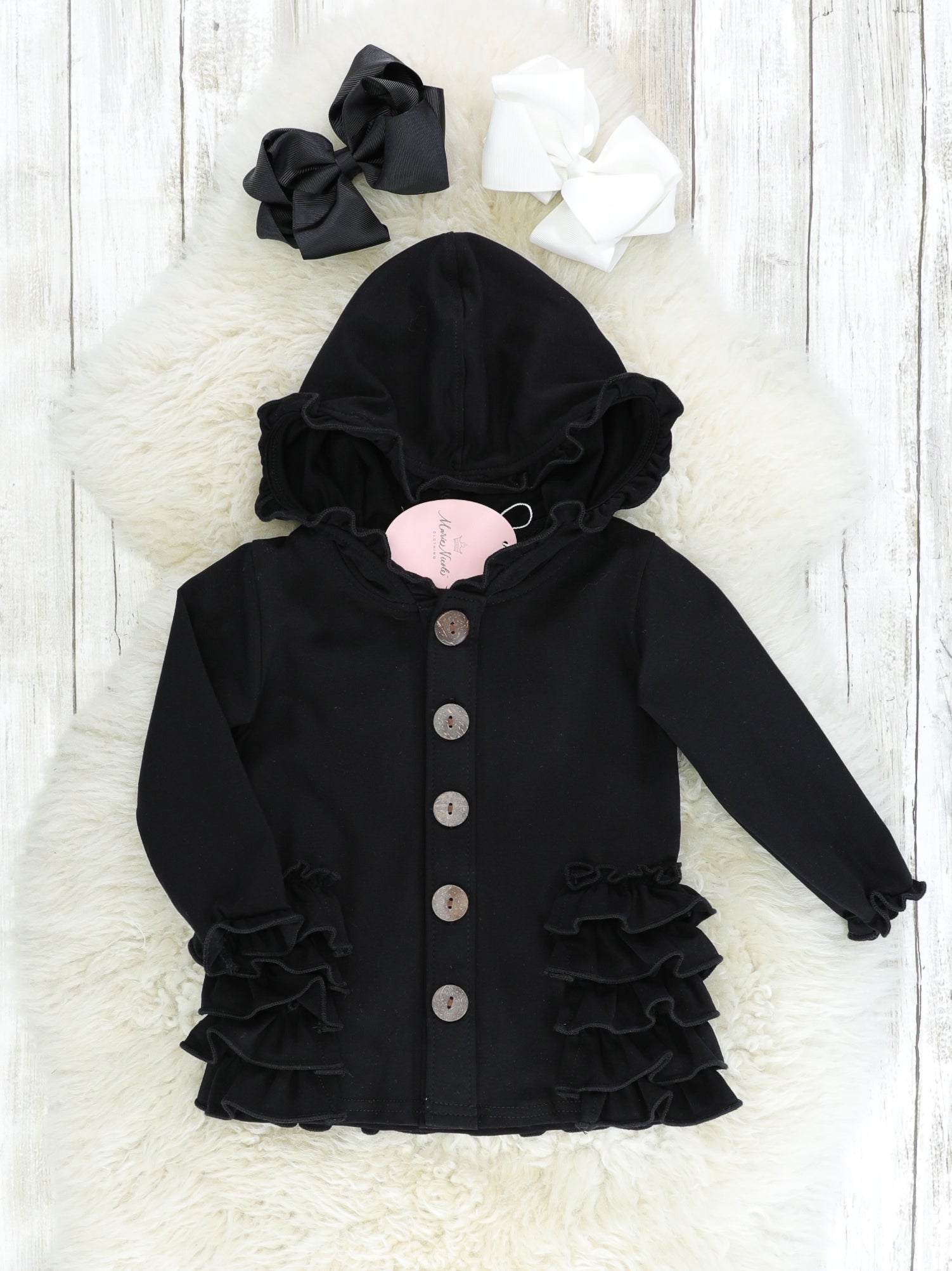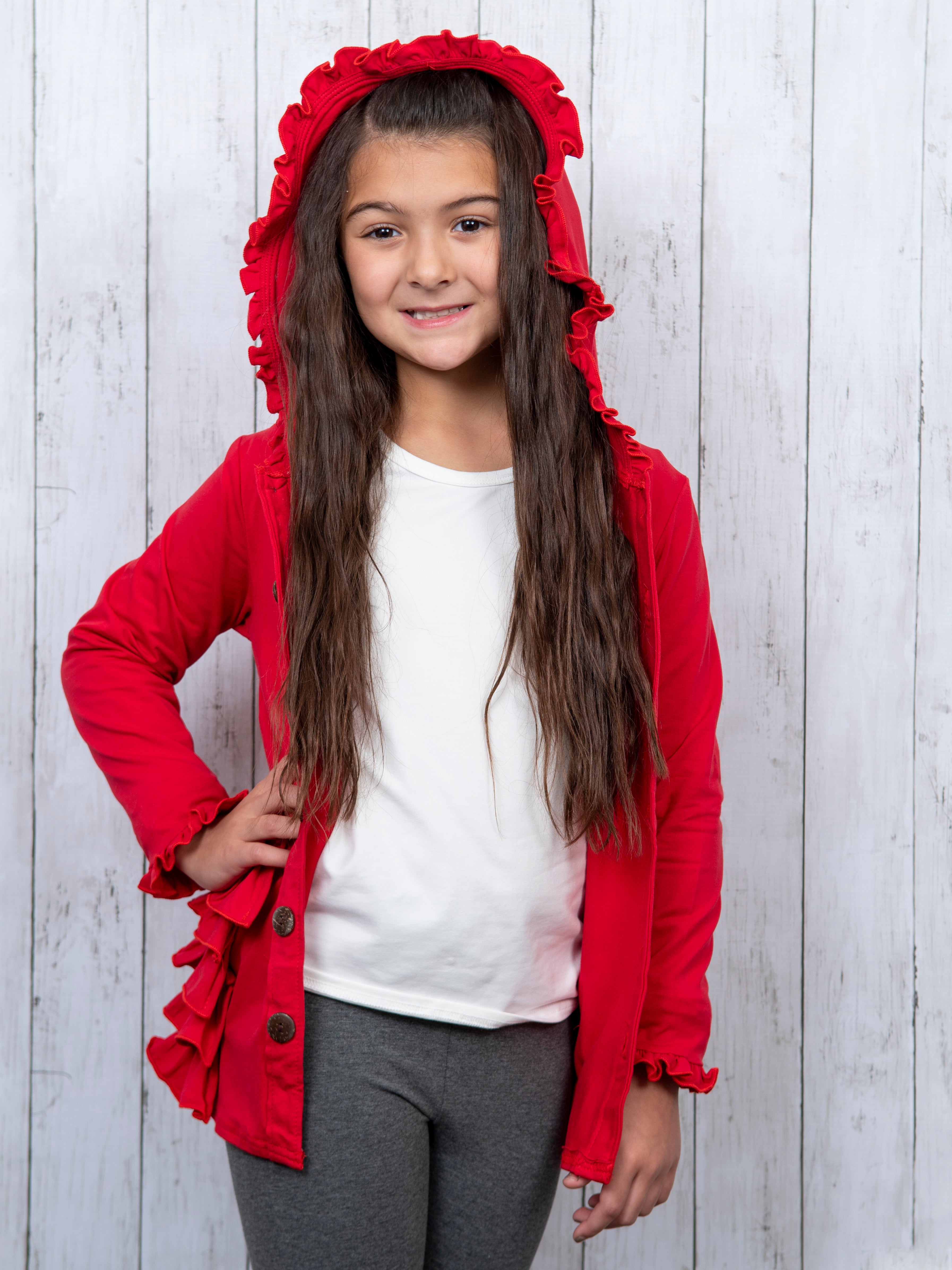 MNC's exclusive hooded cardigans to keep your girls warm all season long! This cardigan features a ruffle back, ruffle trim along the hood & sleeves, & functioning wood buttons. Shop all the MNC fall basics here! By Marie Nicole Clothing.