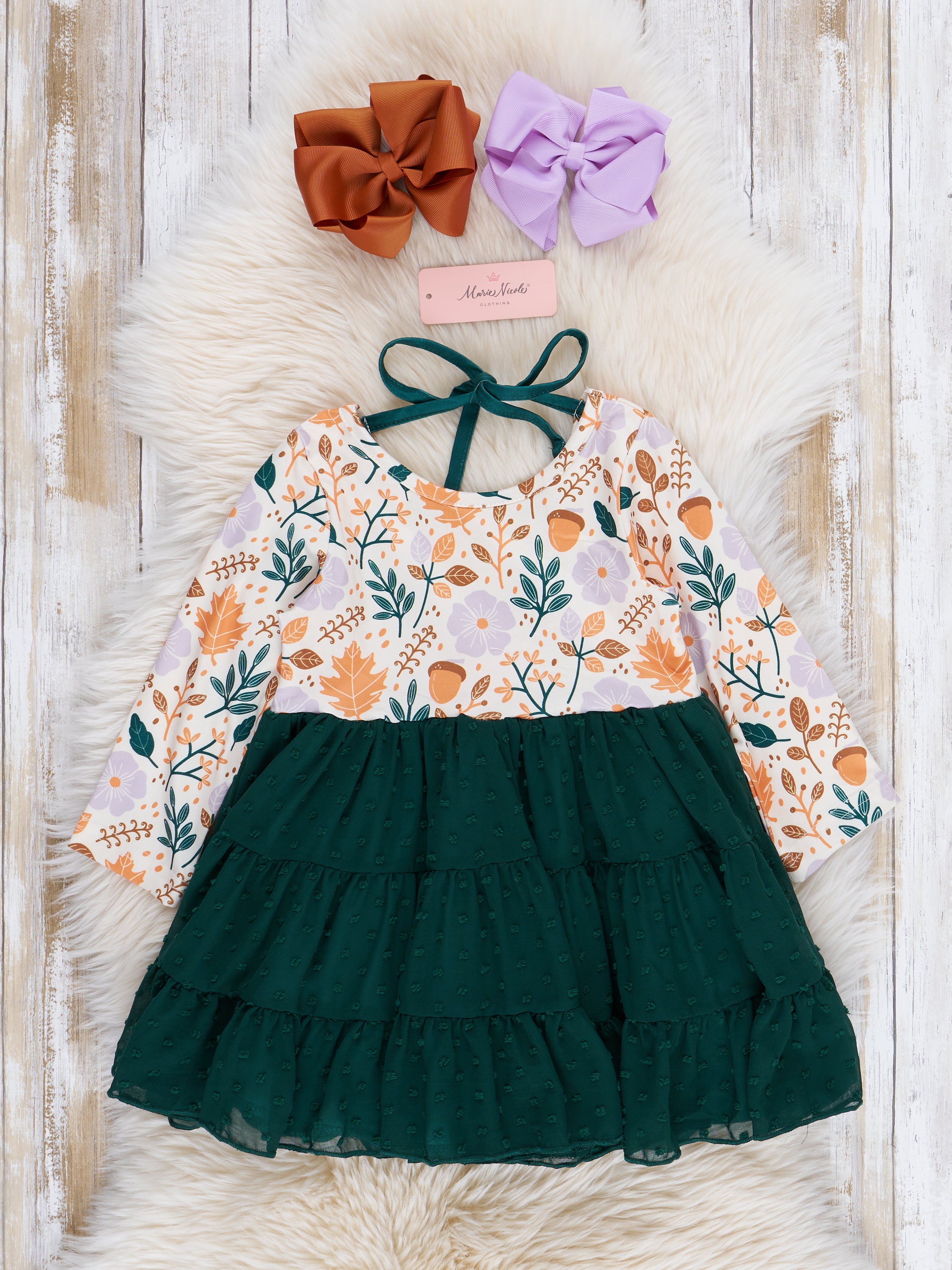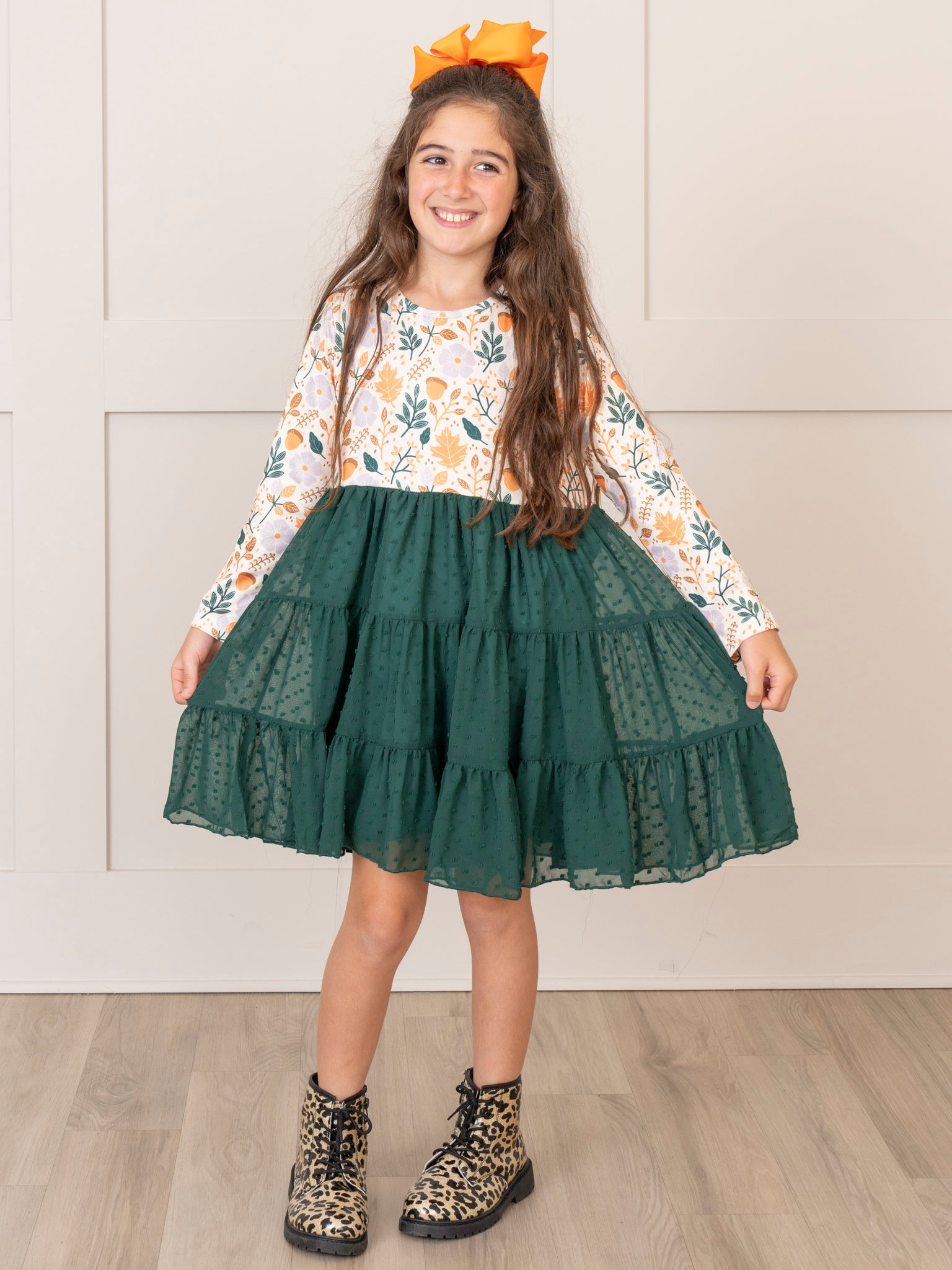 Get ready to bloom with this playful Hunter Green Garden Tiered Swiss Dot Dress! Featuring a floral long sleeve bodice and a tiered green swiss dot skirt, this dress is perfect for any occasion. Plus, the back tie adds a fun and unique touch. Time to twirl!