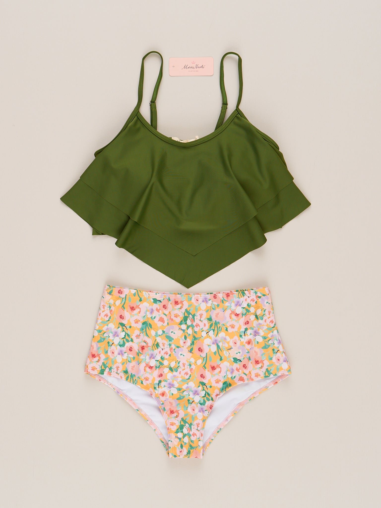 Dive into fun with our Watercolor Garden Ruffle Swimsuit for moms! Designed by Marie Nicole Clothing, this Mom & Me set features a playful green top with adjustable straps and high waist bottoms in a whimsical watercolor garden print. Perfect for summer days by the pool or at the beach.