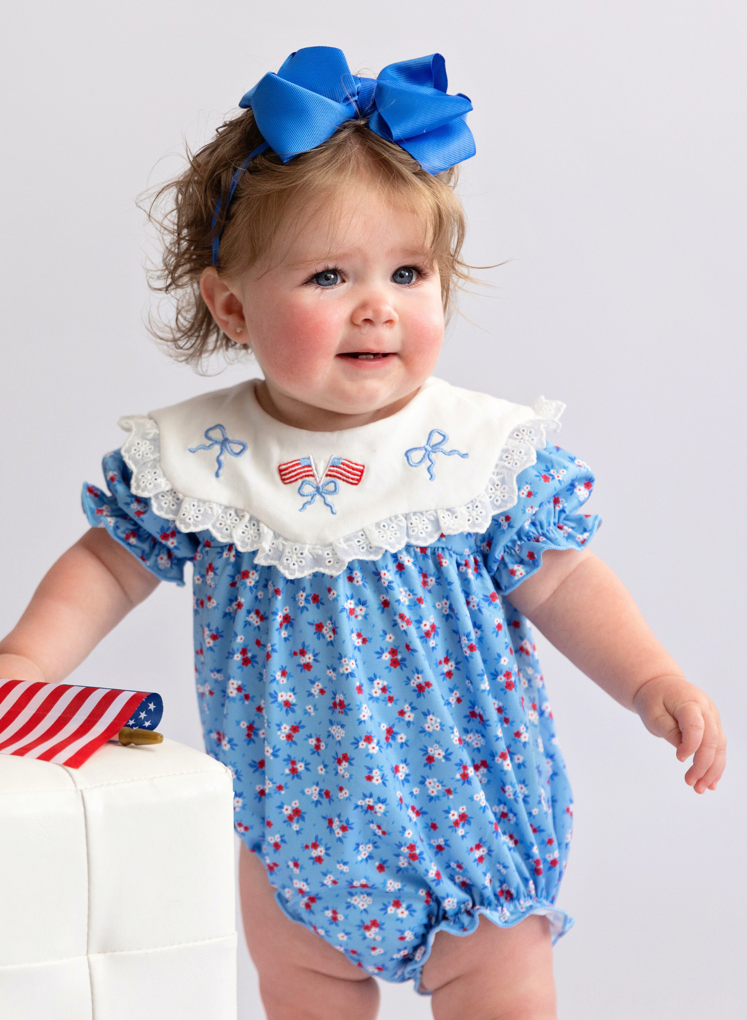 The American Dreamer Embroidered Lace Ruffle Romper by Marie Nicole Clothing features a beautifully embroidered neckline and soft ruffle sleeves for a sweet, timeless look. Designed with a comfy bubble fit and easy snap closures, this romper is perfect for family gatherings, festive moments, and everyday play, keeping little ones comfortable while looking picture-ready all day.