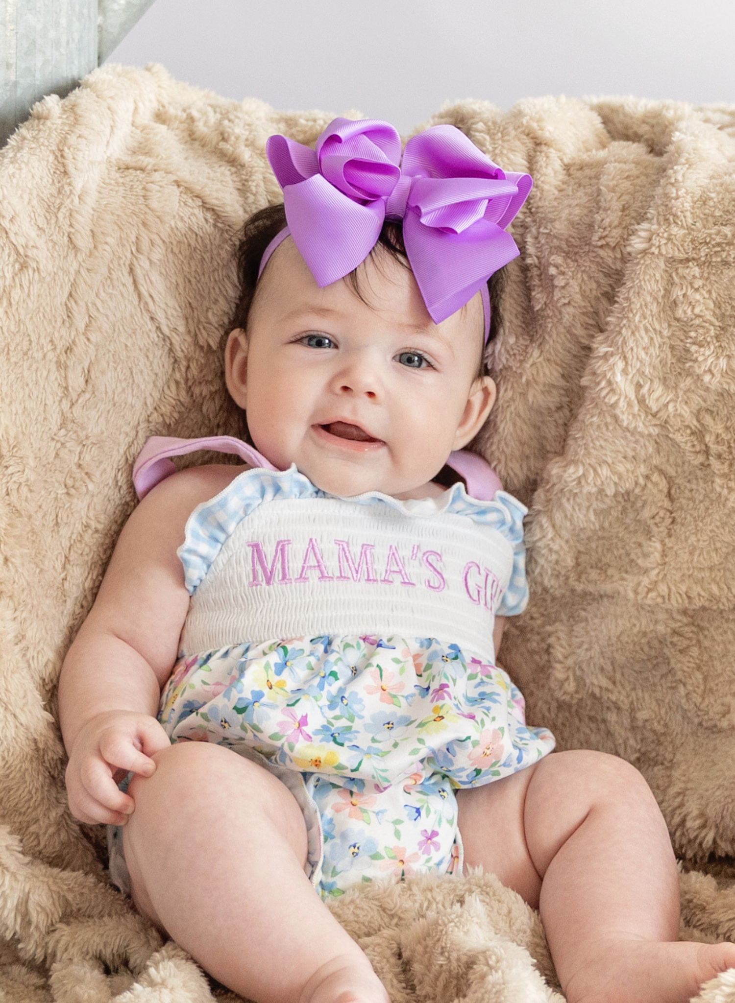 The MAMA'S GIRL Petal Hem Smocked Ruffle Bubble by Marie Nicole Clothing cherishes special bonds with its smocked bodice for comfy fit. Petal hem and ruffle details create bouncy charm for wiggly play, while stretchy fabric keeps little ones snug all day. Perfect for mama moments, family photos, or joyful outings full of twirls and tender love.