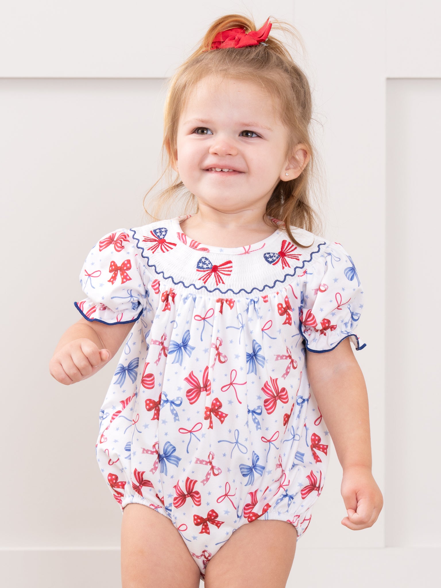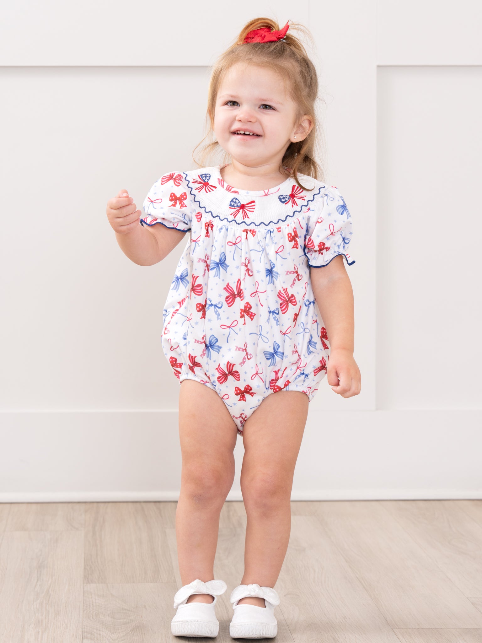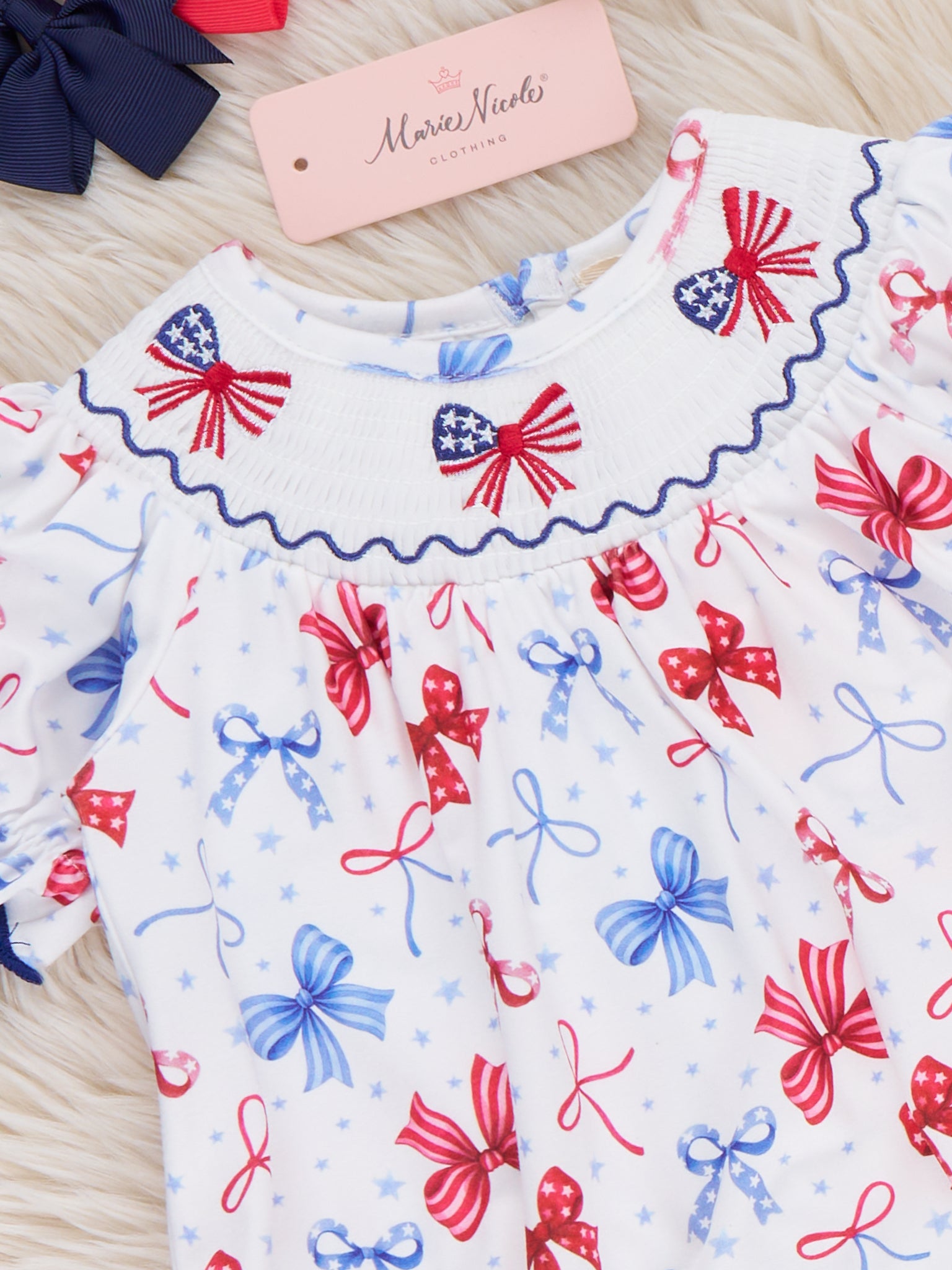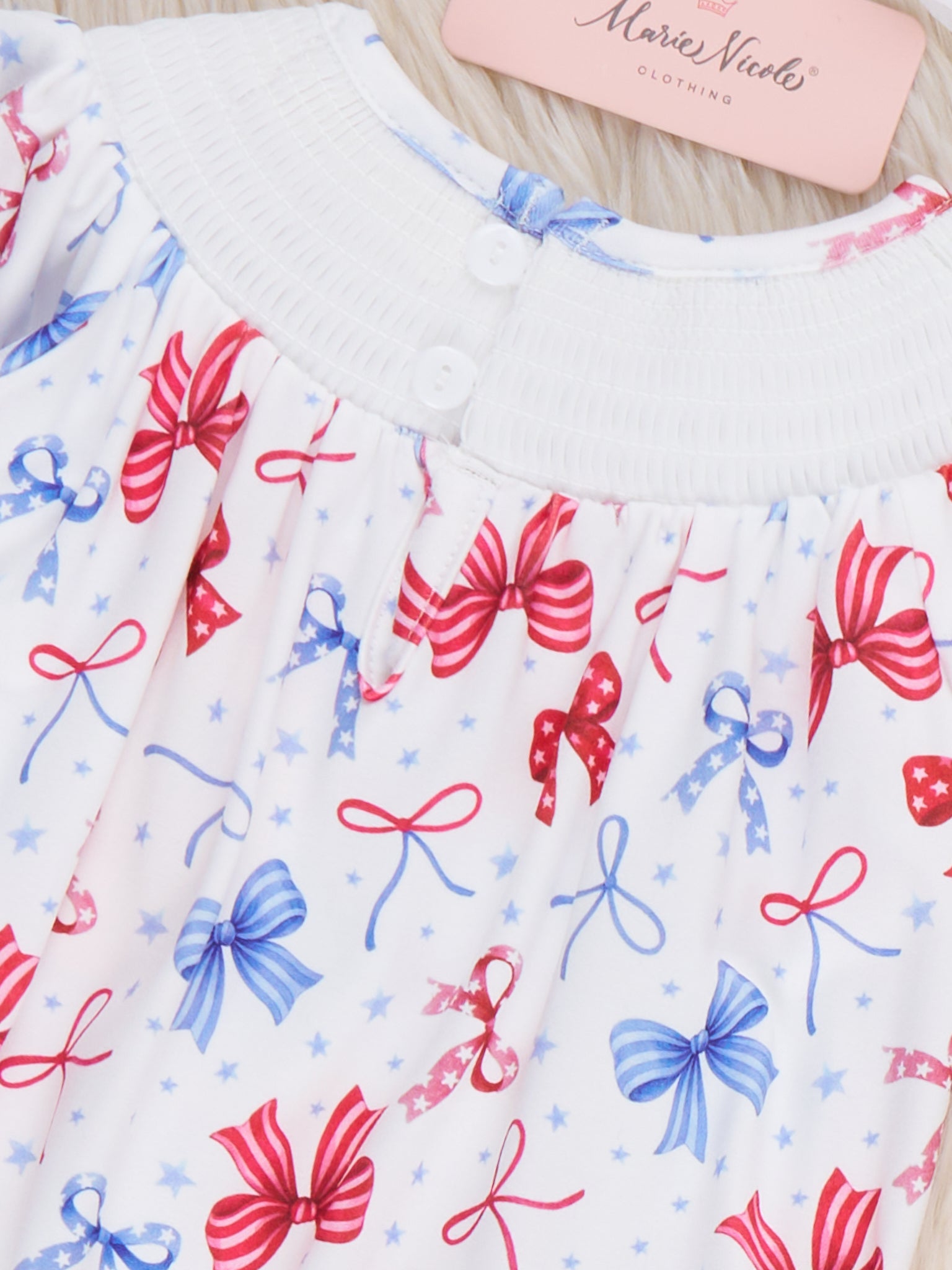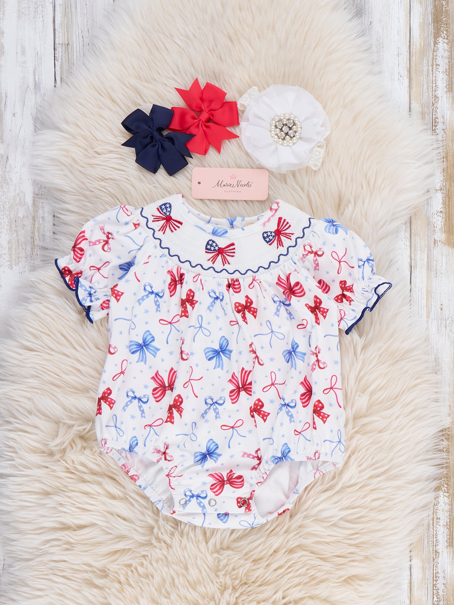 The Patriotic Bow Delight Smocked Bubble by Marie Nicole Clothing combines sweet charm with festive flair. Featuring adorable bow embroidery and ruffled sleeves, this comfy bubble is perfect for all-day wear during celebrations. The soft fabric and cute design make it ideal for picnics, family gatherings, and creating lasting memories on patriotic holidays.