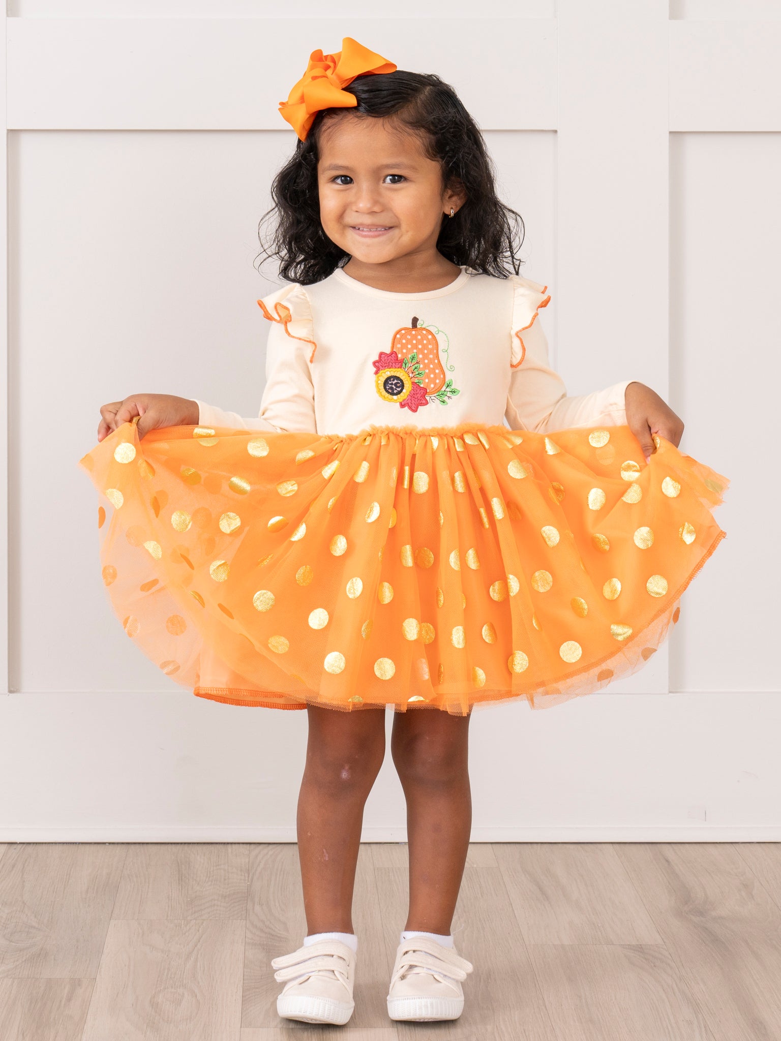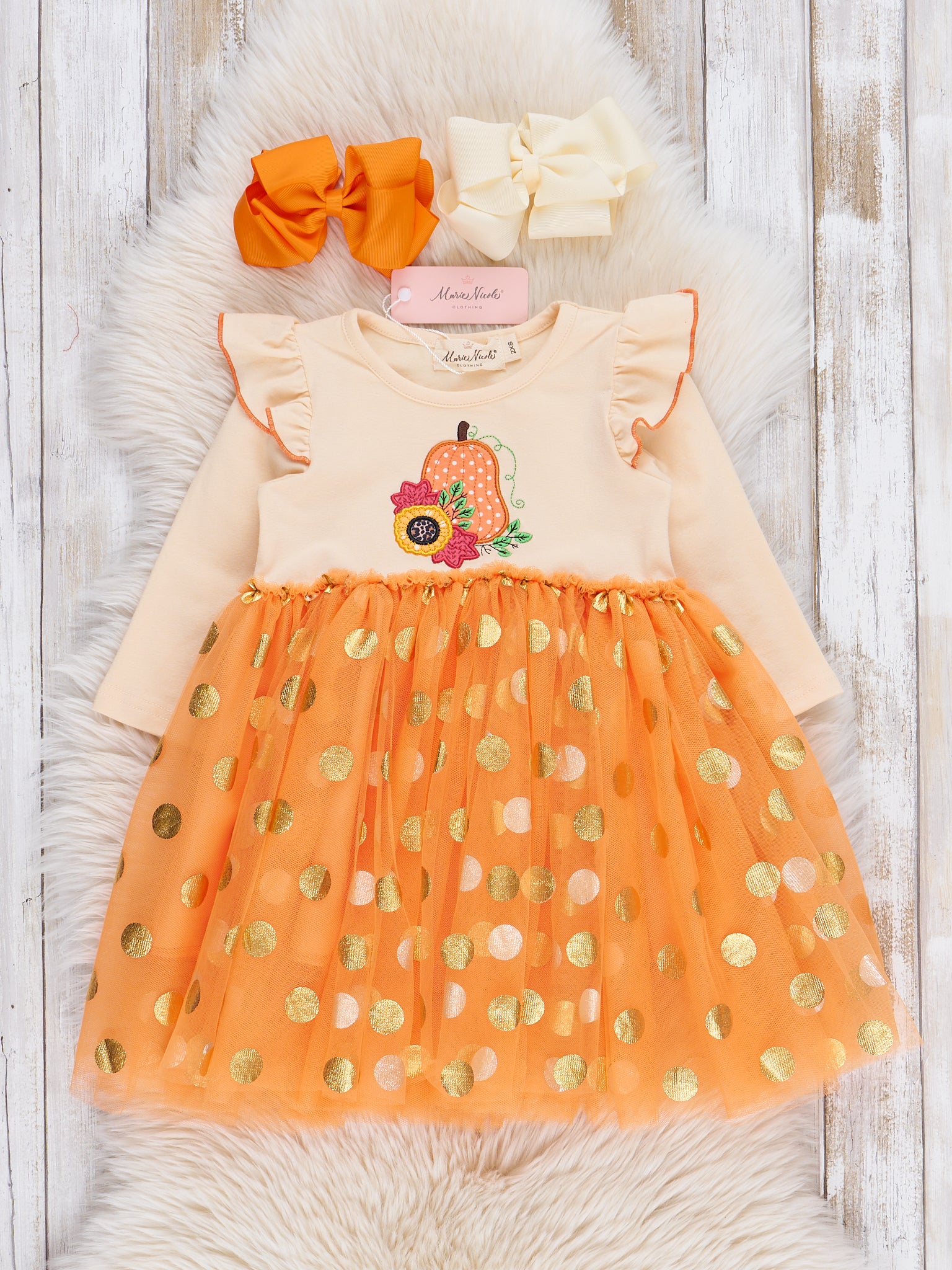 Get your little one ready for fall with this GOURD-eous sister set! The peach bodice features beautifully embroidered autumn gourds, while the orange & gold polka dot tulle skirt adds a playful touch. Perfect for any autumn occasion, this dress is sure to make your child stand out in style.