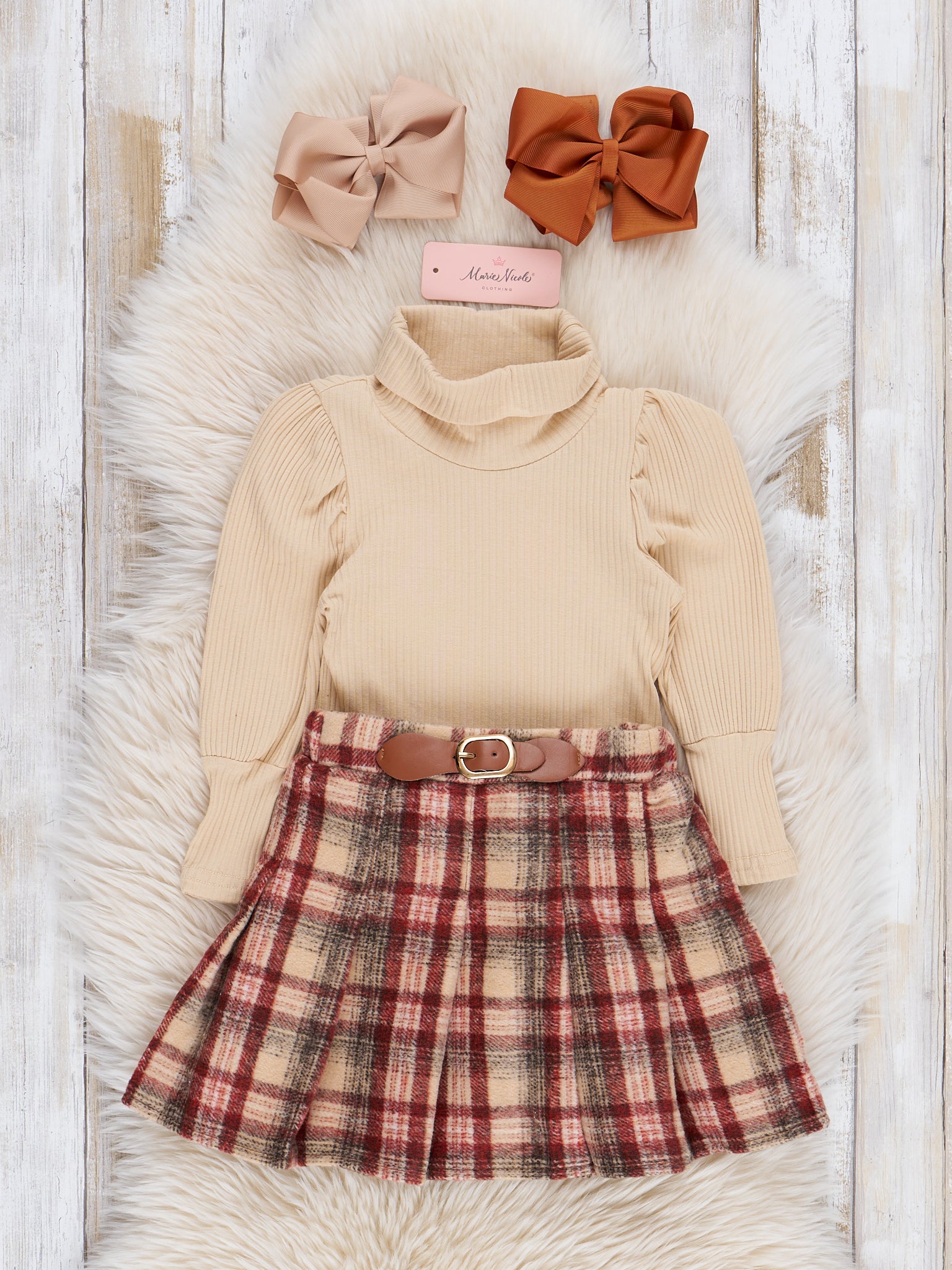 Ribbed Turtleneck & Plaid Skirt Outfit - Cinnamon