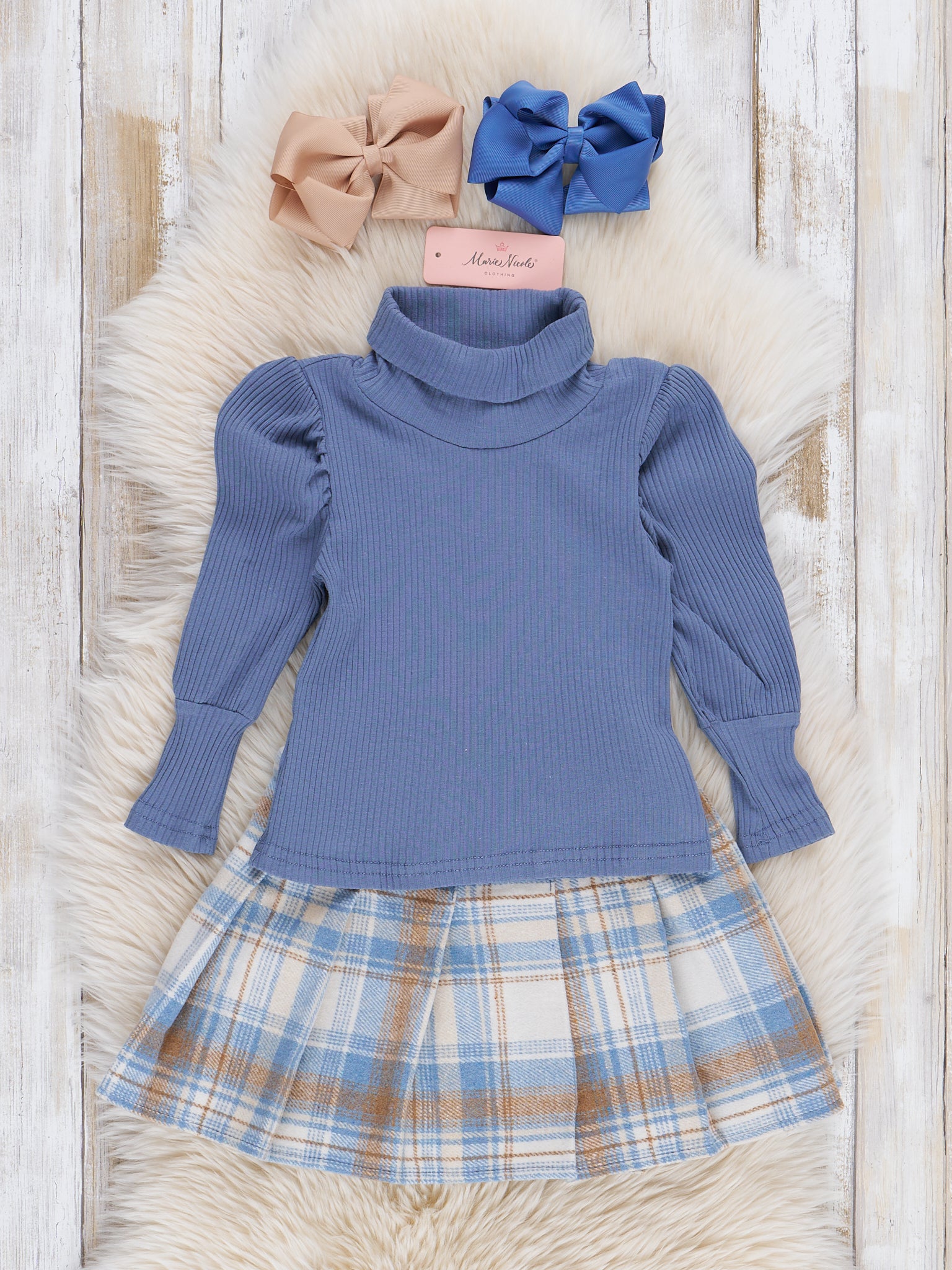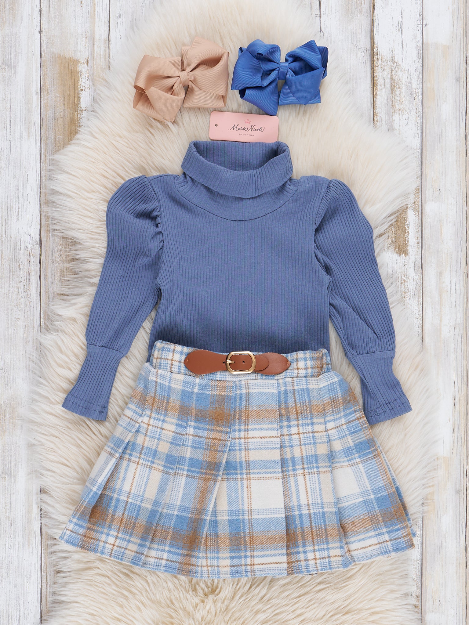 Ribbed Turtleneck & Plaid Skirt Set - Blue