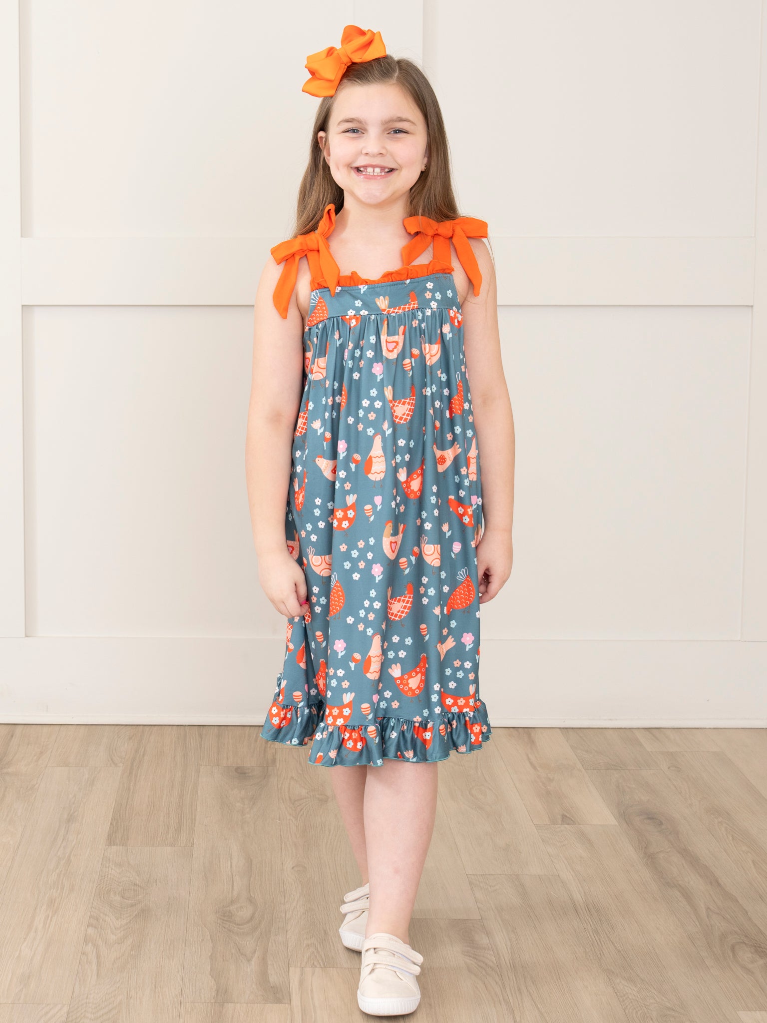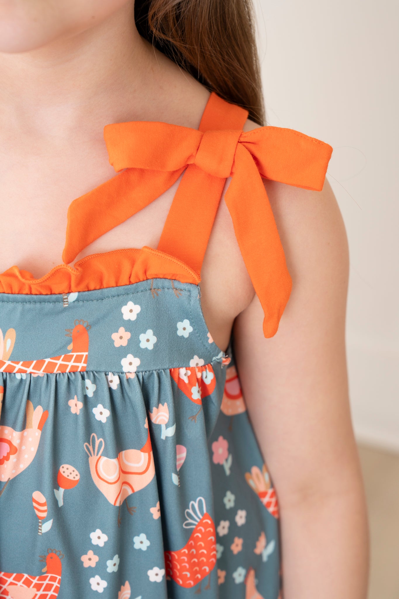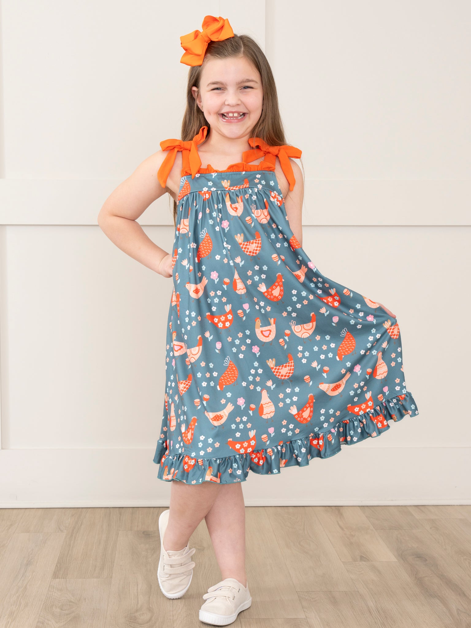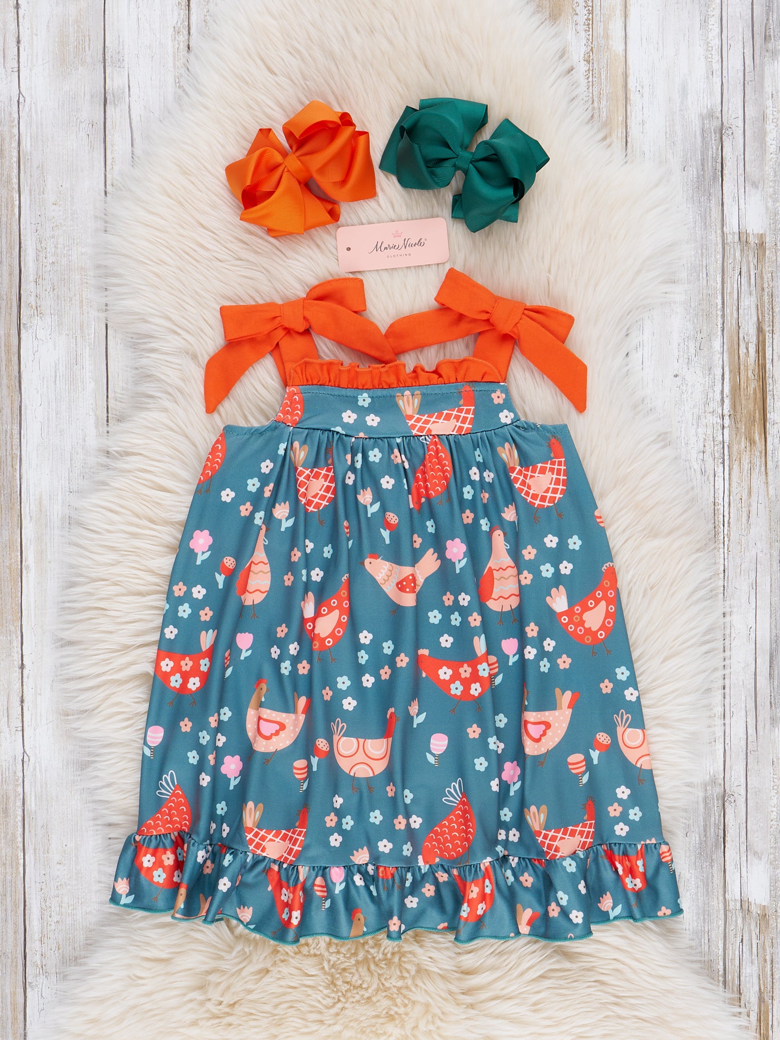 Get ready to cluck up some cuteness with our Whimsical Chickens Bow Dress! Perfect for sisters, this adorable blue dress features a playful chicken print bodice and vibrant orange bow straps. From playdates to parties, this sister set by Marie Nicole Clothing is a must-have for any little chick's wardrobe!