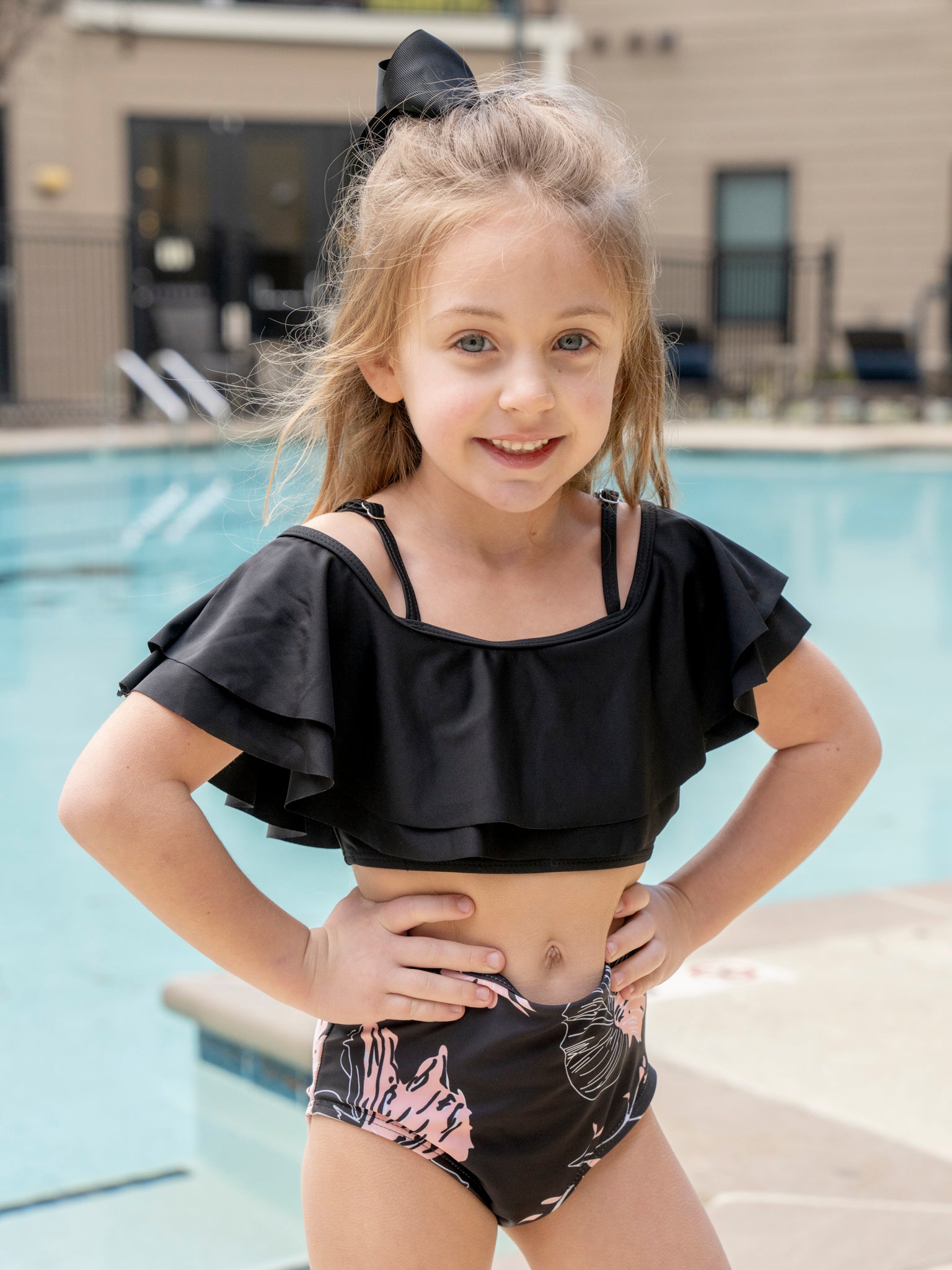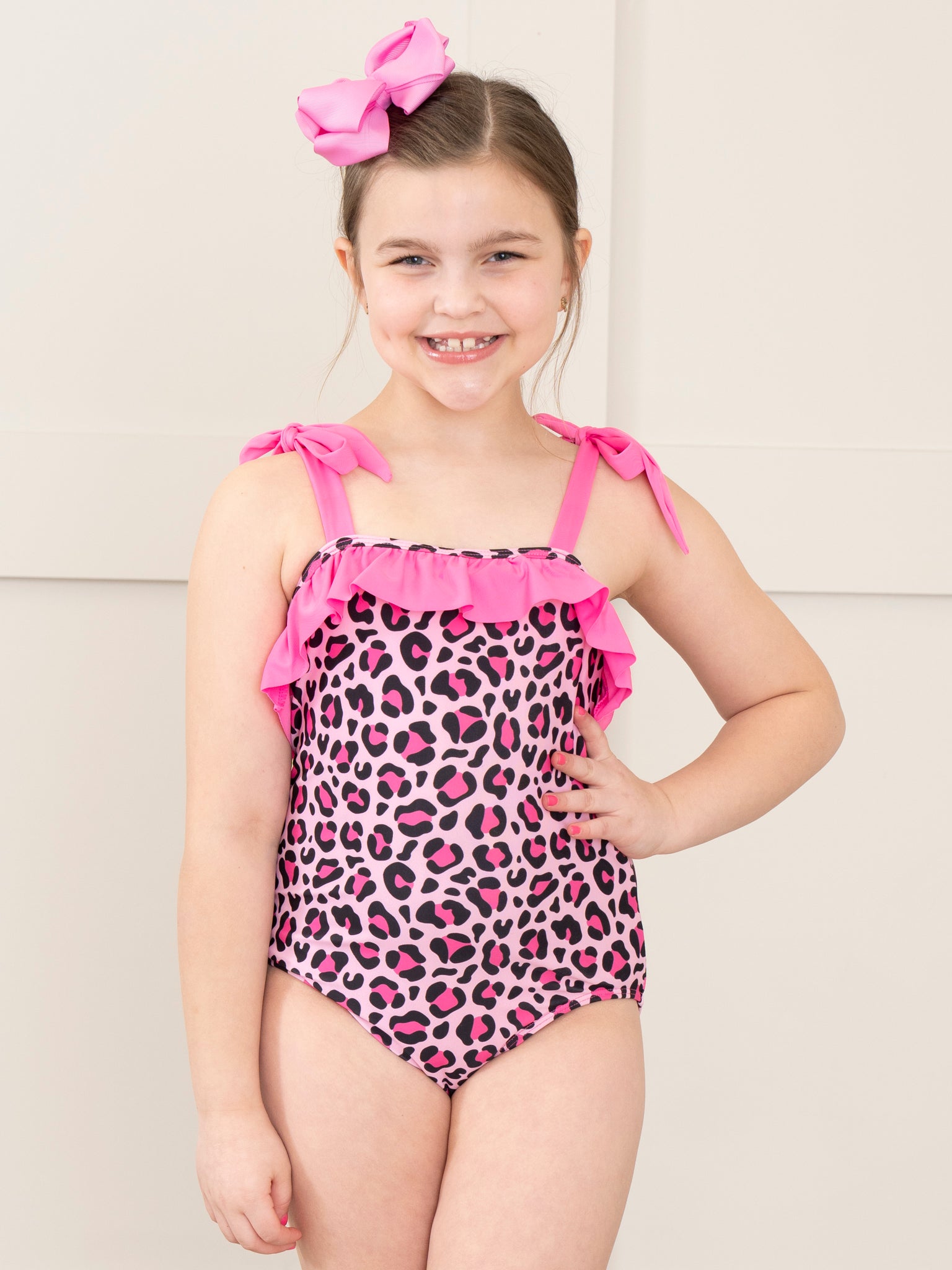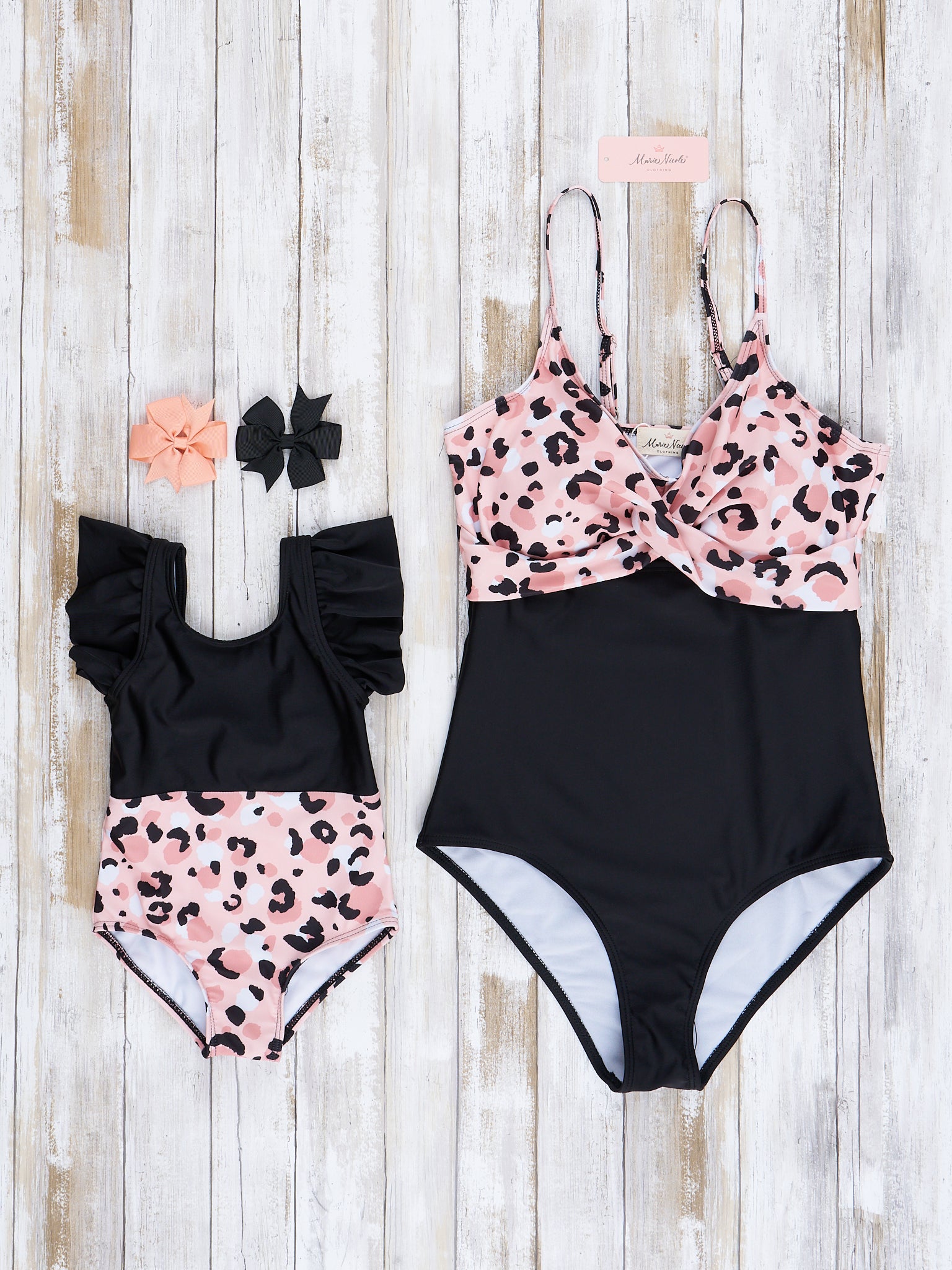 Mom & Me Peach & Black Leopard Ruffle Swimsuit