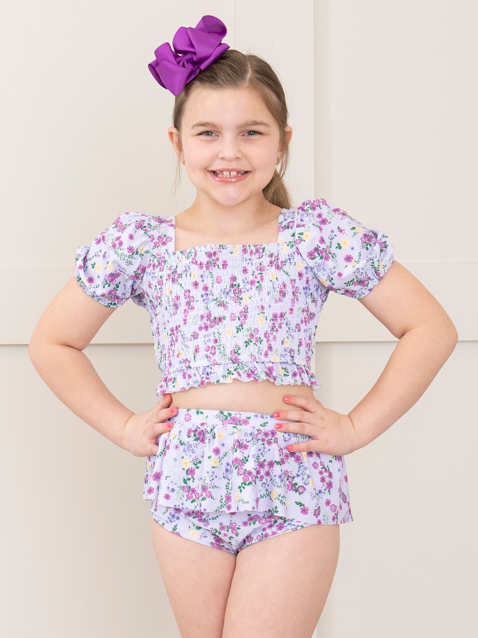 Purple Floral Puff Sleeve Ruffle Swimsuit