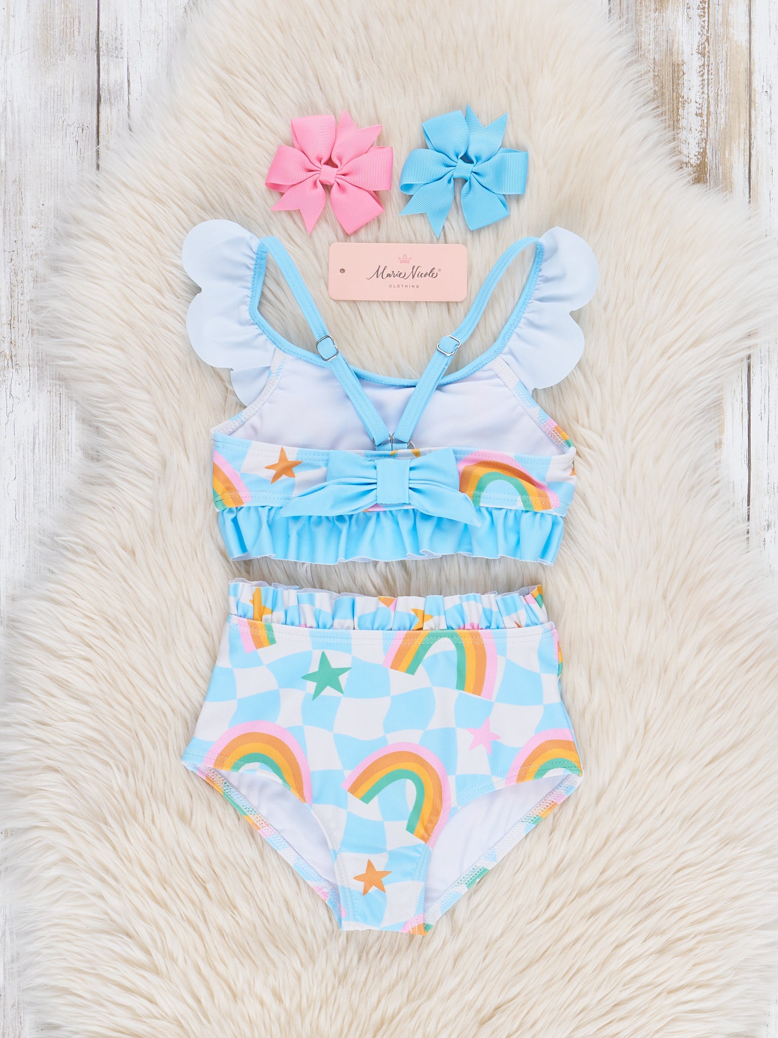The Checkered Rainbows Halter Swimsuit from Marie Nicole Clothing combines retro checkered charm with vibrant, bold rainbows in fun design. Its adjustable straps and fun scalloped trim offer both style and comfort, making it perfect for the beach or pool.