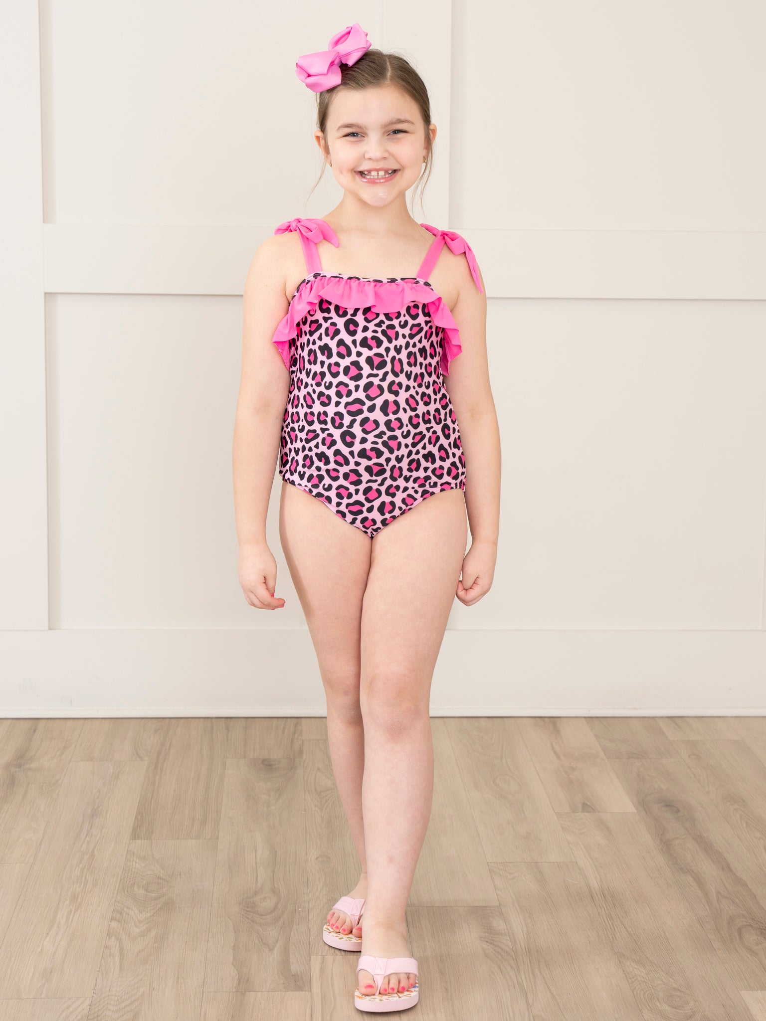 Unleash your wild side with our Hot Leopard Tie Ruffle Swimsuit! This girls one piece is perfect for the beach or pool, with a playful pink leopard print and fun pink ruffle & tie strap details. Stay stylish this summer with Marie Nicole Clothing.