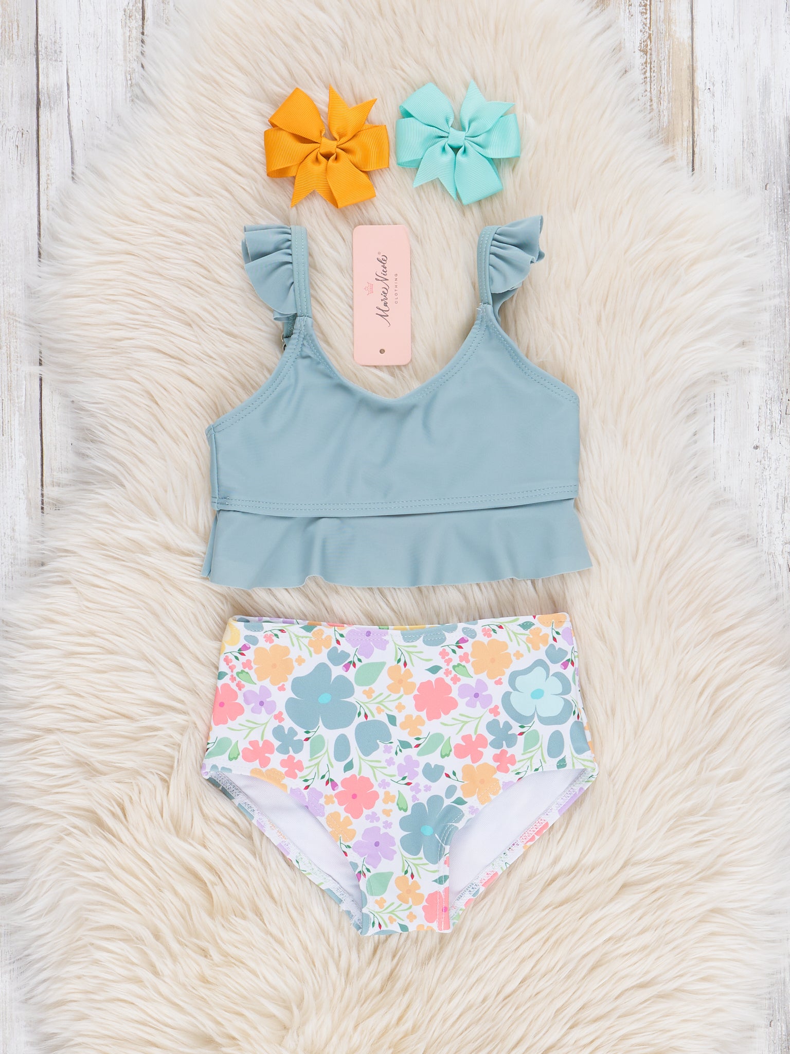 Get ready to make a splash with the Mom & Me Poppy Doodles Swimsuit! This matching set from Marie Nicole Clothing is perfect for summer fun at the beach. The cool blue ruffle top adds a playful touch, while the high-waisted bottoms feature a fun poppy doodle print. Now you and mom can rock the beach together in style.