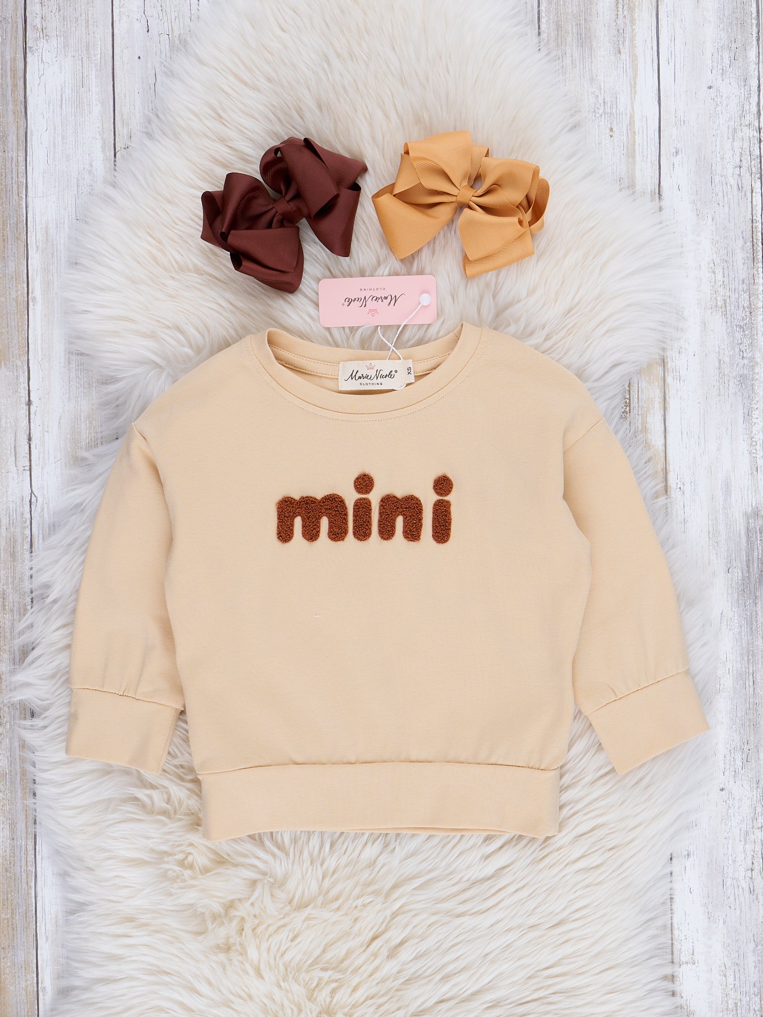 Elevate your little one's style with our Beige "Mini" Shirt! Made for girls, this long sleeve shirt features a trendy beige color and a cute chenille "mini" design. Perfect for casual wear, your child will love showing off their stylish side in this playful top. By Marie Nicole Clothing.