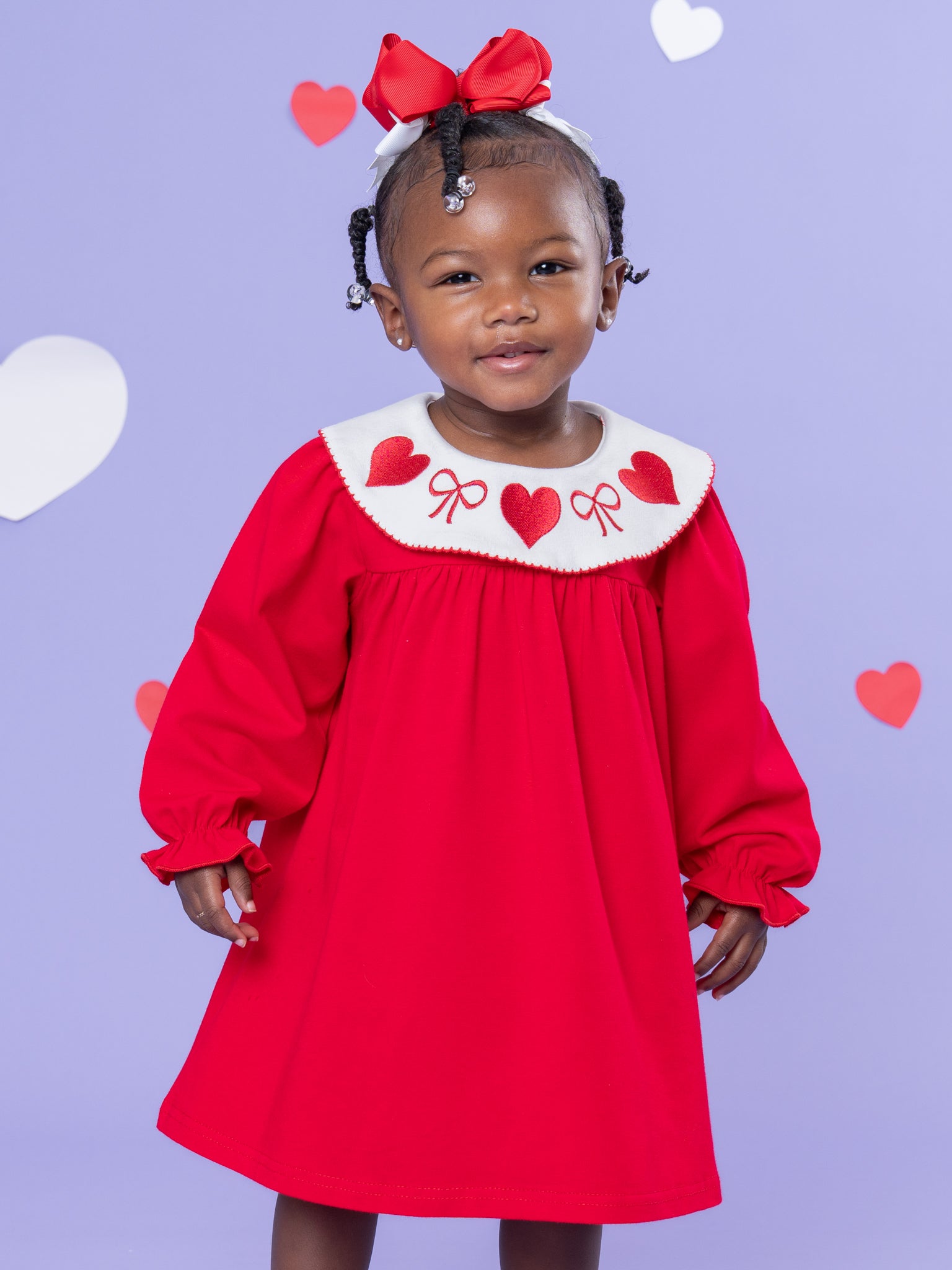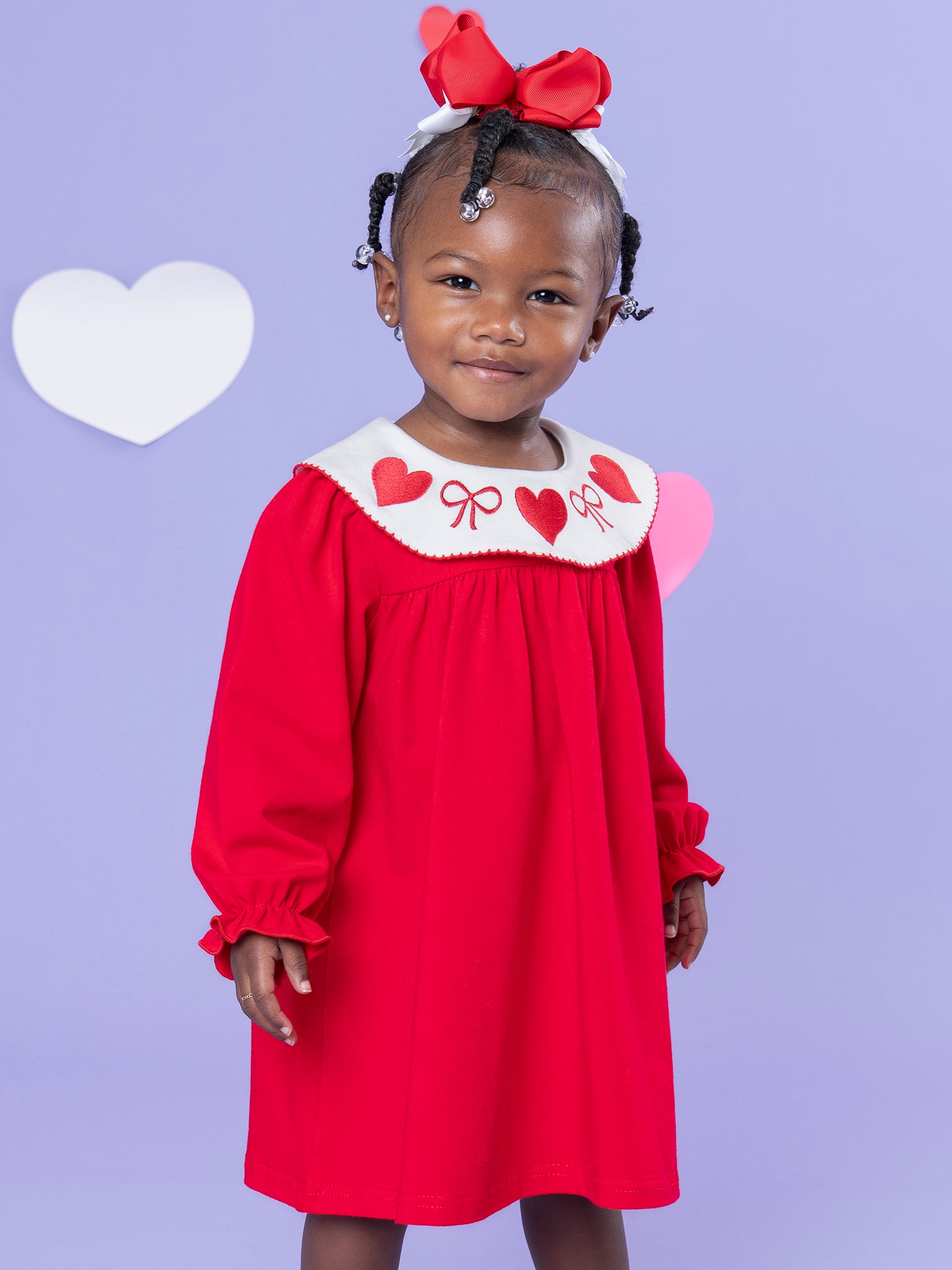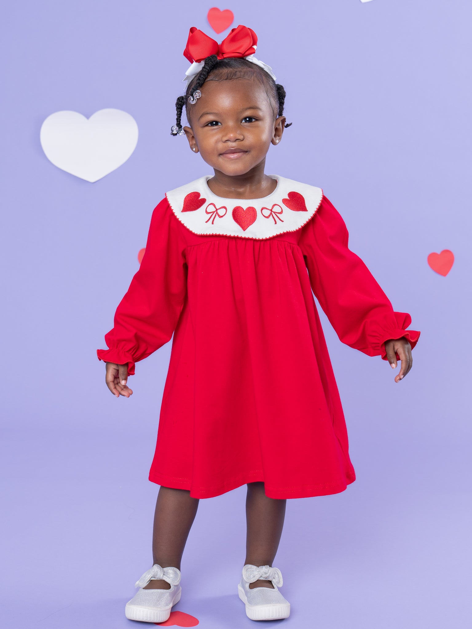 Ribbons & Hearts Embroidered Dress by Marie Nicole Clothing features a beautifully gathered silhouette with an eye-catching collar, detailed with delicately embroidered hearts and ribbon accents. This charming dress is perfect for special celebrations, Valentine's Day, or treasured moments, offering a blend of vintage-inspired style and playful sweetness.