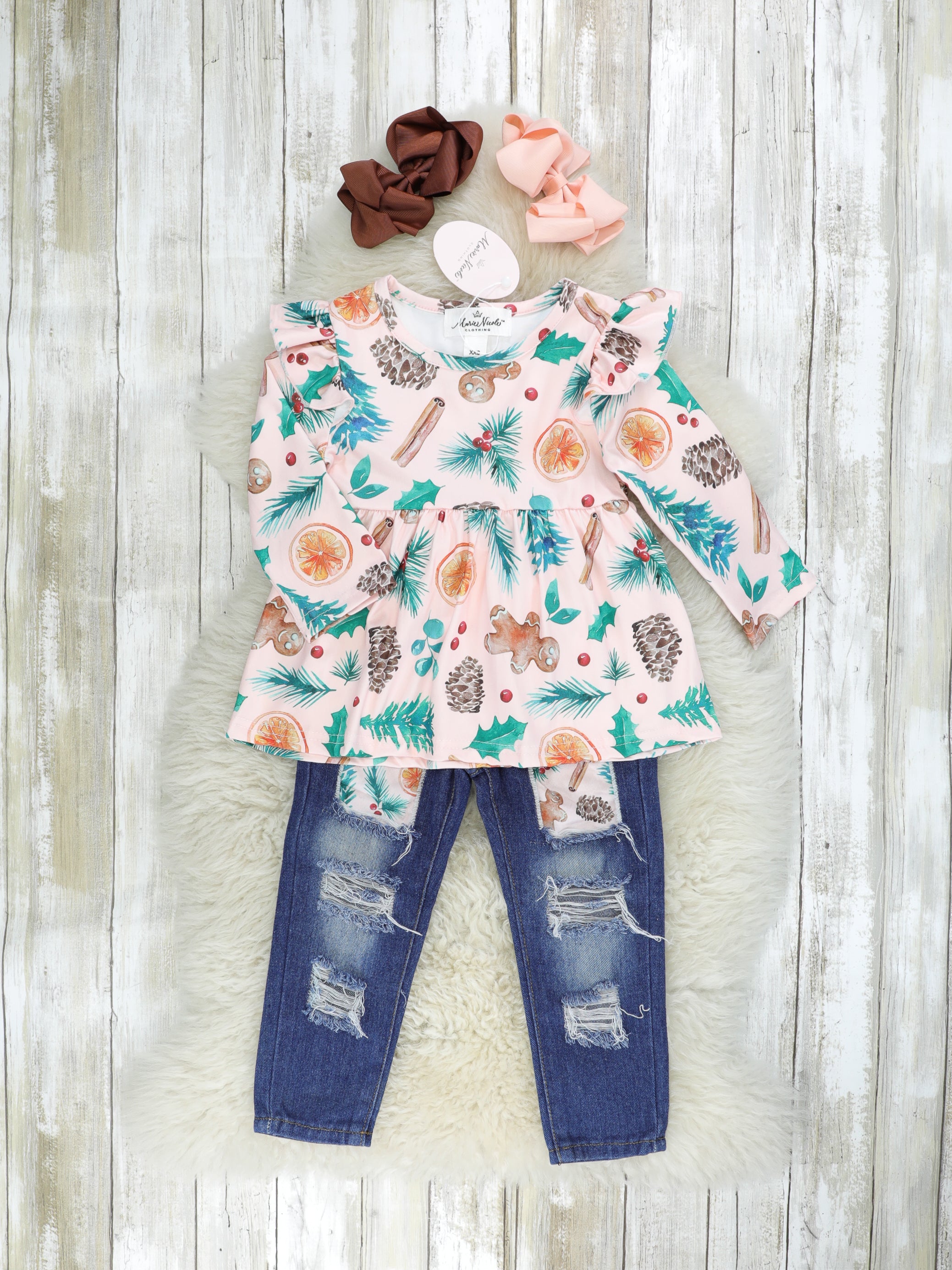 The sweetest sibling set for your sweets! This outfit features a Gingerbread peplum top with flutter trim, distressed denim pants with matching patches, & a green ribbon belt.