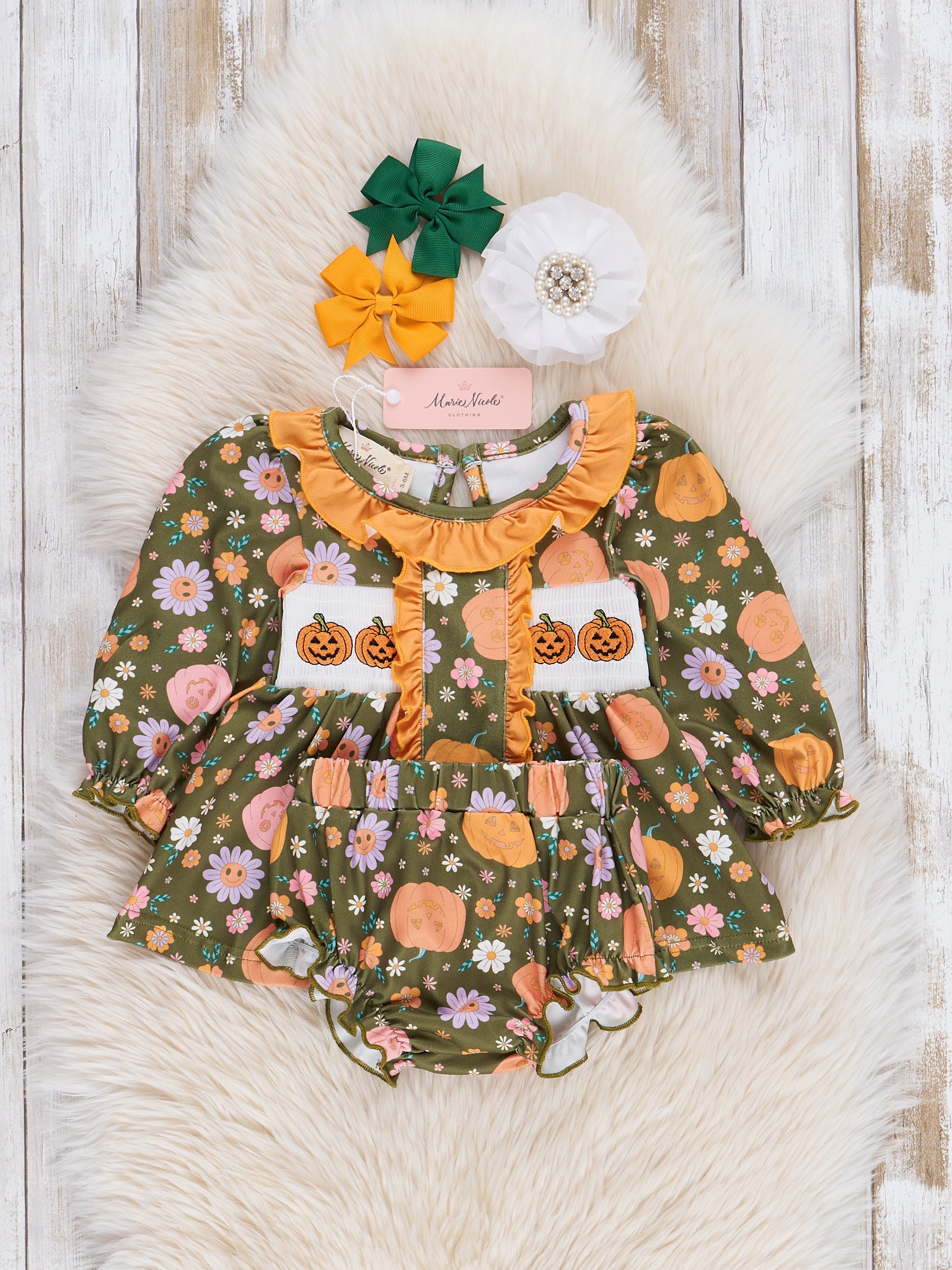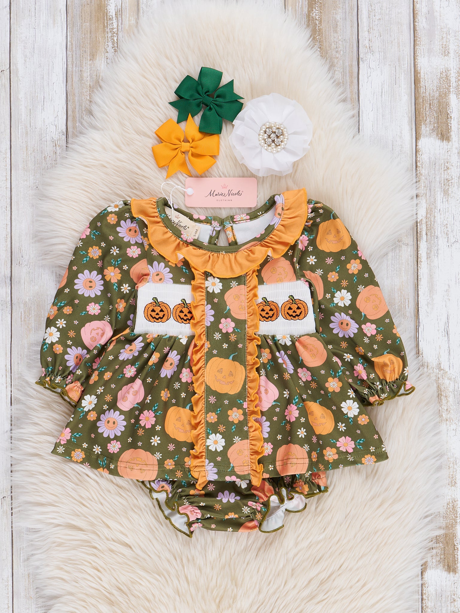 Green Jack-o-Lantern Garden Smocked Bloomers Outfit