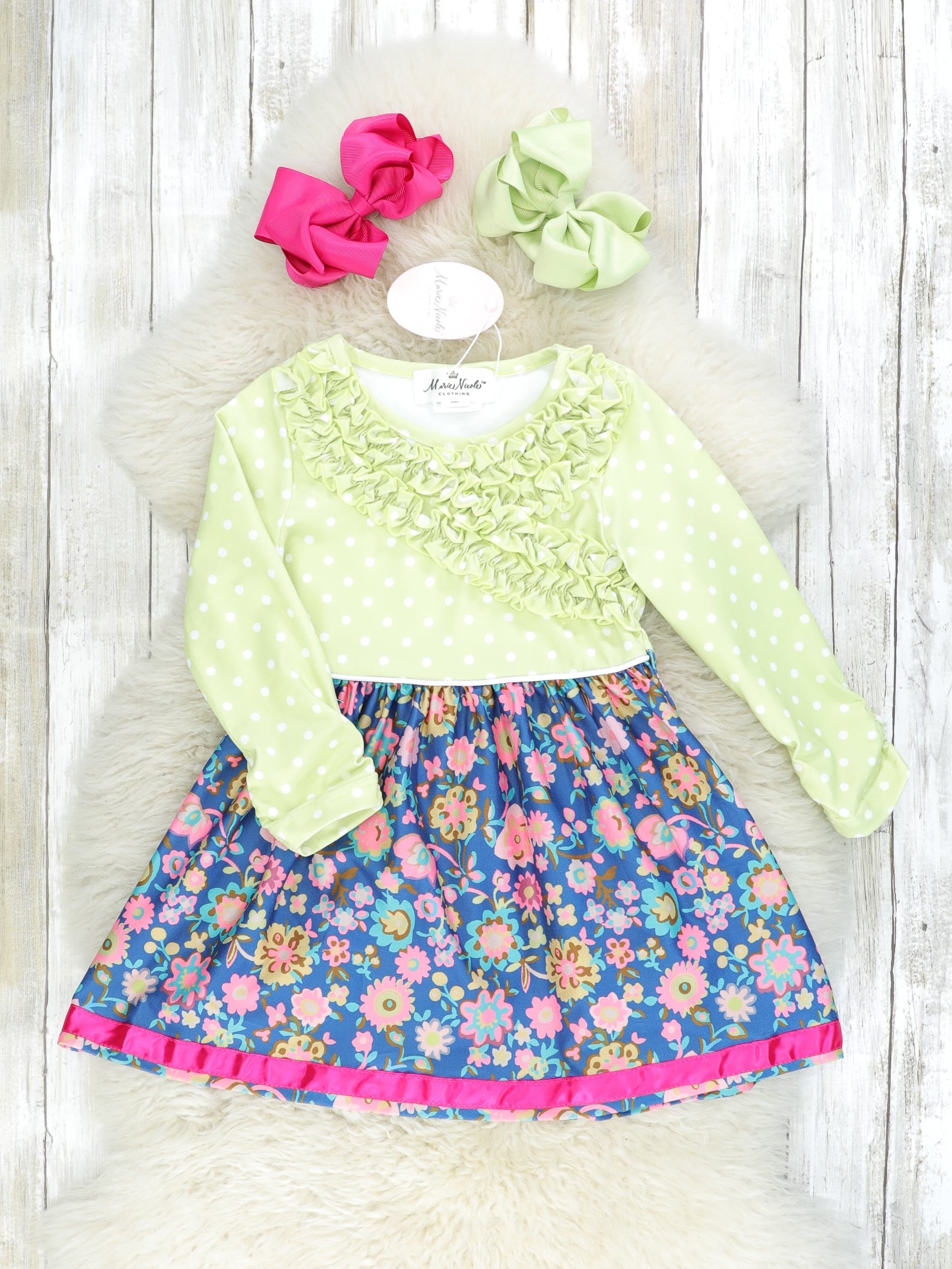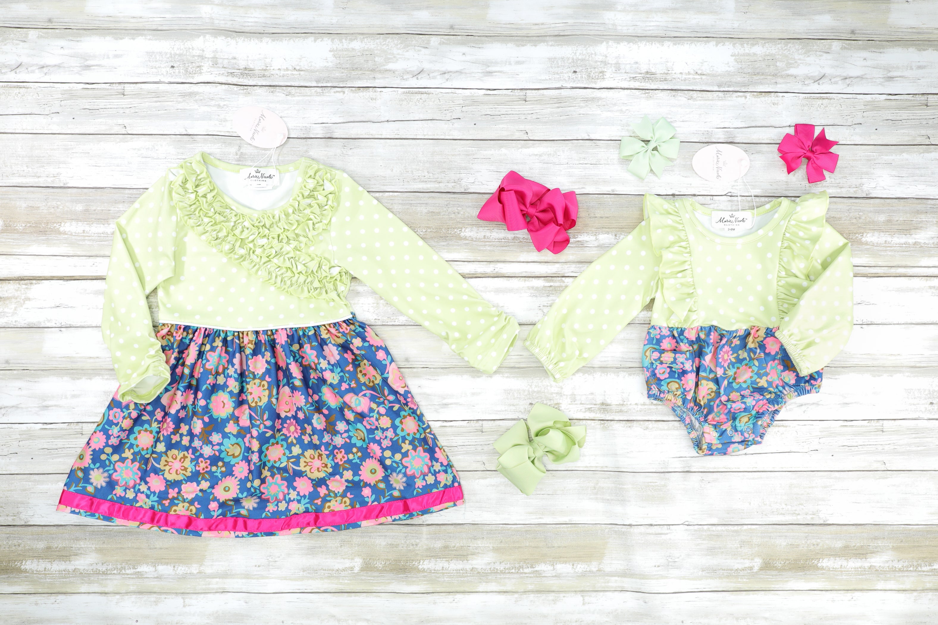 Home › Green, Navy & Pink Floral Ruffle Sister Set