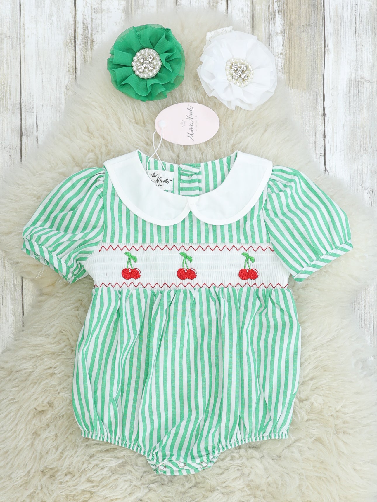 Green Pinstriped Smocked Cherry Bubble