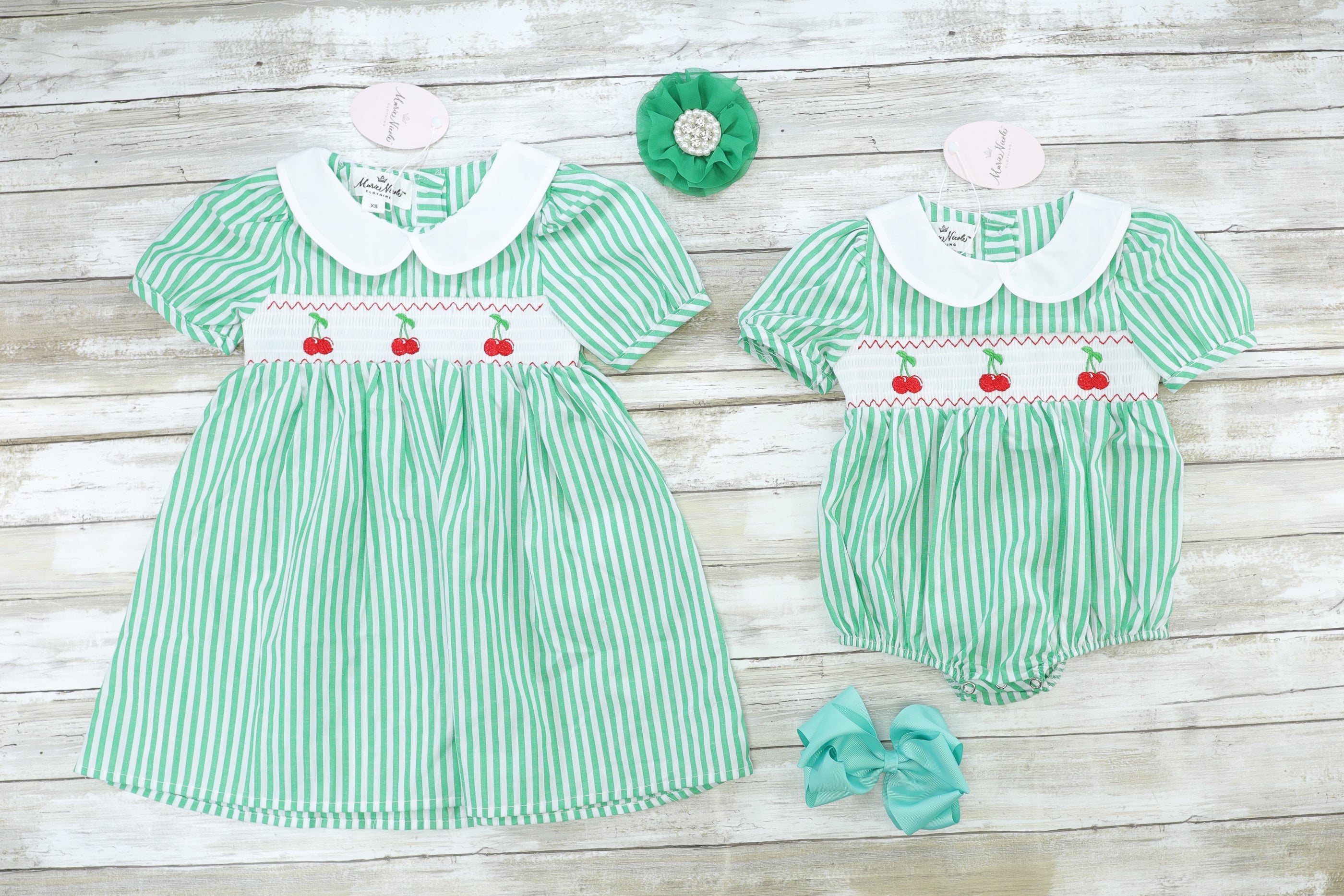 Green Pinstriped Smocked Cherry Sister Set