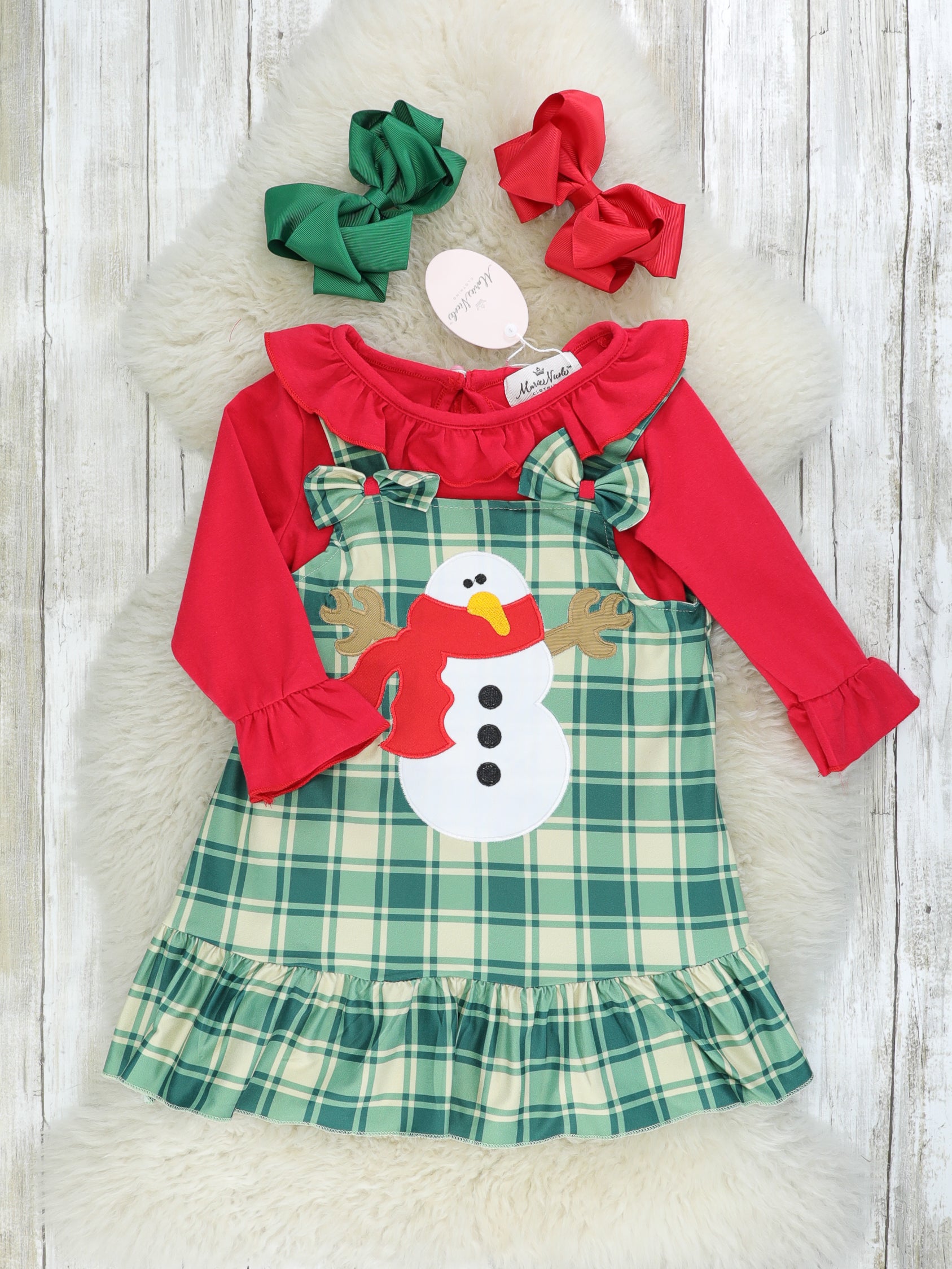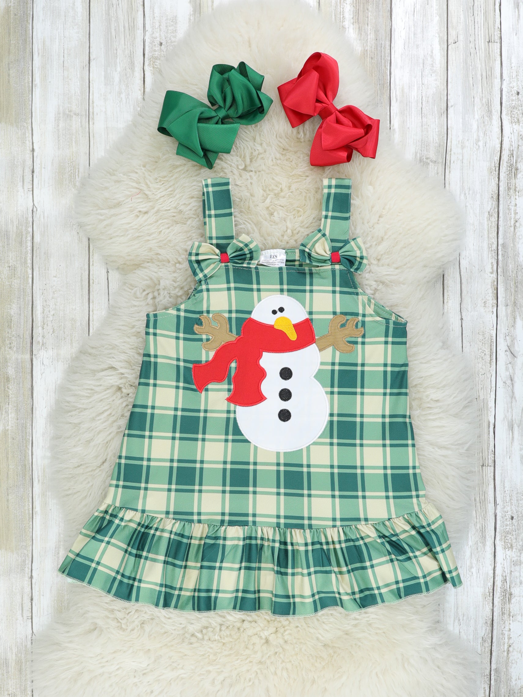 Green Plaid Snowman Ruffle Dress W/ Red Shirt