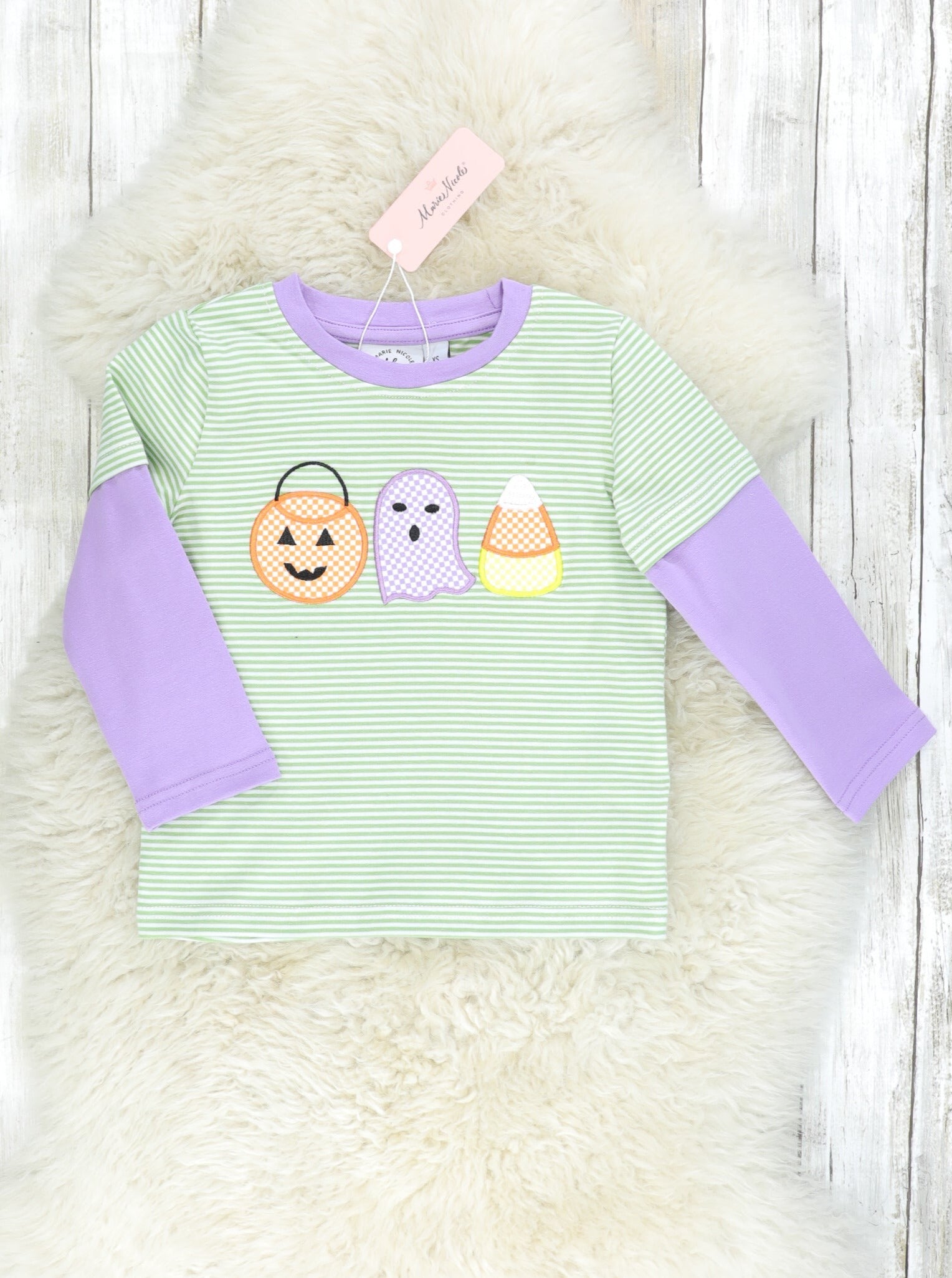 Jack-o-lantern, Ghost, & Candy Corn- OH MY! This green shirt features purple sleeves & trim details. Grab the cutest outfits for each of the kiddos!