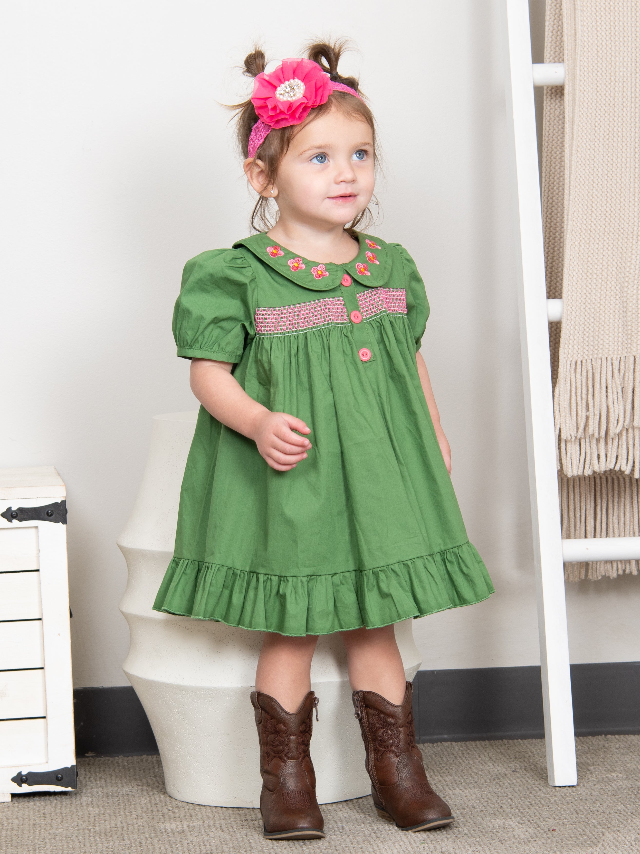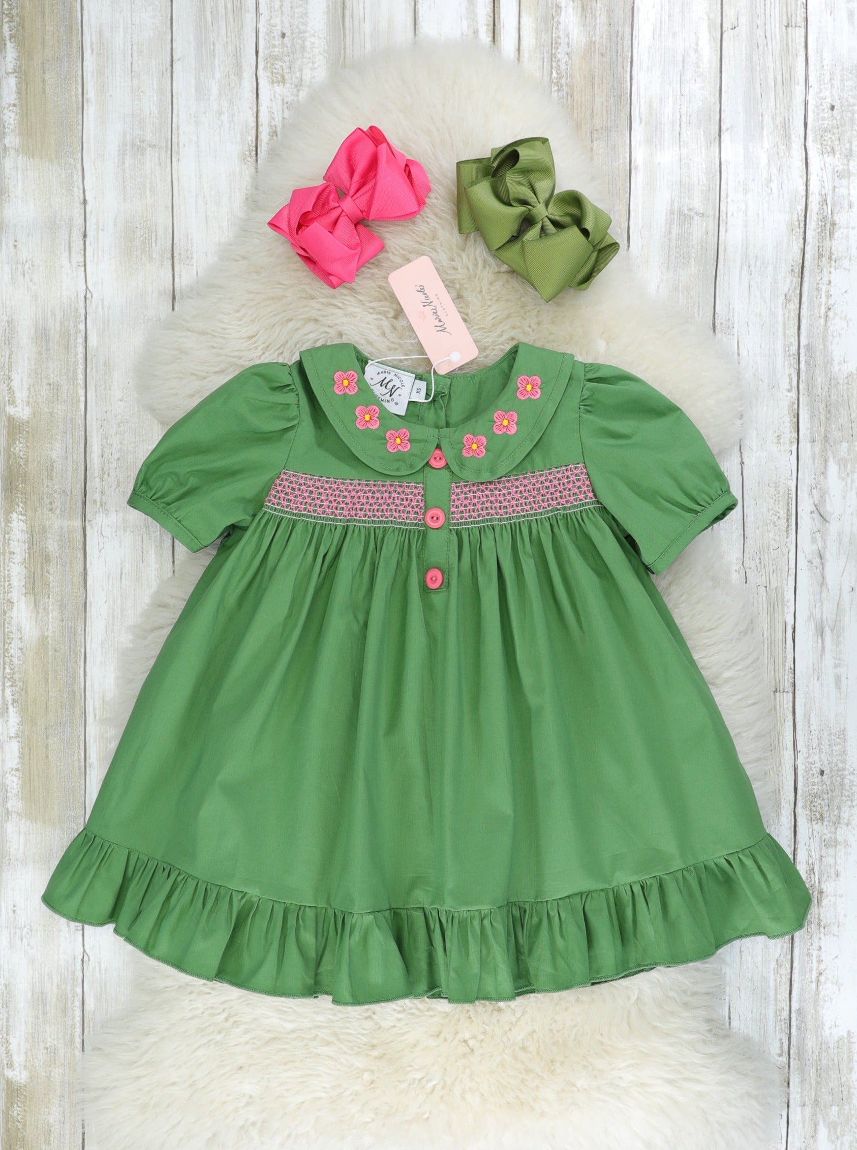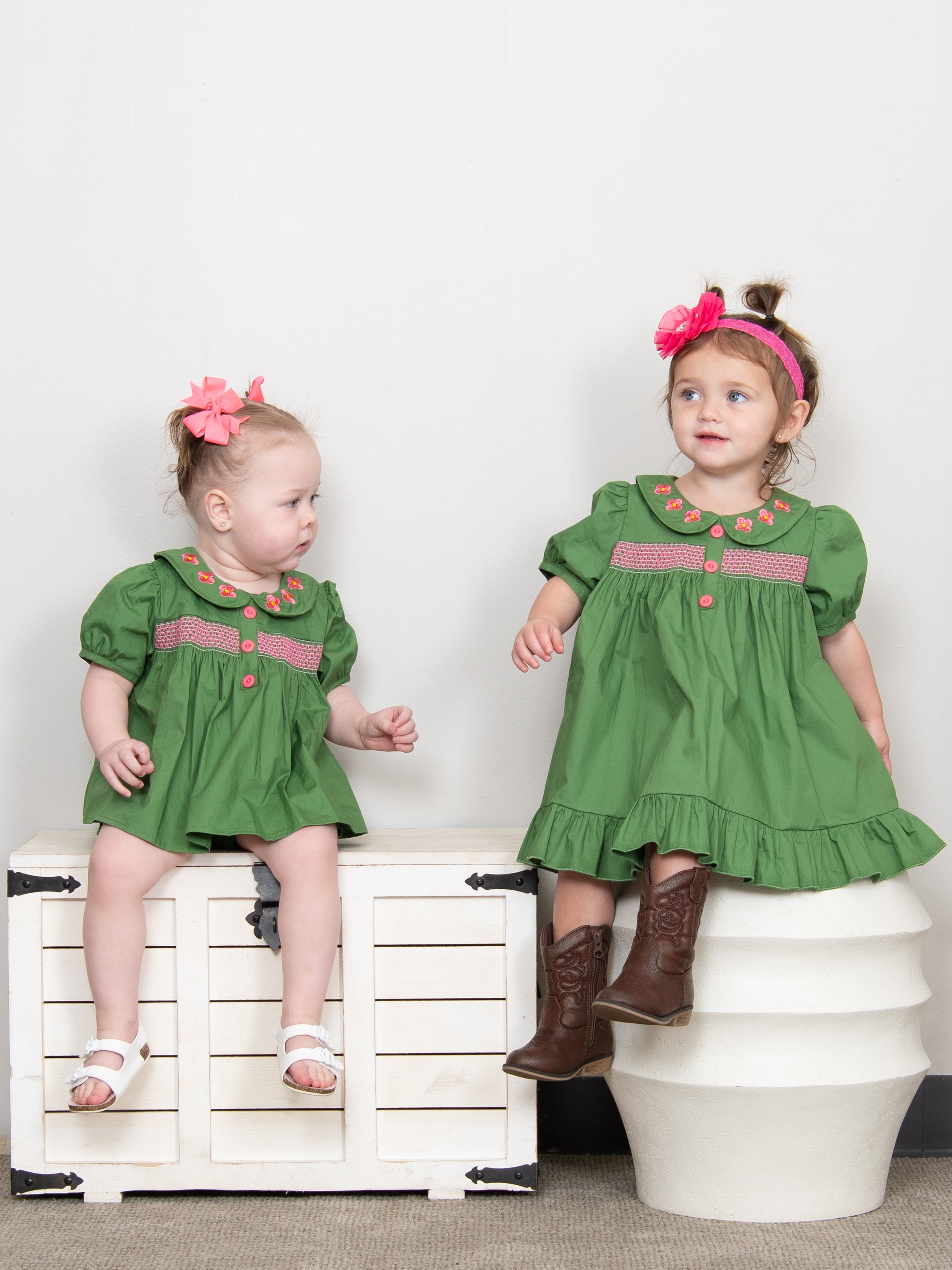 This charming sister set is perfect for spring pictures! This green dress features smocking, embroidered flowers, a peter pan collar, buttons, & ruffle trim.