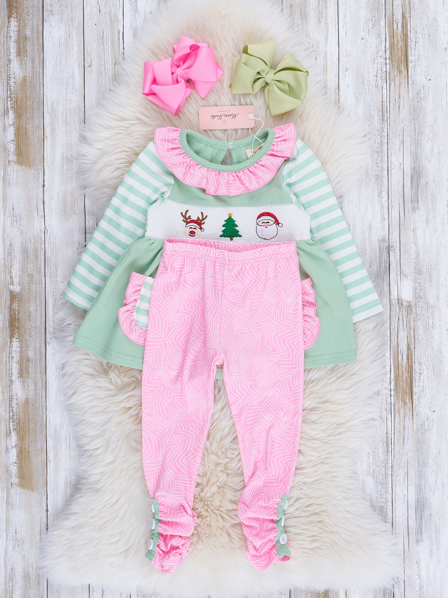 Home › Green Stripe Season's Greetings Smocked Sibling Set