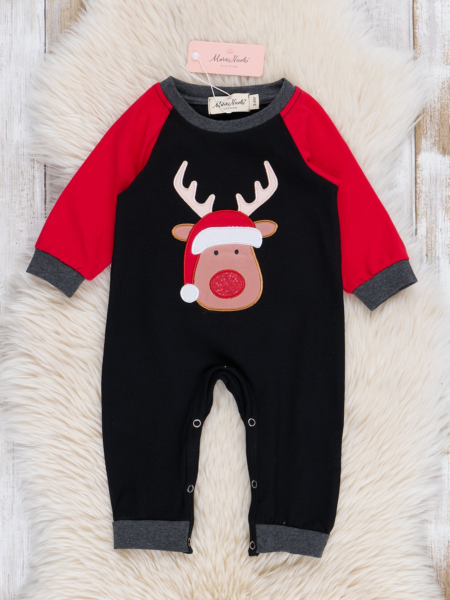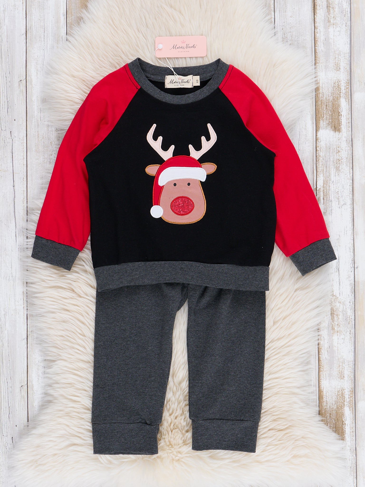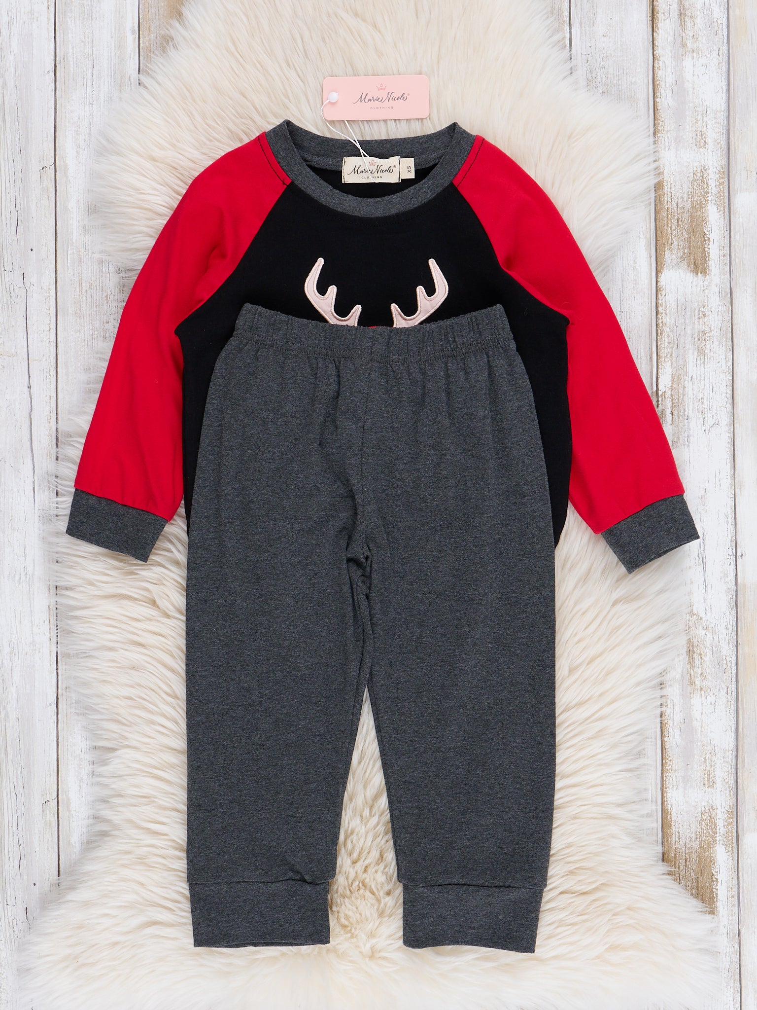 Grey & Red Embroidered Reindeer Raglan Outfit
