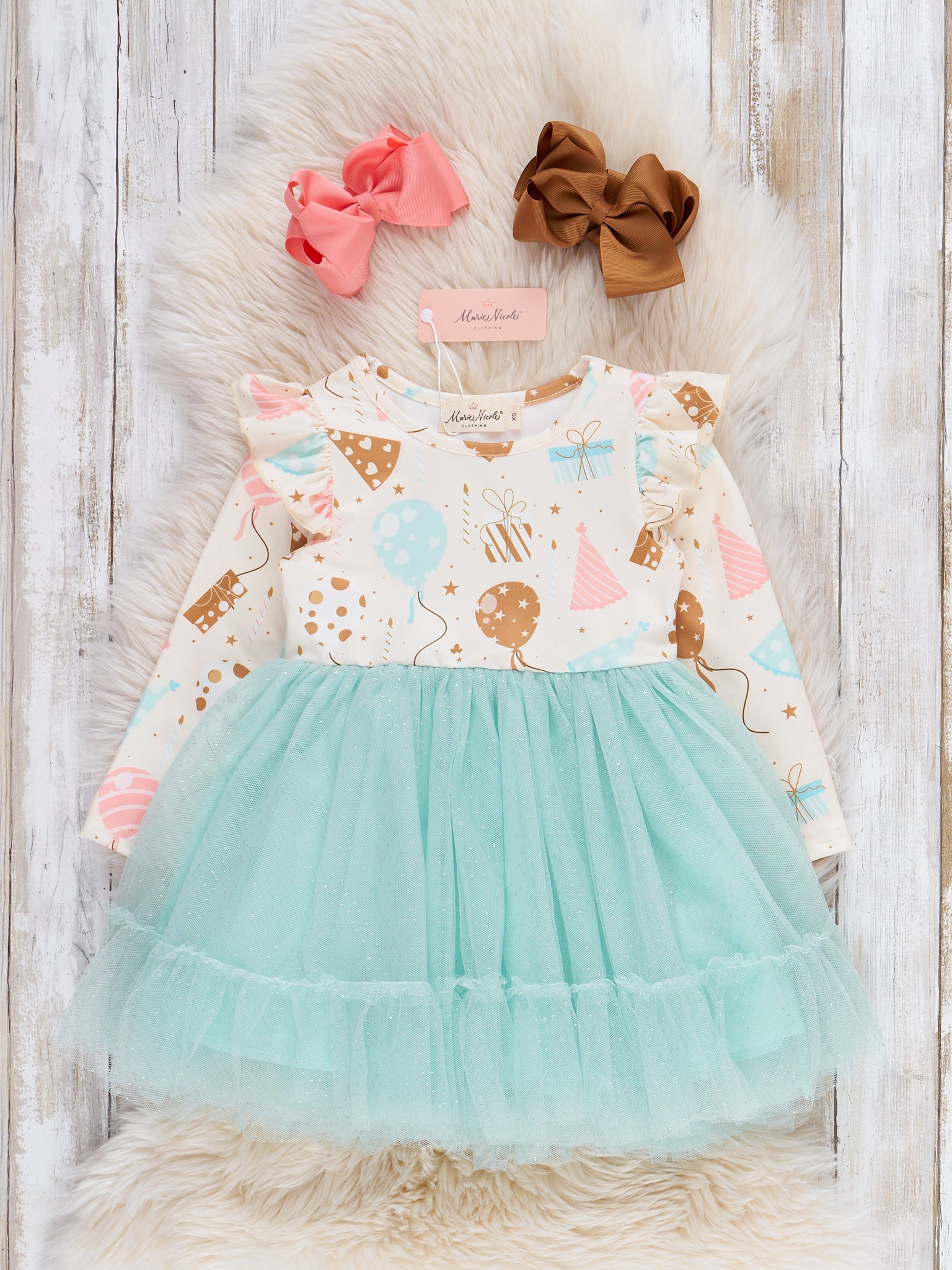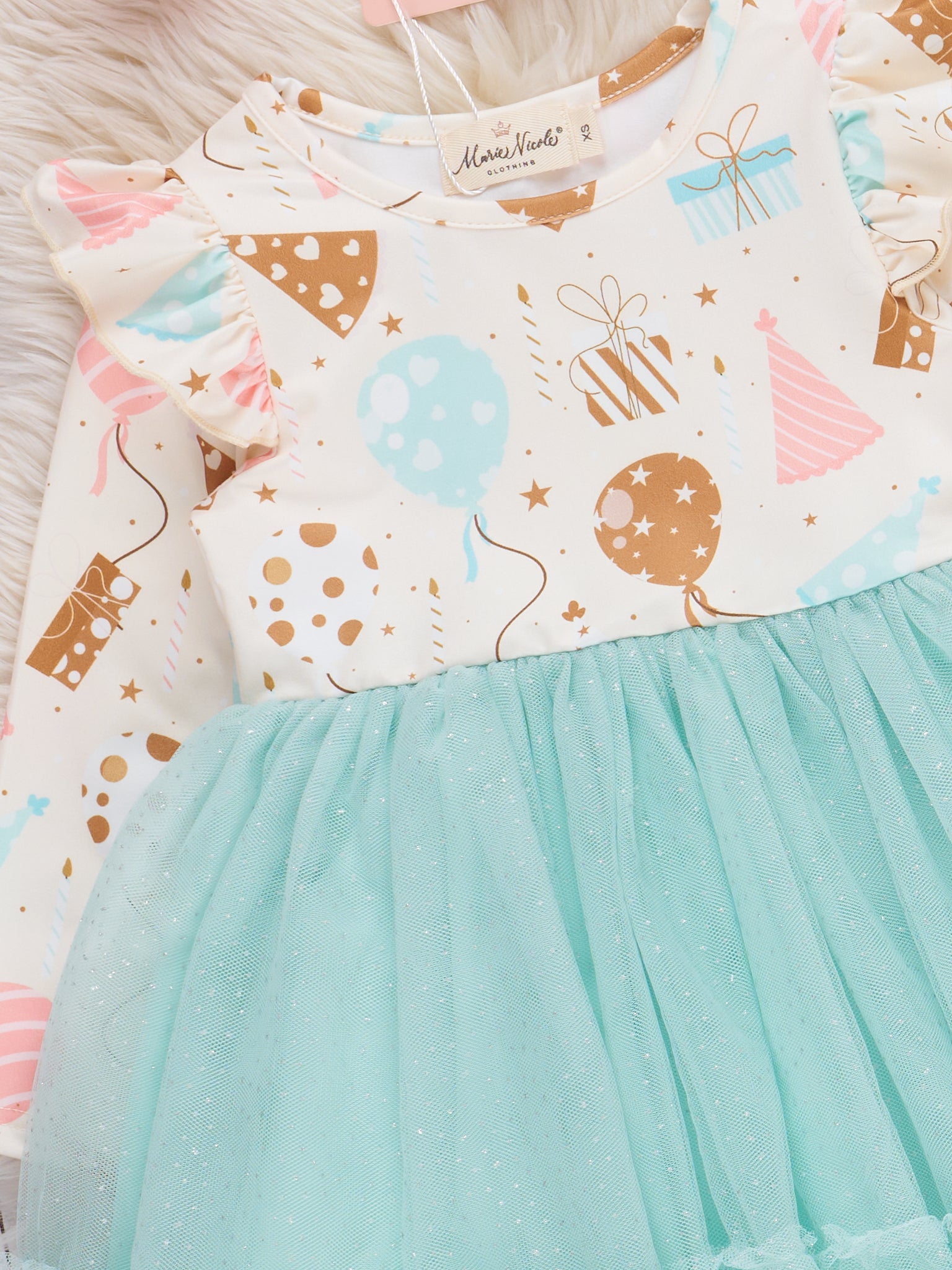 The Birthday Cheer Tulle Dress by Marie Nicole is a charming long-sleeve dress featuring a soft printed bodice with festive party designs of confetti, hats, and balloons. The dress is accented with delicate ruffles at the shoulders and a full, layered tulle skirt for a playful, magical look perfect for special occasions or everyday fun.