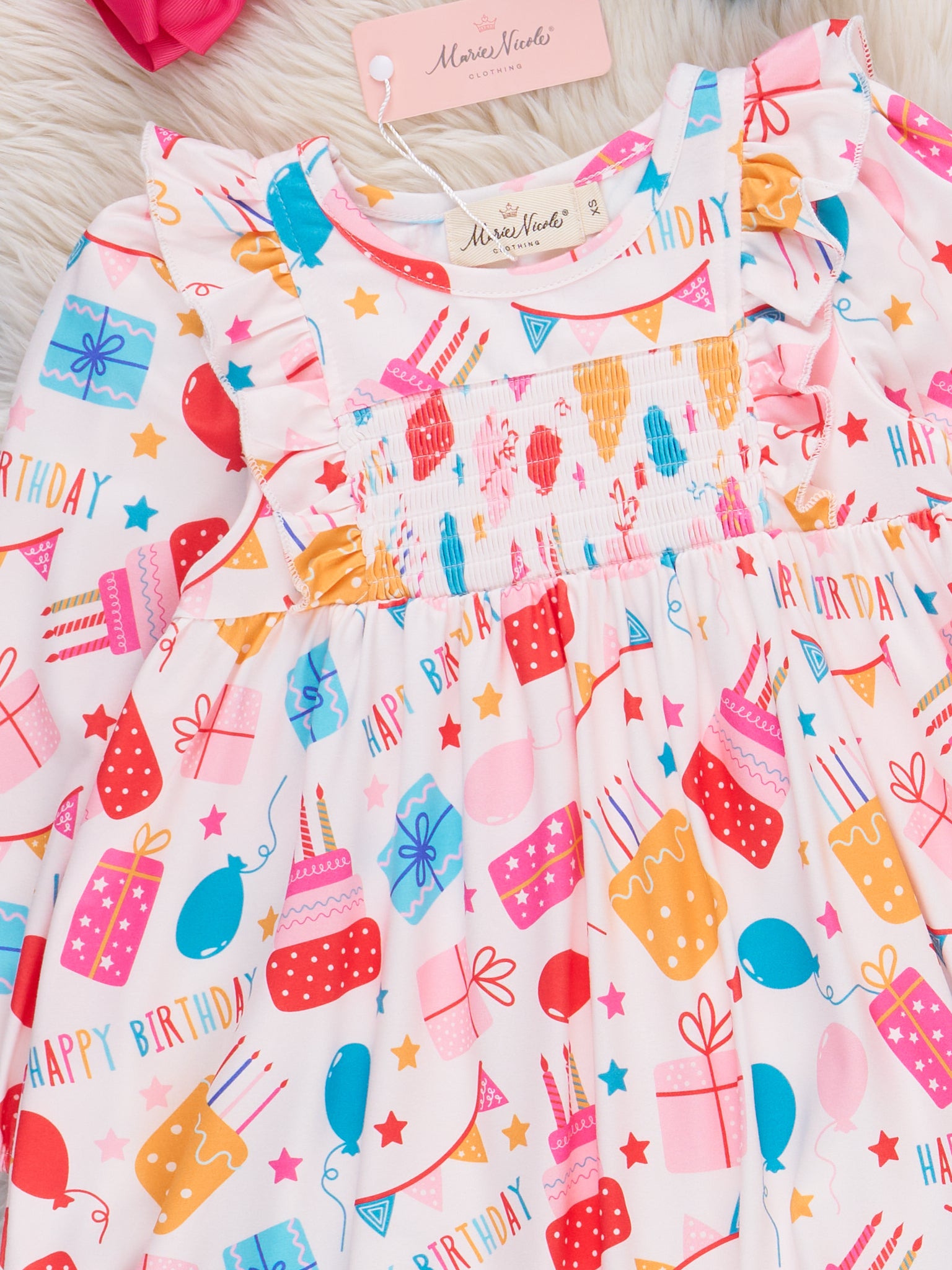 The Birthday Fun Balloon Ruffle Dress by Marie Nicole features a festive party print with balloons, gifts, and whimsical birthday motifs on a classic long-sleeve, gathered silhouette. Adorned with playful ruffle details at the shoulders, this dress is designed to bring extra cheer to any celebration