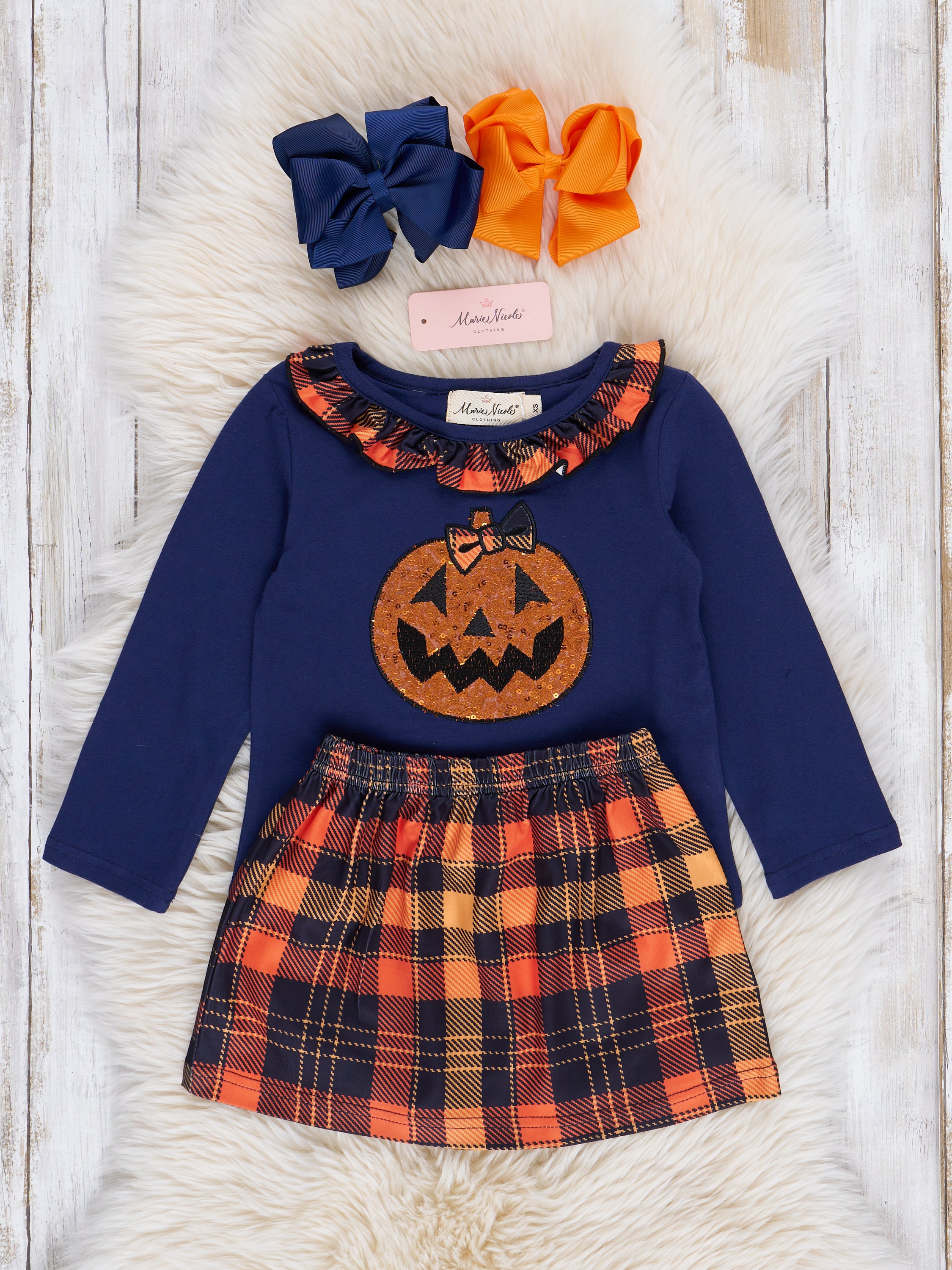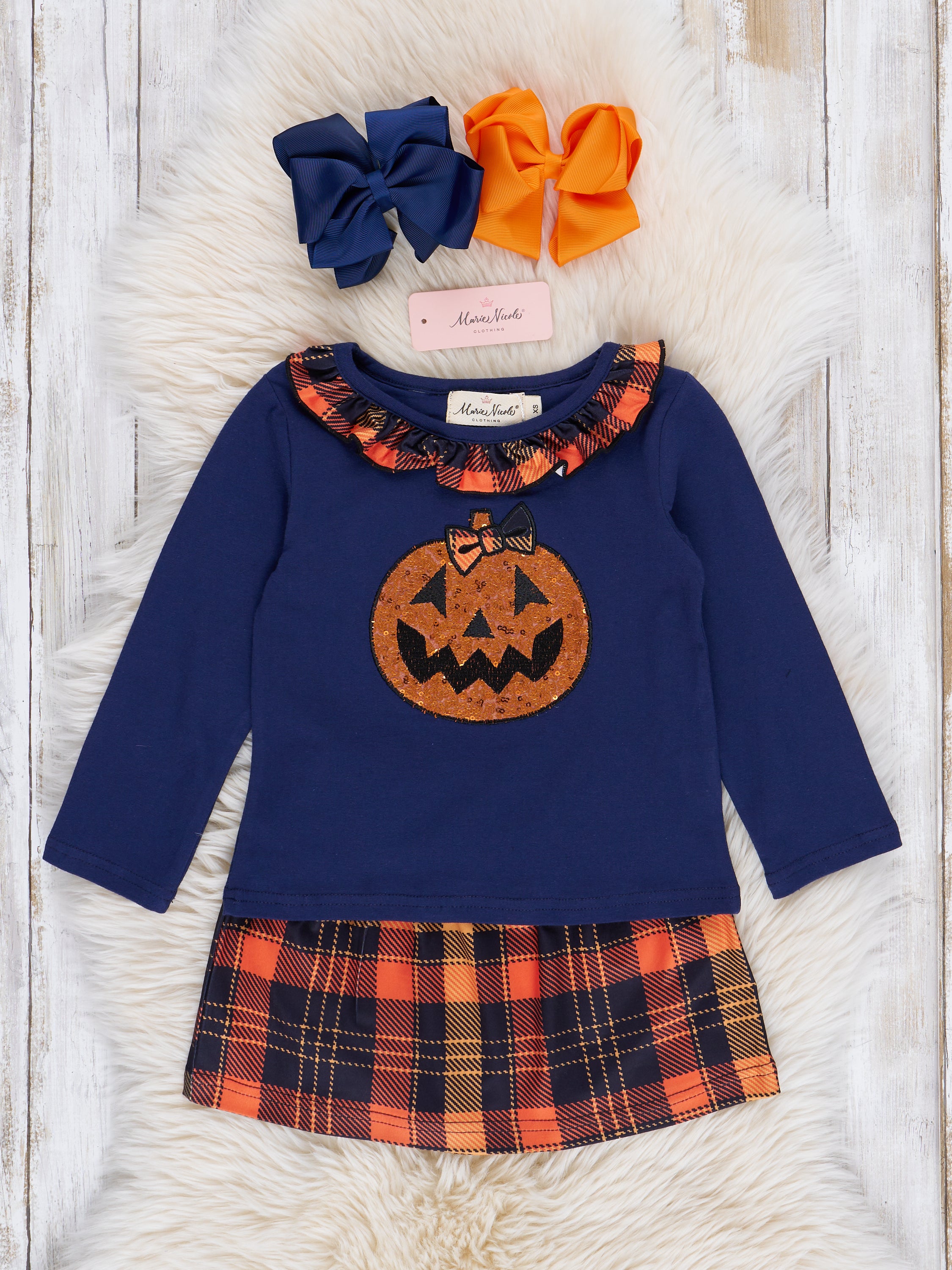 This charming sibling set is perfect for a trip to the pumpkin patch! This outfit features a long sleeve shirt with the cutest embroidered pumpkin and color block sleeves, plus perfectly matching plaid skirt with an elastic waistband.