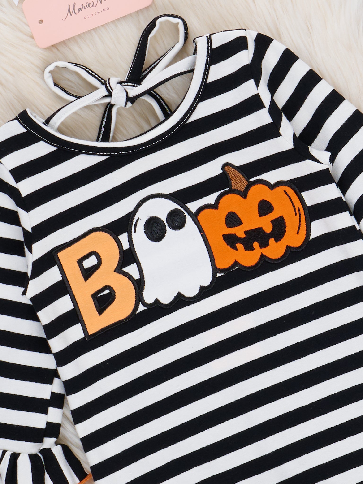 Striped Boo & Pumpkin Embroidered Ruffle Romper
