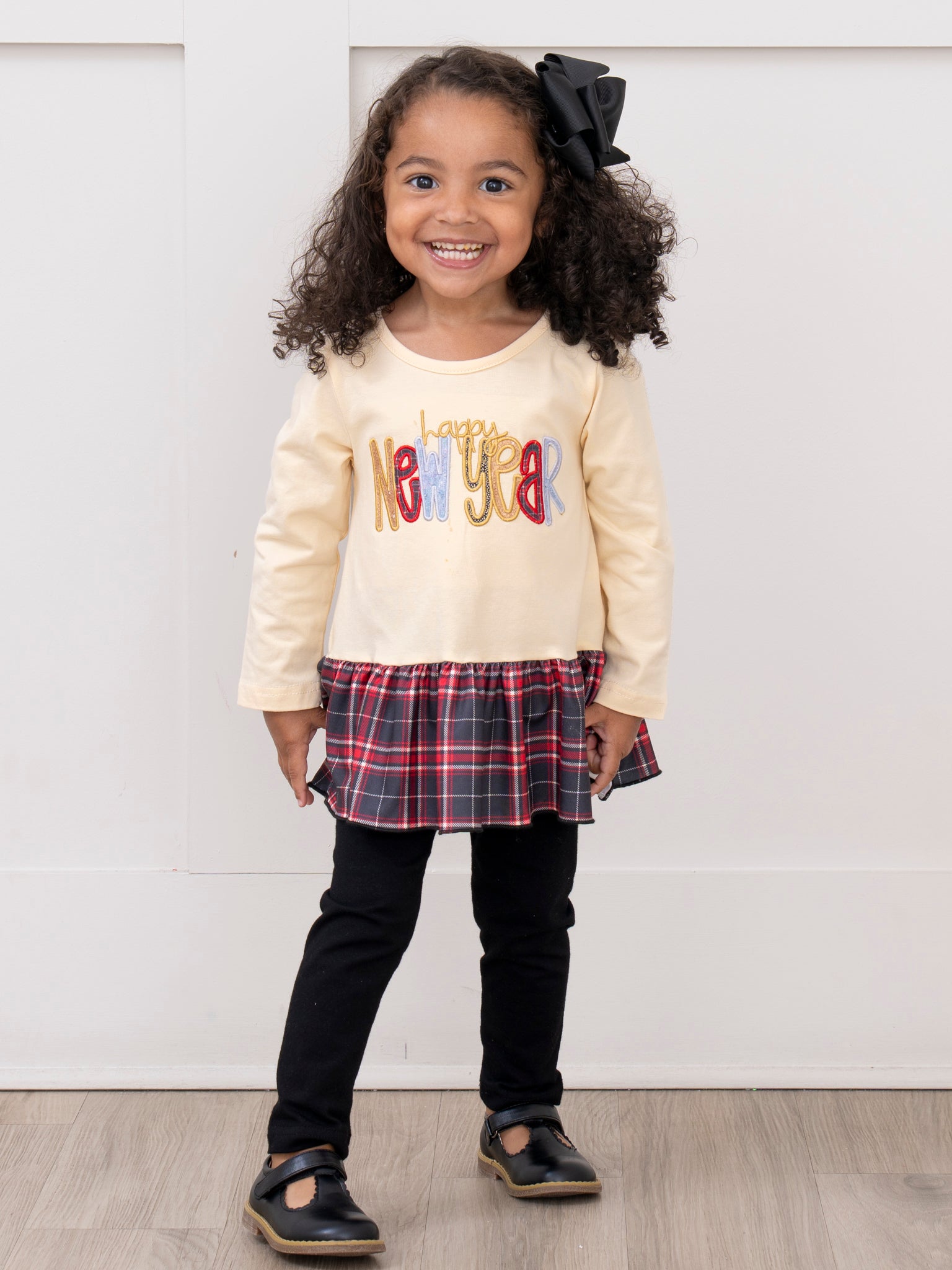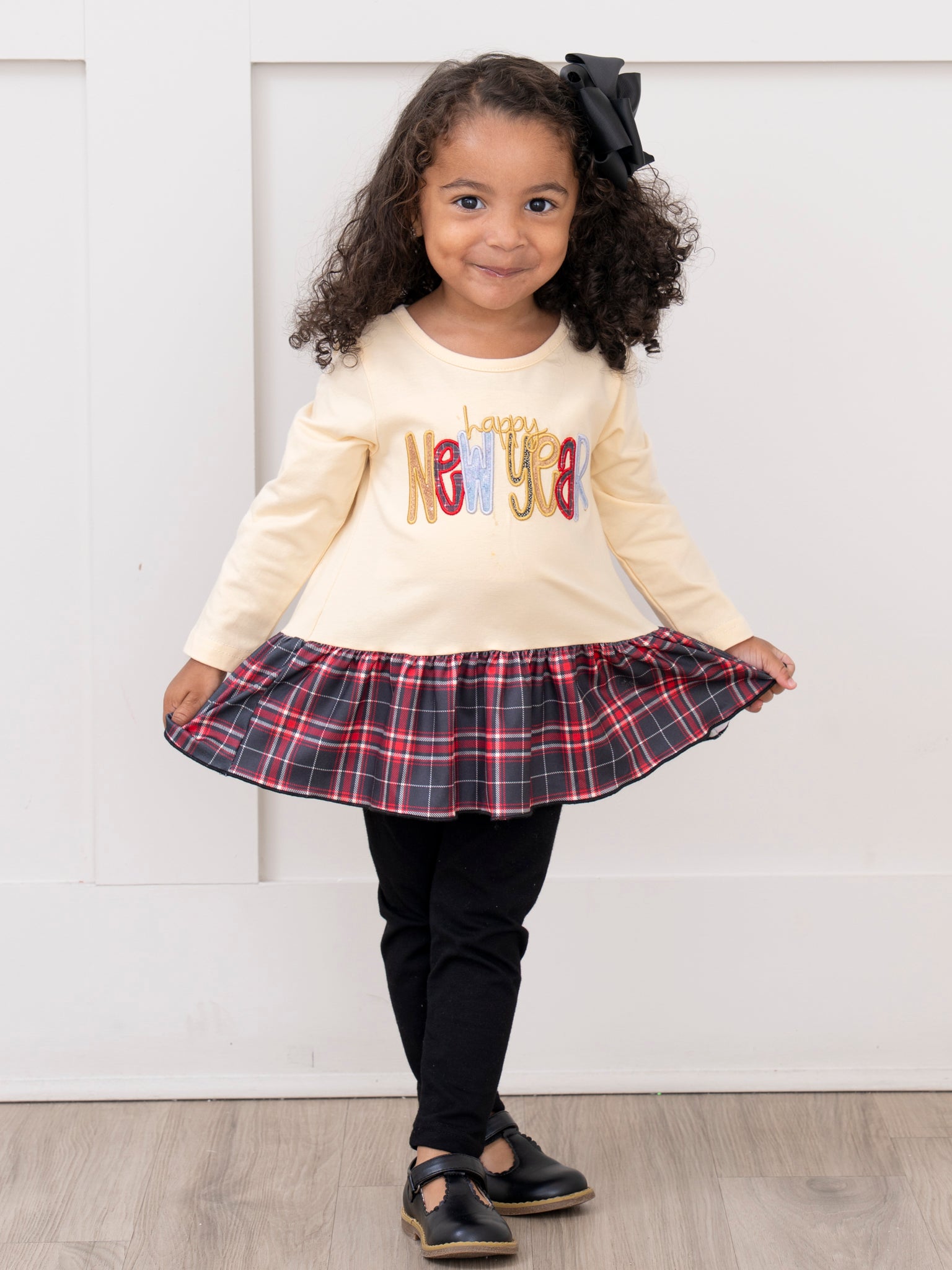 The "Happy New Year" Plaid Embroidered Outfit by Marie Nicole features a long-sleeve tunic top with playful “Happy New Year” embroidery and a flared plaid hem, paired with comfortable solid leggings. This festive set is perfect for ringing in the celebration with cheerful detail and all-day comfort