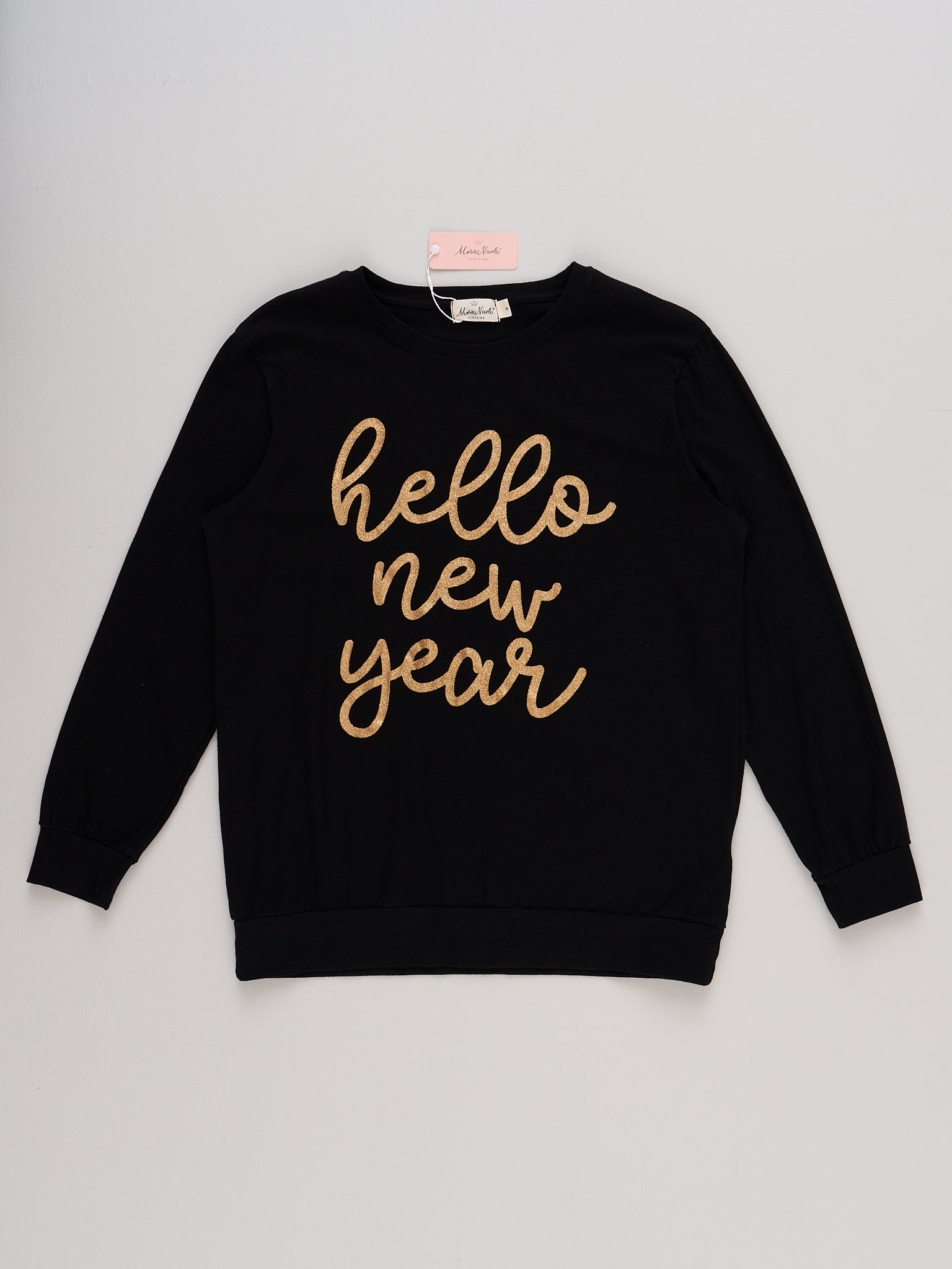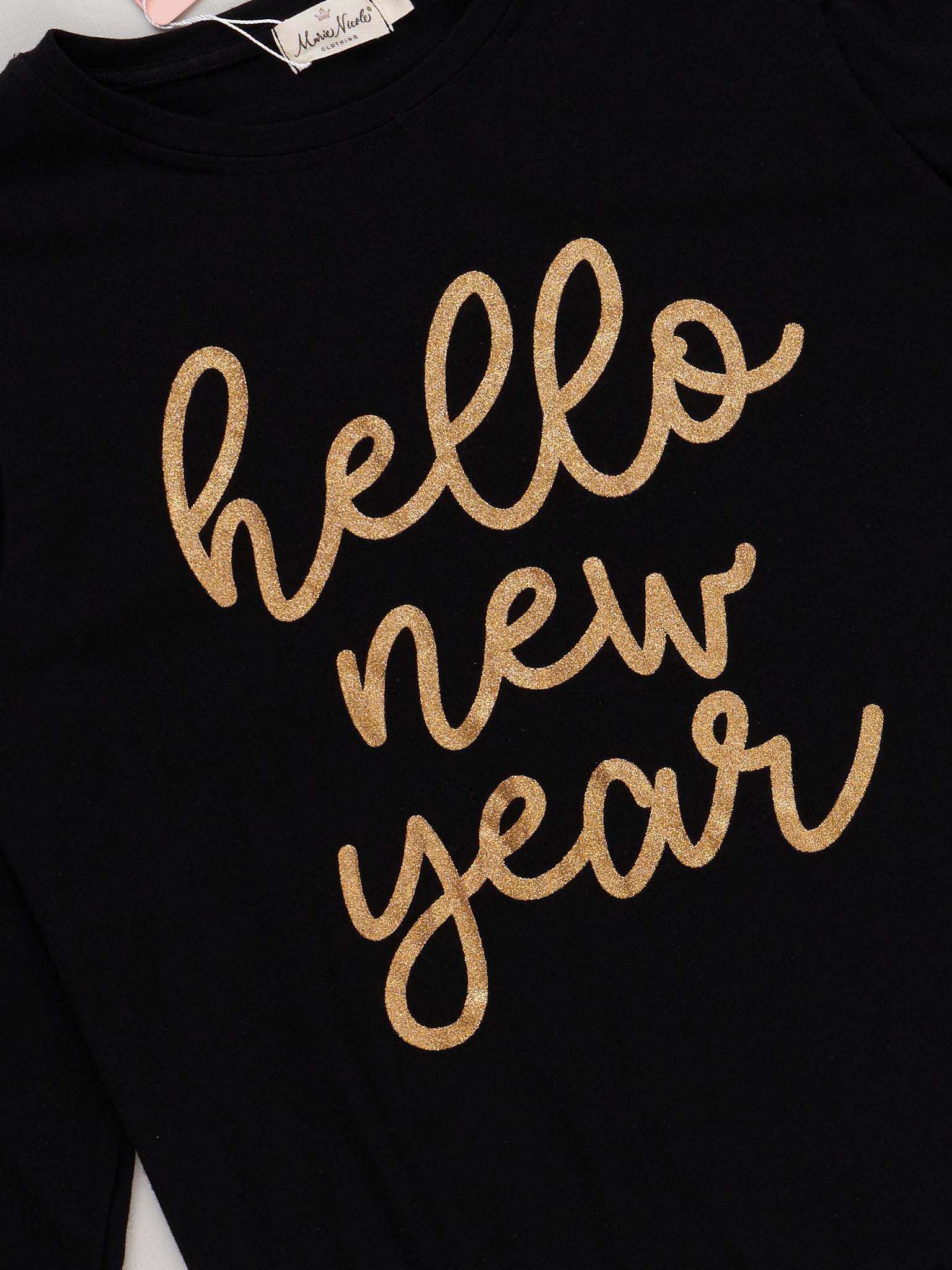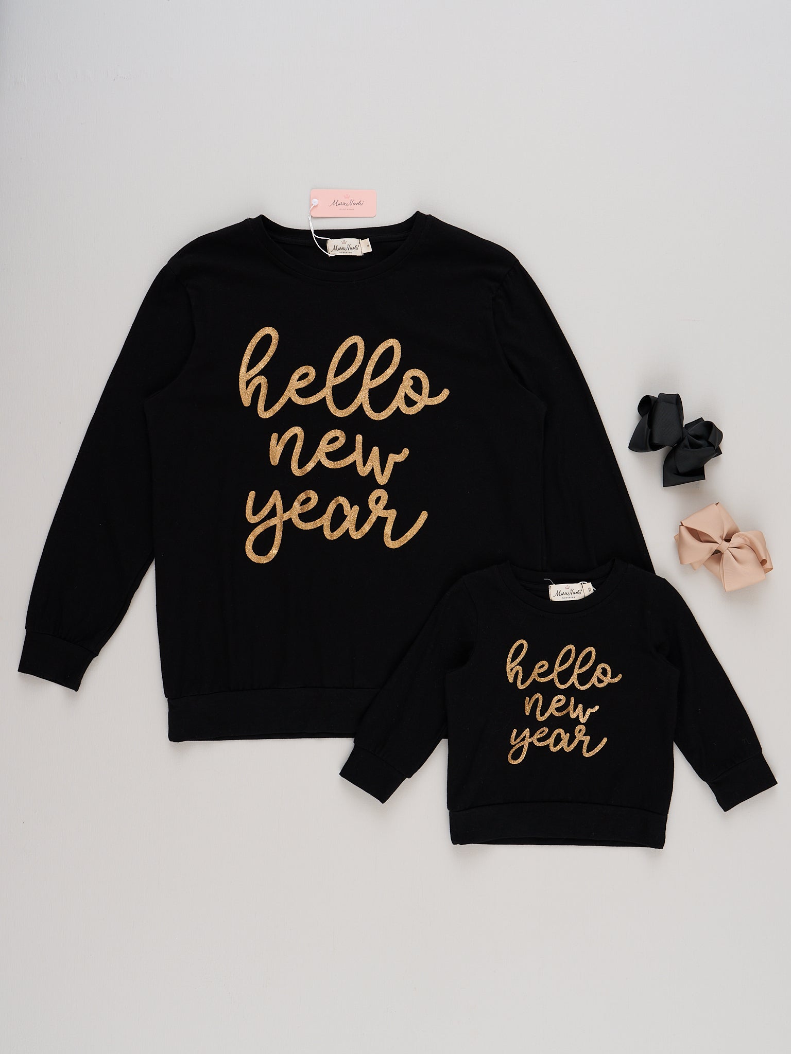 The Mom & Me "Hello New Year" Glitter Top by Marie Nicole Clothing features a festive scripted "hello new year" message on a cozy, comfortable fabric with glitter detailing. This top is ideal for ringing in the new year at celebrations, parties, or simply marking the occasion with a touch of sparkle. As a Mom & Me set, you can even match with your daughter!