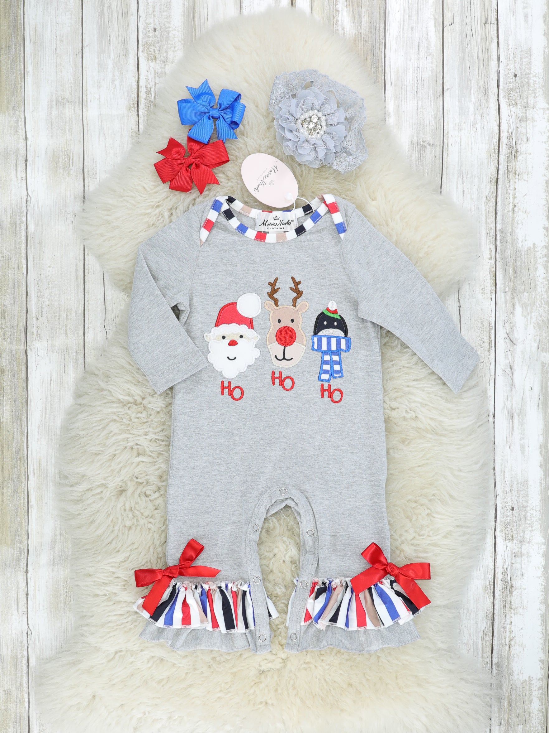 "HO HO HO" Striped Ruffle Romper