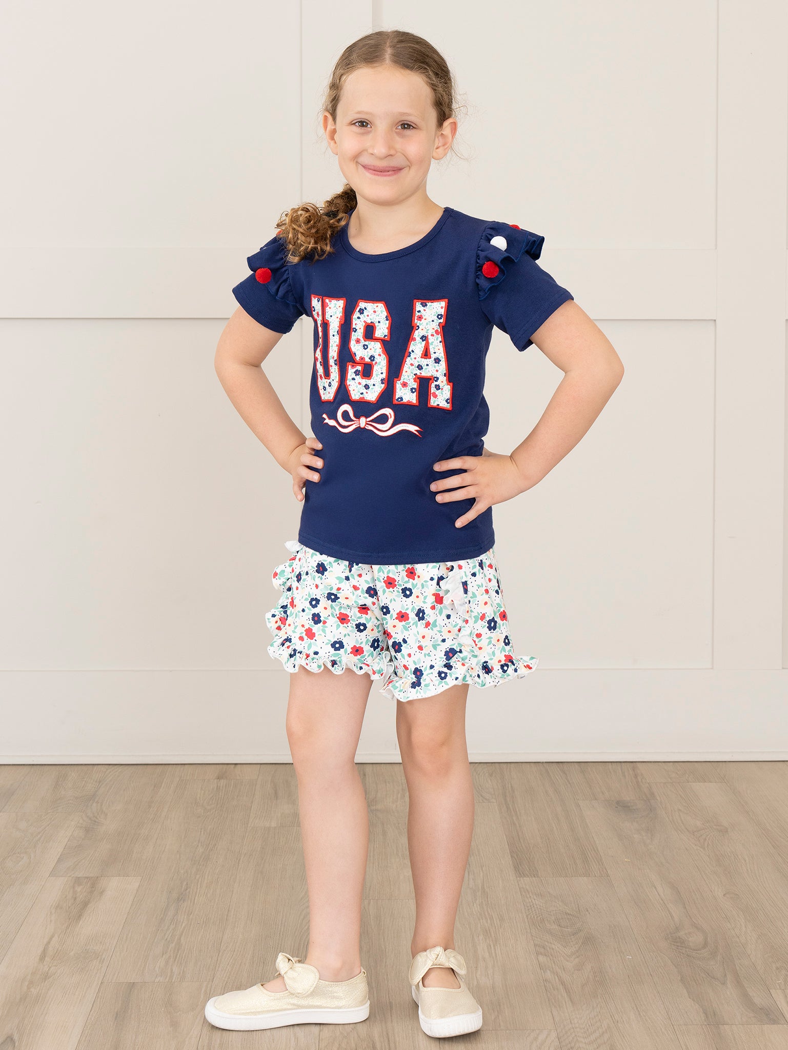 Dress your little lady in the USA Garden Ruffle Outfit by Marie Nicole Clothing for a fun, patriotic look. This adorable sister set includes a navy blue top with embroidered floral USA and floral ruffle shorts. Perfect for Fourth of July celebrations and summer days in the sun!
