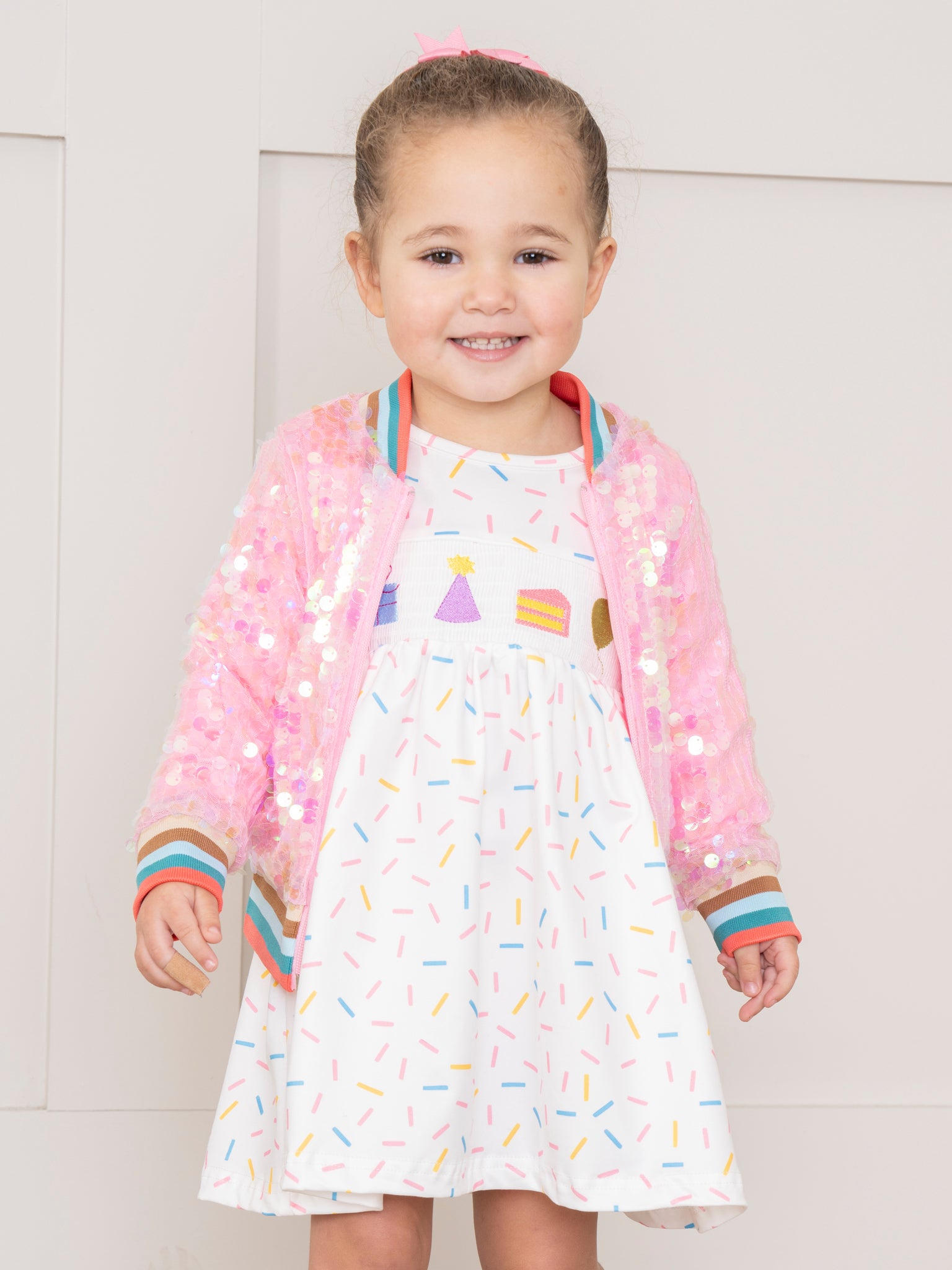 Celebrate in style with our Birthday Sprinkles Smocked Ruffle Dress! This playful girls dress features adorable pink shoulder ruffles and embroidered birthday decorations over smocking. The fun sprinkles print adds a touch of whimsy, perfect for a birthday party. Don't forget to check out the sister set for even more birthday fun!