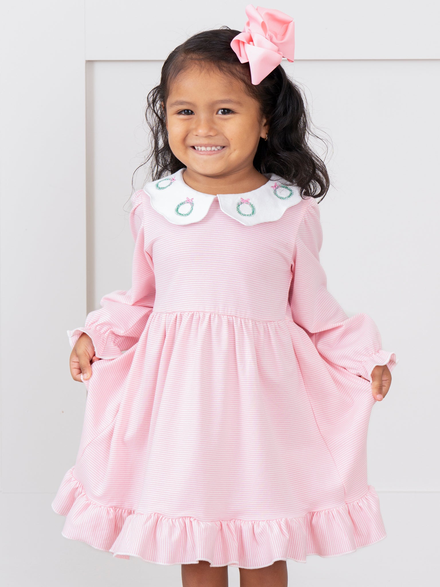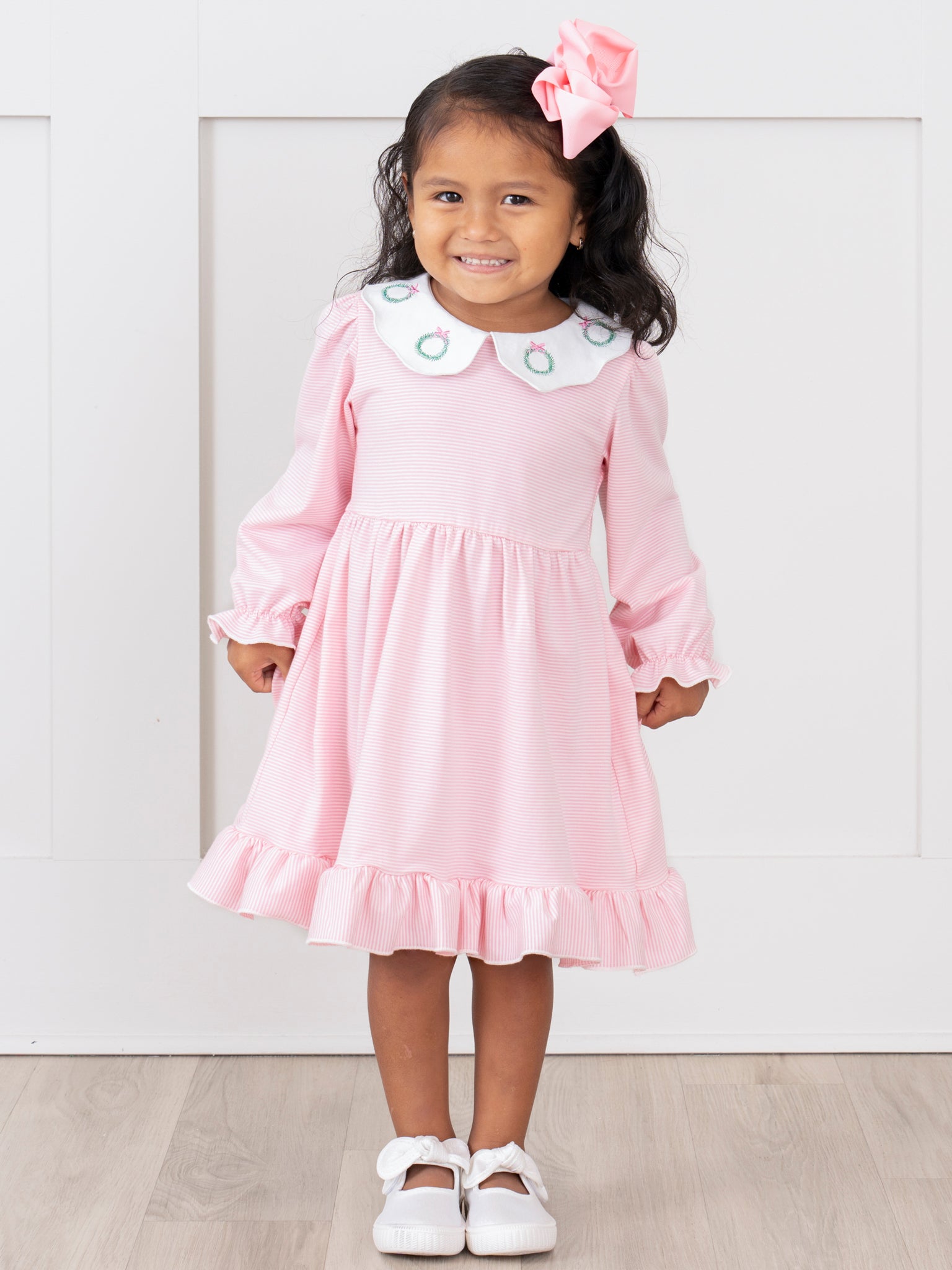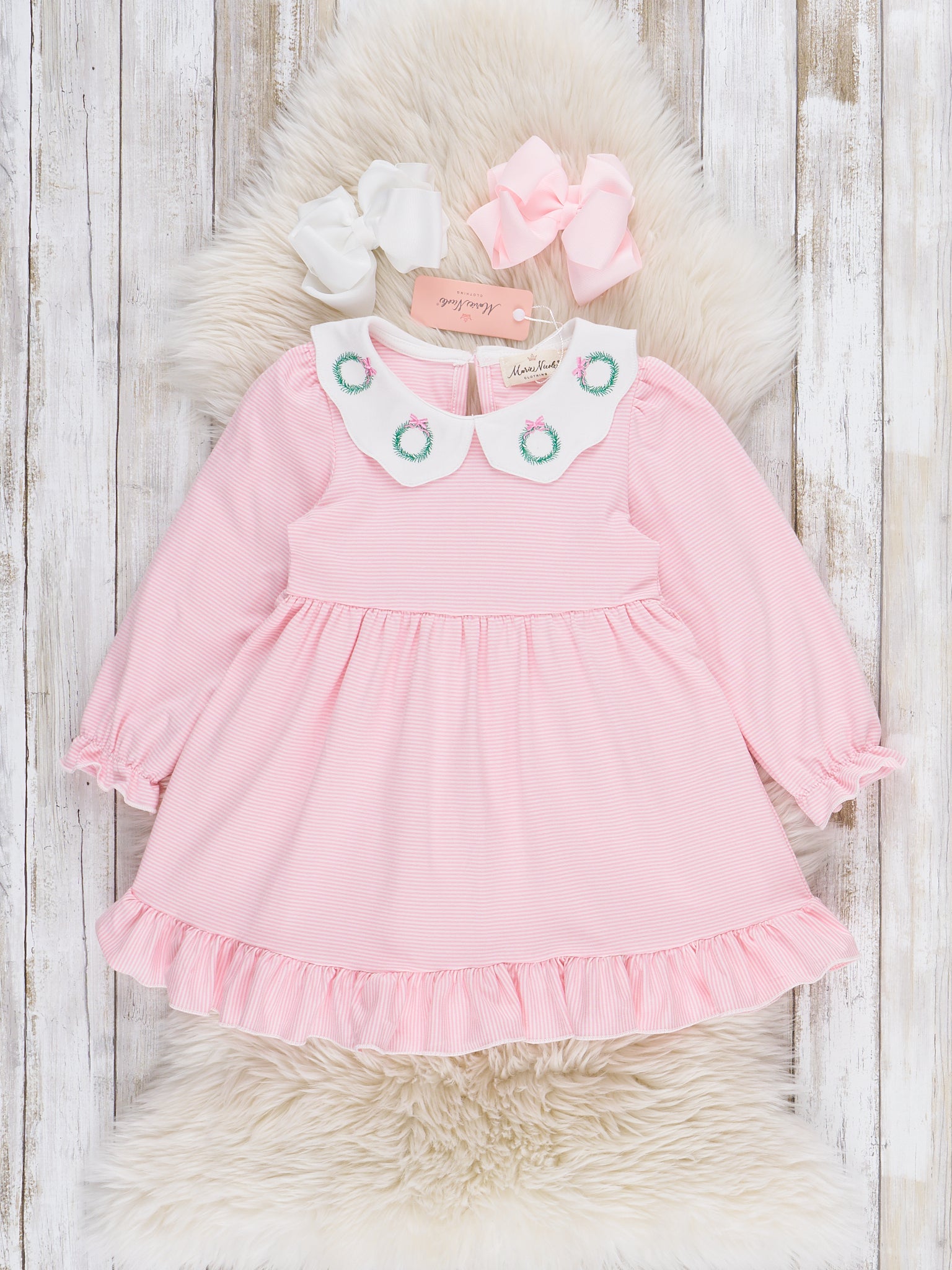 Get your little girl in the festive spirit with our Pink Holiday Wreath Scallop Collar Dress! This adorable girls dress is made of soft fabric with pink stripes and features embroidered holiday wreaths on a unique scallop style collar. Perfect for Christmas, this dress also has a cute blow sleeve detail, ruffle hem and perfectly pairs with our matching sister set.